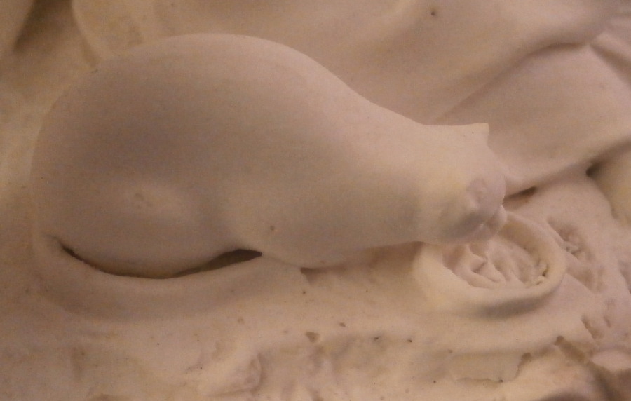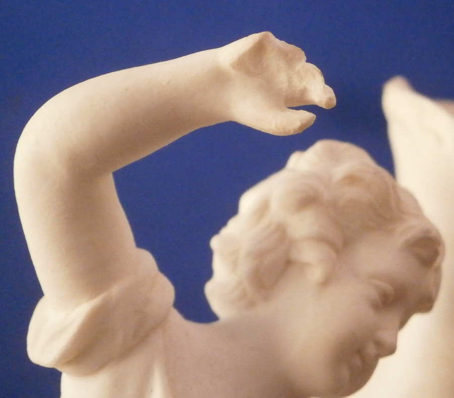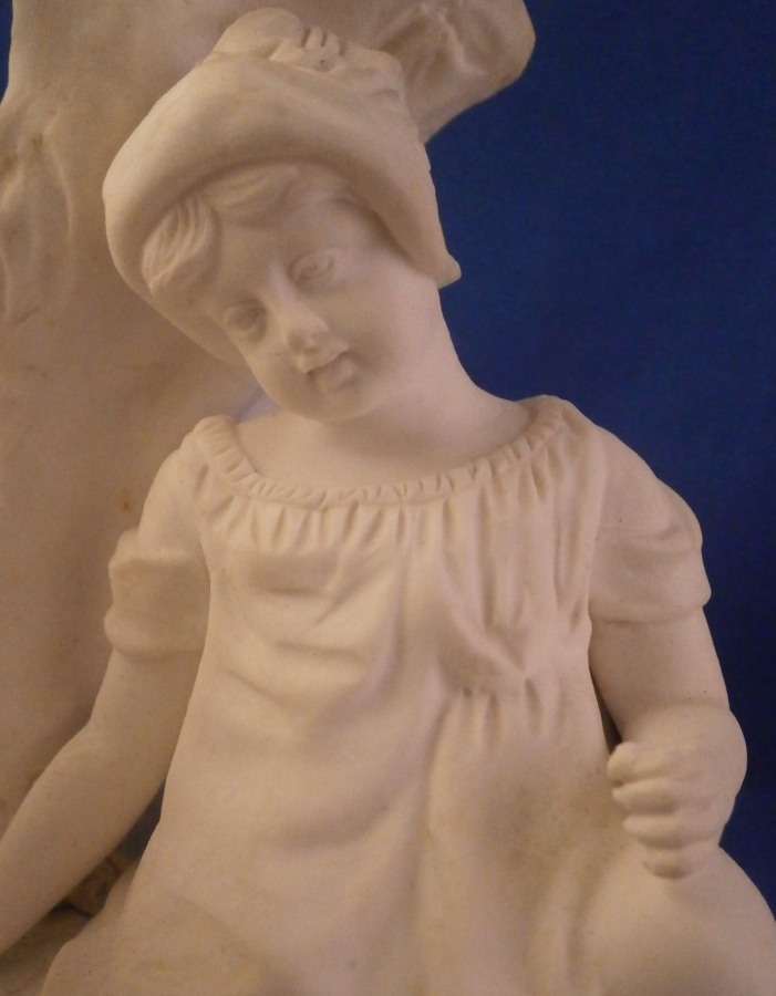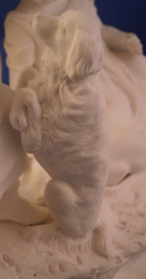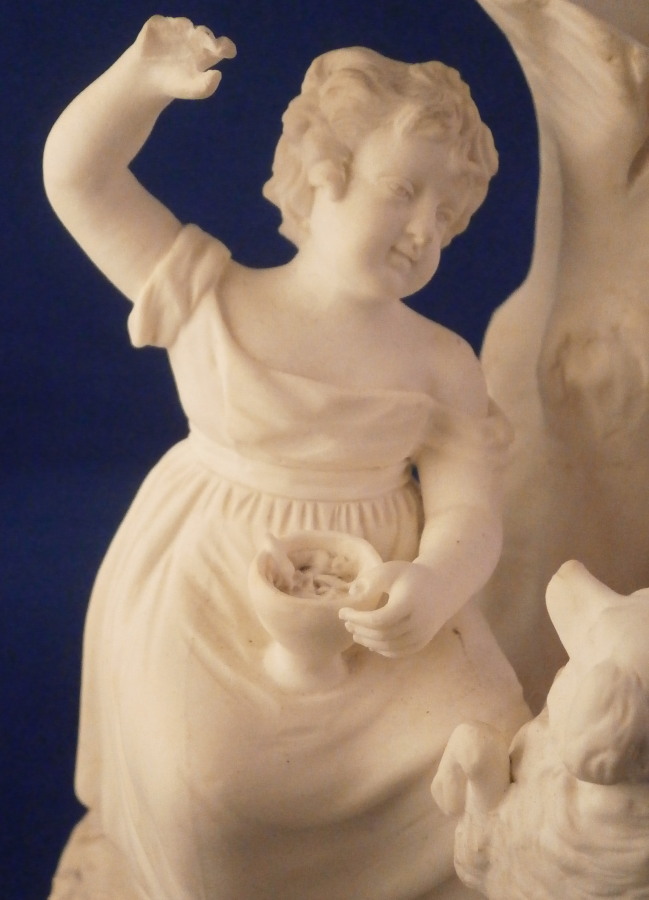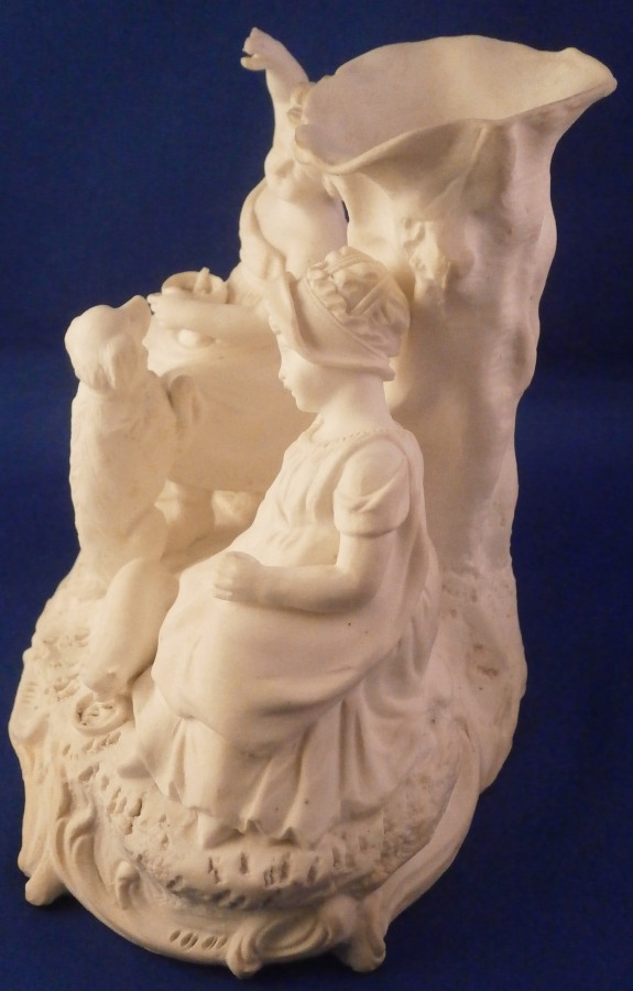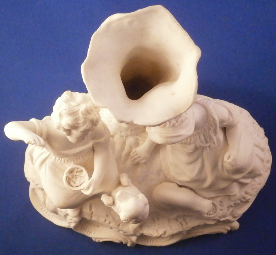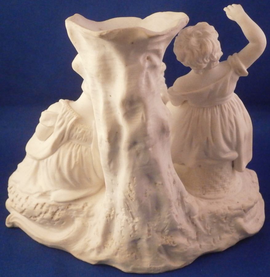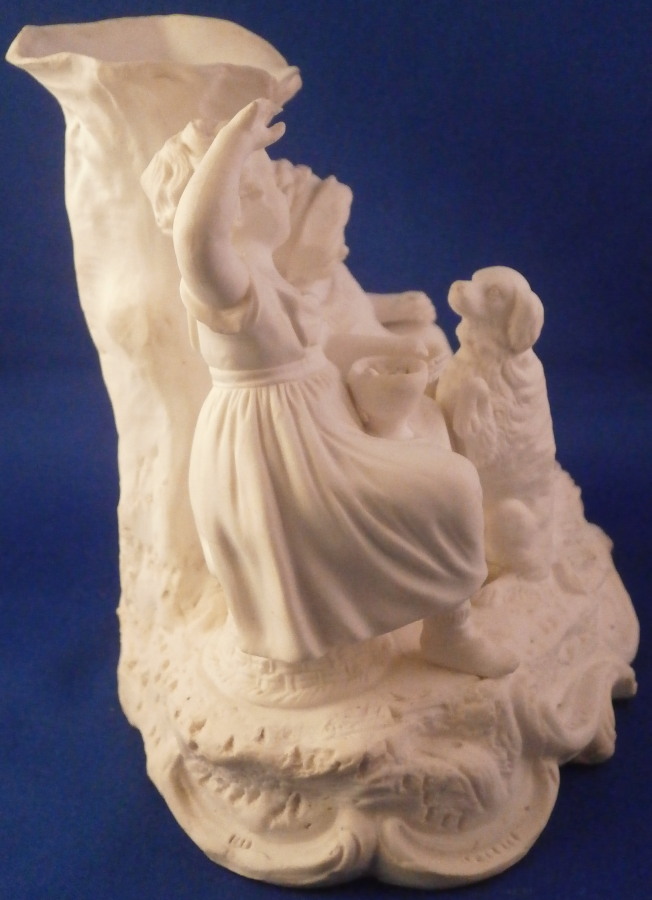 This is a great bisquit / unglazed porcelain figural spill vase most likely made by Minton in the 19th century. It is a figure of two girls with their two pets. The girls are sitting on a nice base with some scrolls to the edge and a vase in the back in the shape of a tree trunk. The one girl has a bowl in her lap with the dog sitting on its hind legs in front of her begging. The other girl is leaning on the tree trunk with the cat in front of her eating out of a bowl. The figurine is superbly modeled with lots of detail which is only made better by it being unglazed since the glaze usually hides some of the minute details. The piece e is in great condition with some staining typical of this type of ware, the top hand of the girl on the left is chipped, the right ear of the cat is chipped and I think the girl by the cat was holding something in her left hand. A firing flaw to the underside edge as shown. None of these issues are obvious and the piece displays superbly! The figurine is just under 5 inches tall, 5.75 inches wide and 4 inches deep. The base is not marked but there are few makers that could have made a piece of this quality in this style. Please email me for more information or other pictures.