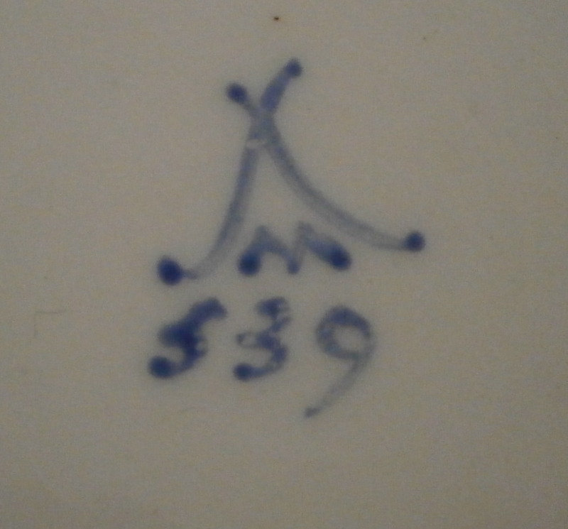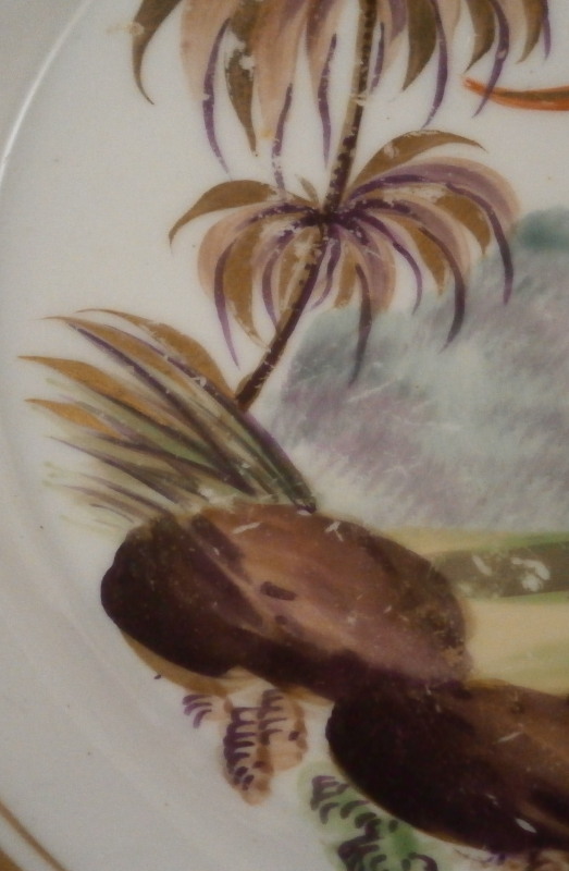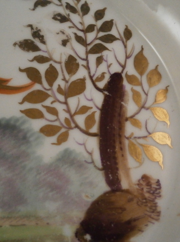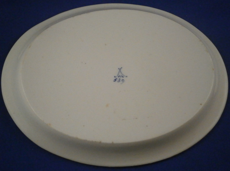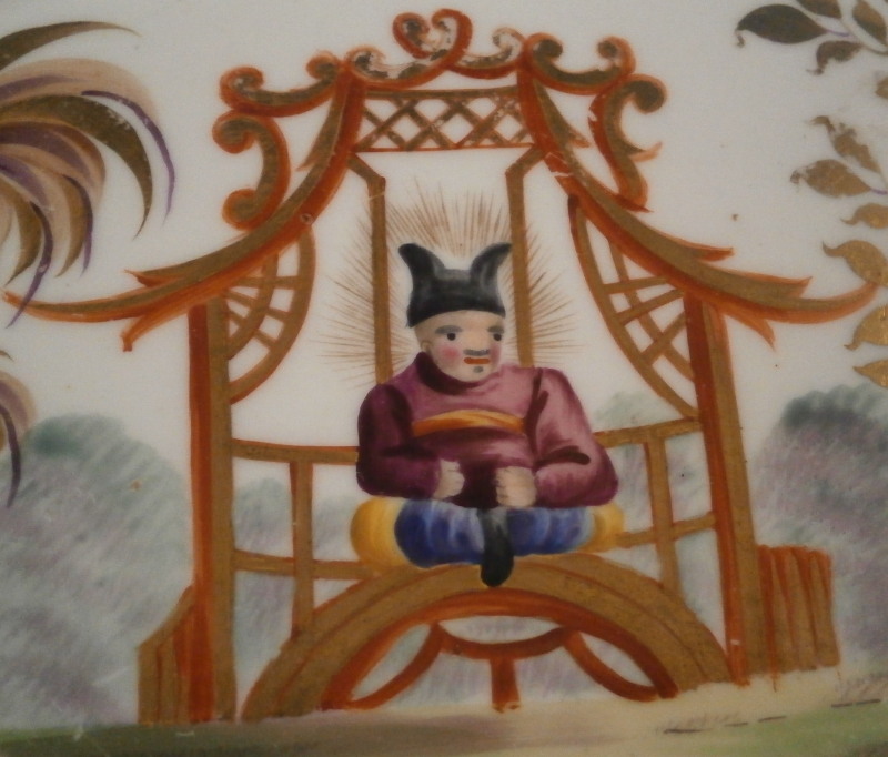 This is a fun teapot stand made by Minton in about 1805. It is handpainted with a nice chinoiserie design with the central figure sitting in some sort of gazebo surrounded by a nice landscape. Gold trim to the edge. A very well known design for this maker from their earliest days however a very ahrd to find piece from this service. The dish is 7.125 inches wide, 5.5 inches deep and 0.625 inches tall. The tea pot stand is in great condition with a little bit of use wear as shown. It is marked underneath with their earliest mark reminiscent of the Meissen crossed swords or Sevres mark with the letter M under it and the model number 539. Please email me for more information or other pictures.