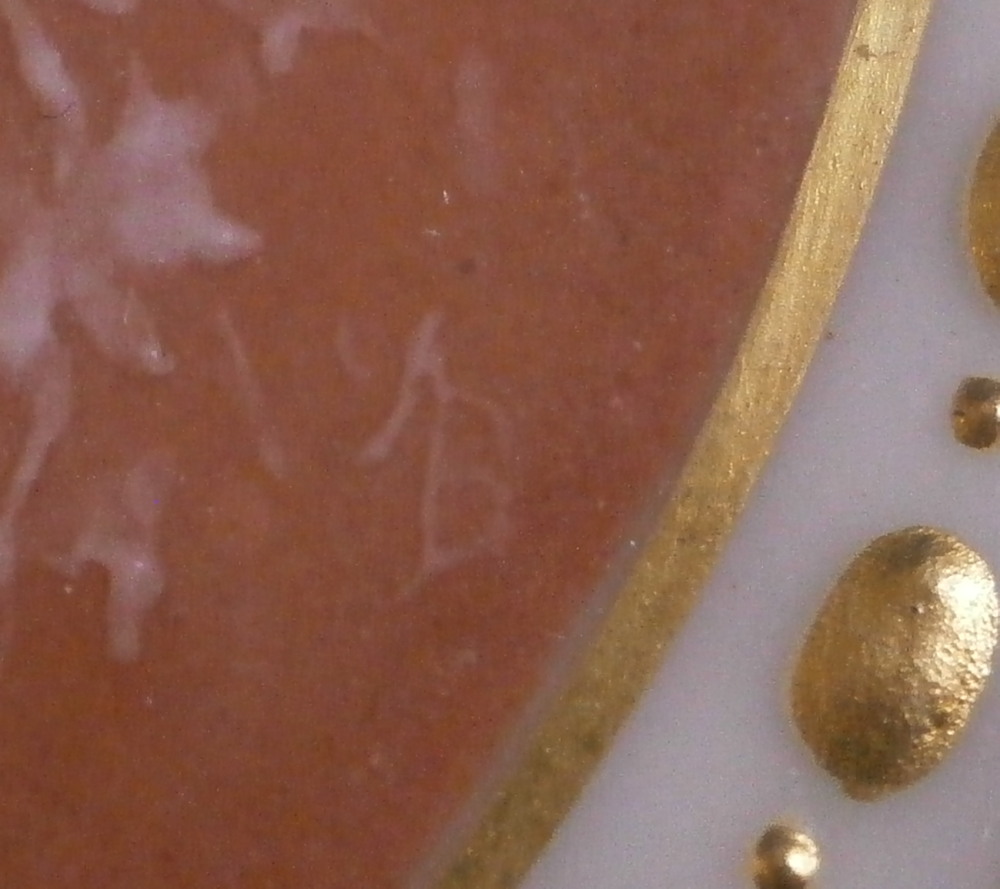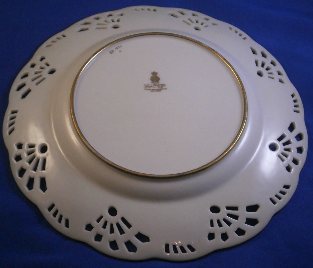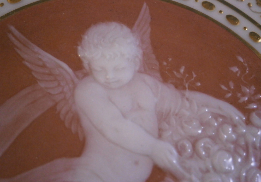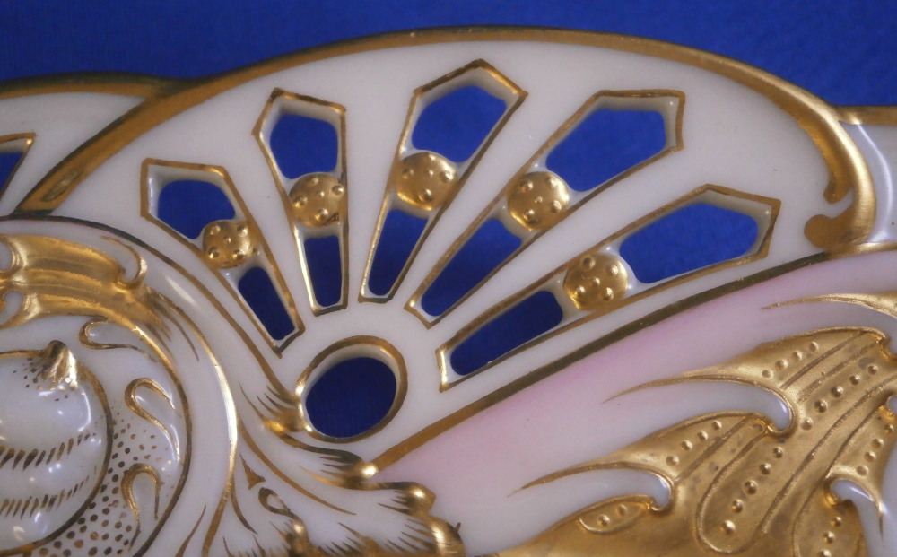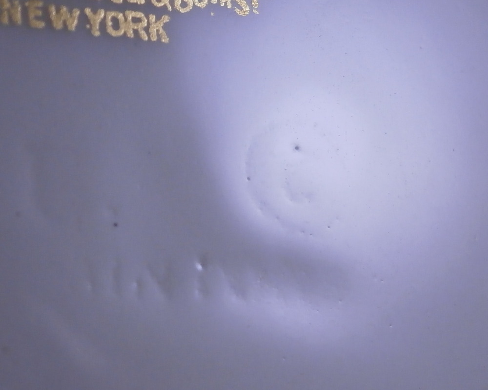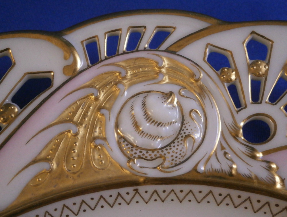 This is a really superb plate made by Mintons in the early 20th century - 1902 if I read the date code correctly. The rim of the plate is nicely reticulated with lots of gold highlights to it. Sort of a fan shaped design with a wave and seashell design below that. Quite detailed and with the cut out sections plus relief and gold details quite a superb look! The edge of the well has a gold ziczac and dot design to it but off course the best part is the central pate sur pate design. It has a circular panel of a reddish ground color with the white pate-sur-pate angel / cherub over that. The angel has a flowing cloth around it and is holding a large bouqet of flowers in front of it. The quality of the pate sur pate design is superb! There is a fancy gold trim around the scene with raised details to it. As nice a plate as they come! The pate-sur-pate scene was painted by Albion Birks, a student of the famous Marc Louis Solon . It is faintly signed AB under the bottom of the lower right flower. The plate is of a nice size being 0.875 inches tall and 9 inches in diameter. It is in perfect condition! It is marked underneath with impressed Mintons as well as their typical date cyphers - in this case a number 2 in a circle plus a gold N.P 1226 and tent mark in gold. It also has the gold globe with Mintons in the center and the crown above plus the retailers mark for Gilman Collamore & Co New York. Fifth Avenue and 30th street. They were rivals to Tiffany & Co.. Please email me for more information or other pictures.