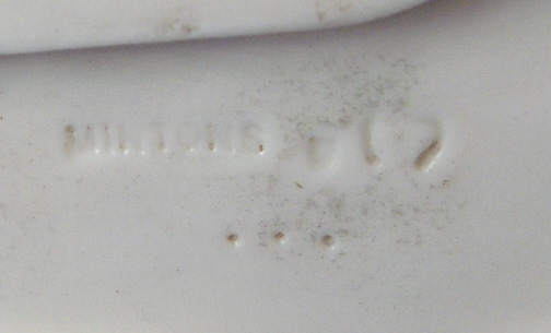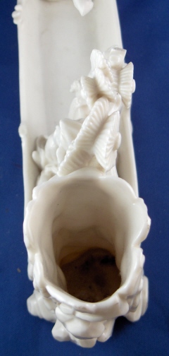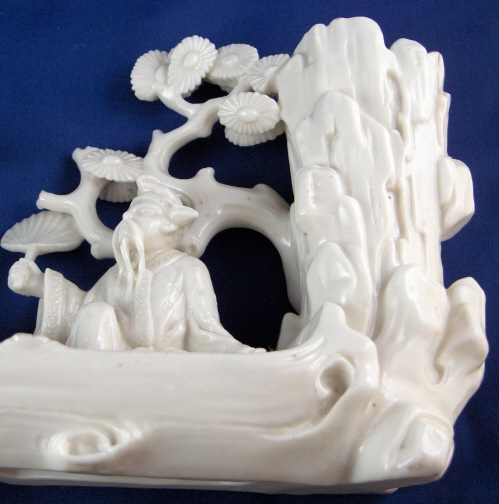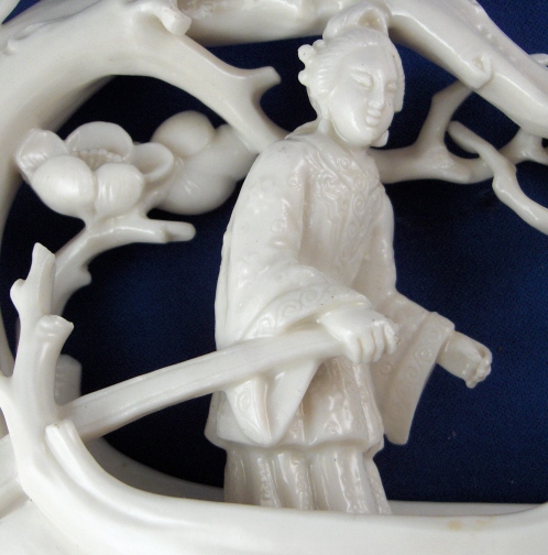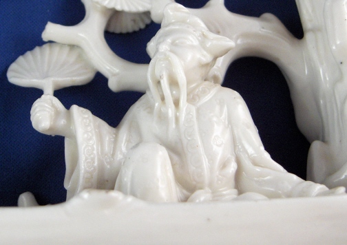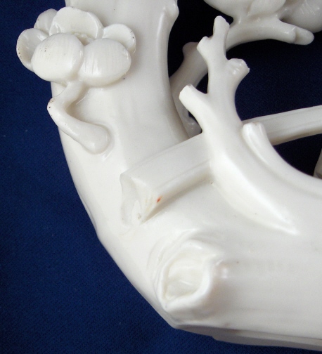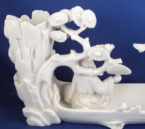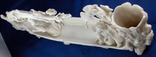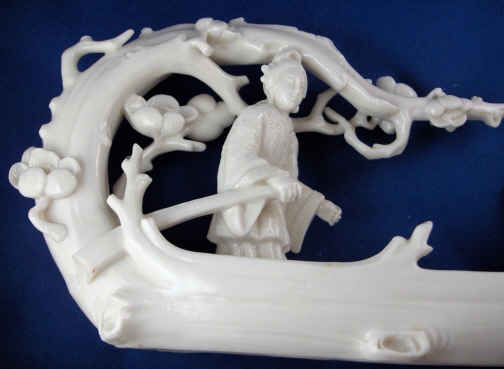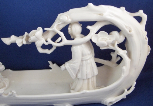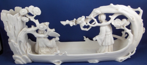 This is a very rare blanc de chine figurine made by Minton in the mid 19th century. The date code is very hard to see clearly so I am unsure which one it is! This piece called the Japanese Boat was modelled by John Henk as two Asian figures in a tree stem boat with the lady standing while operating the rudder and the gentleman sitting down and cooling himself with a fan. The one end of the boat has a hollow tree stem which off course can be used as a spill vase. A prunus tree growing from the lady's end finishes off this superb piece! The figurine is 13 inches long, 2 inches deep and 5.5 inches tall. It is marked underneath with the impressed Mintons mark, three dots and a hard to figure out other mark which is the date code most likely. The back of the boat has J. Henk impressed which is off course the modeller John Henk. An amazing piece that is in pretty good condition considering all the details. The end of the rudder is broken off, there is a meaningless chip to a rpunus blossom petal and the area where the prunus and pine trees meet has the ends of either tree missing. It displays superbly and is a fun piece to look at for sure! Please email me for more information or other pictures.