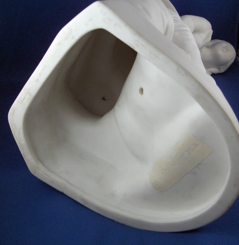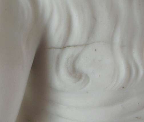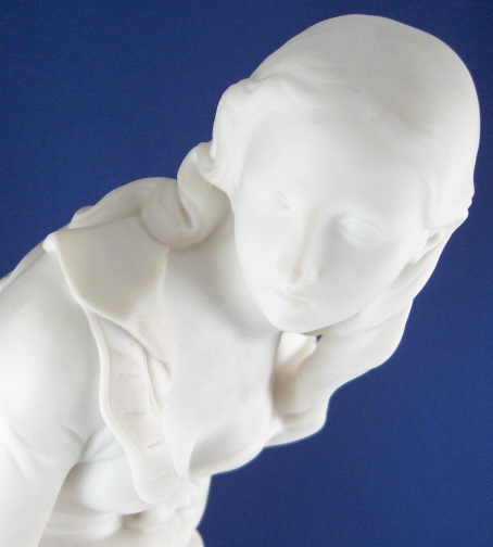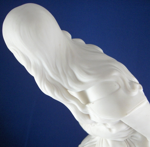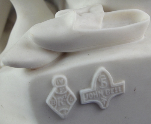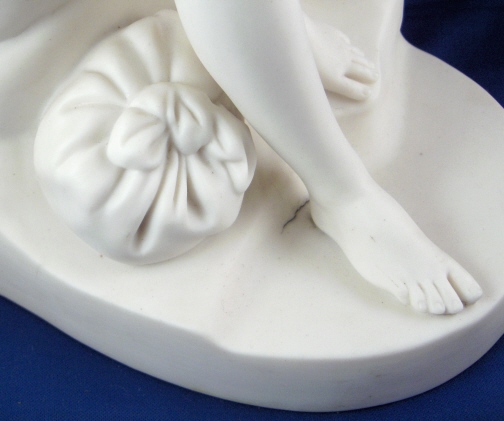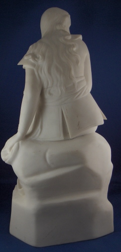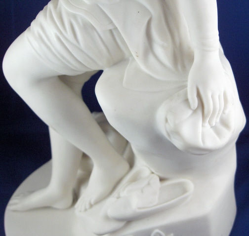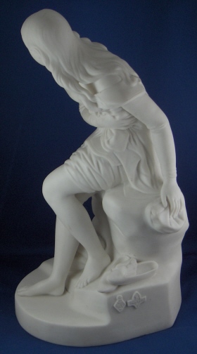 This is a parian ware figurine made by Minton in 1847 as far as I can tell from the English registry mark so from the original year when it was first modled which is a treat! It is a seated Dorothea on a rock with a travel satchel and shoes by her feet. The piece was created by the famous modeleur John Bell in 1847. The figurine is superbly modeled with lots of detail. A truly amazing figurine and I have her sister figurine Clorinda as well from its original year. The figurine is in great condition with on firing crack behind her right foot, one under her butt in the back and on by her left elbow in her back. A tiny meaningless chip on the bottom base likely starting from a small firing flaw by the look of things. A little dirt here and there which is normal on these pieces! She is 13.75 inches tall, 6.5 inches wide and 7.375 inches deep. The base is marked with the raised English registry mark as well as John Bell's mark on the side by her shoes. Please email me for more information or other pictures.