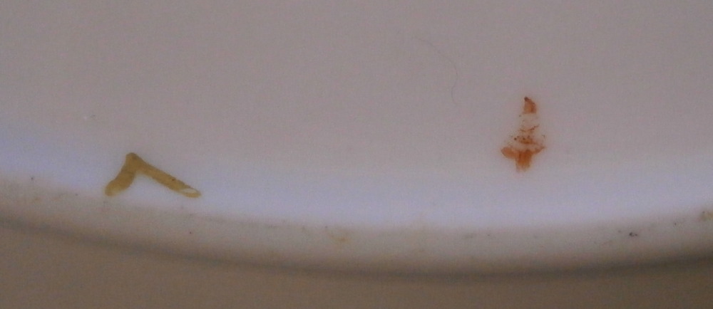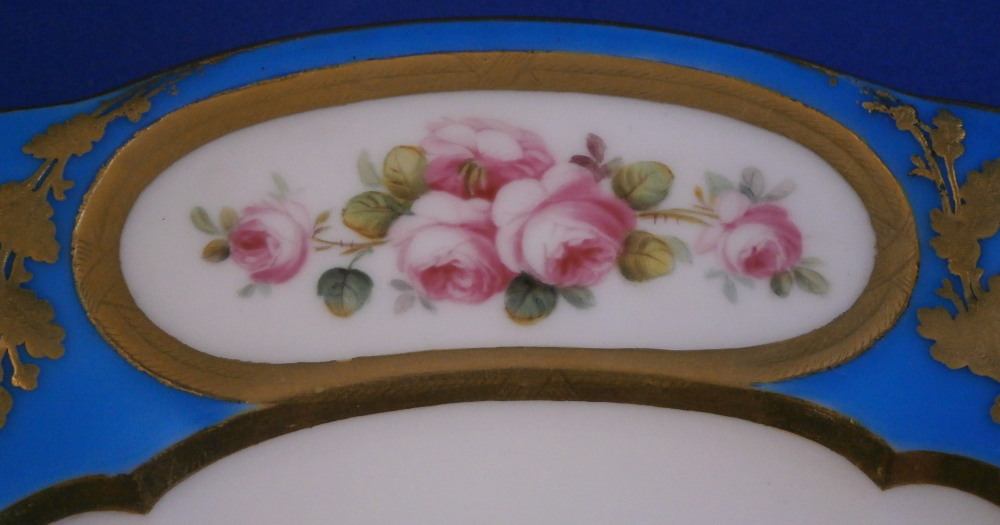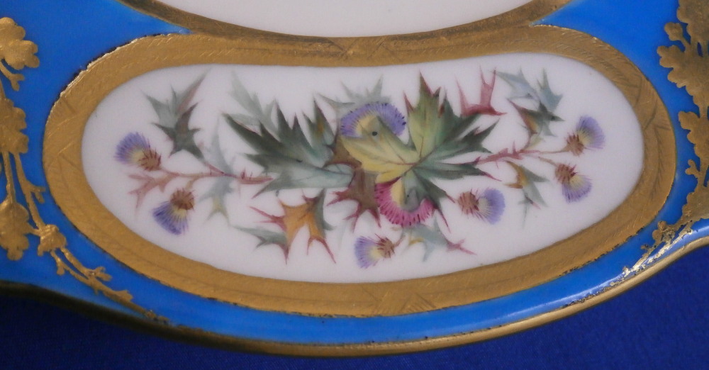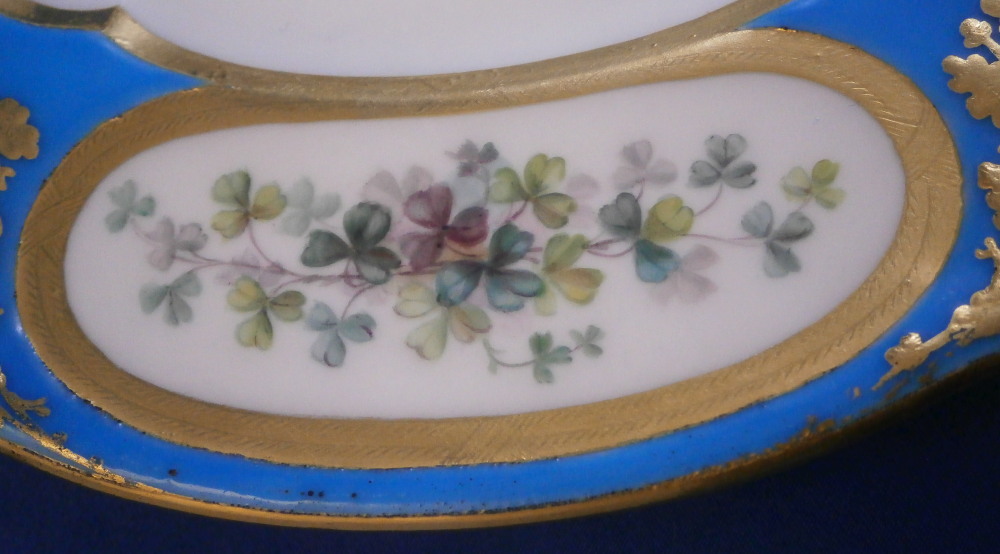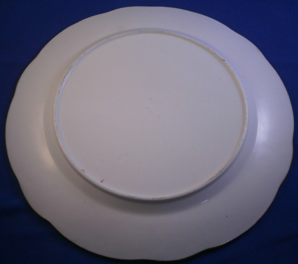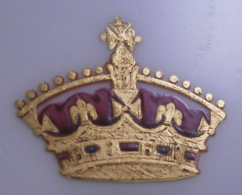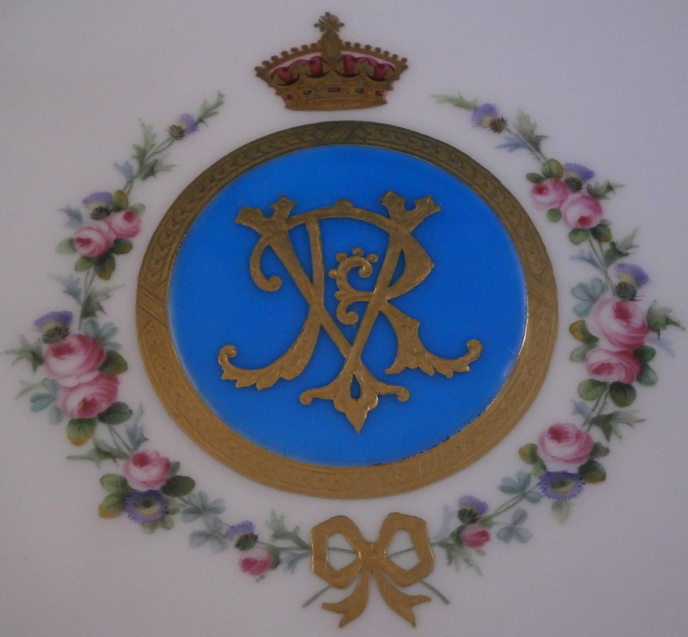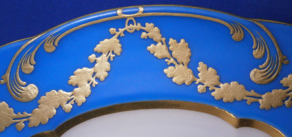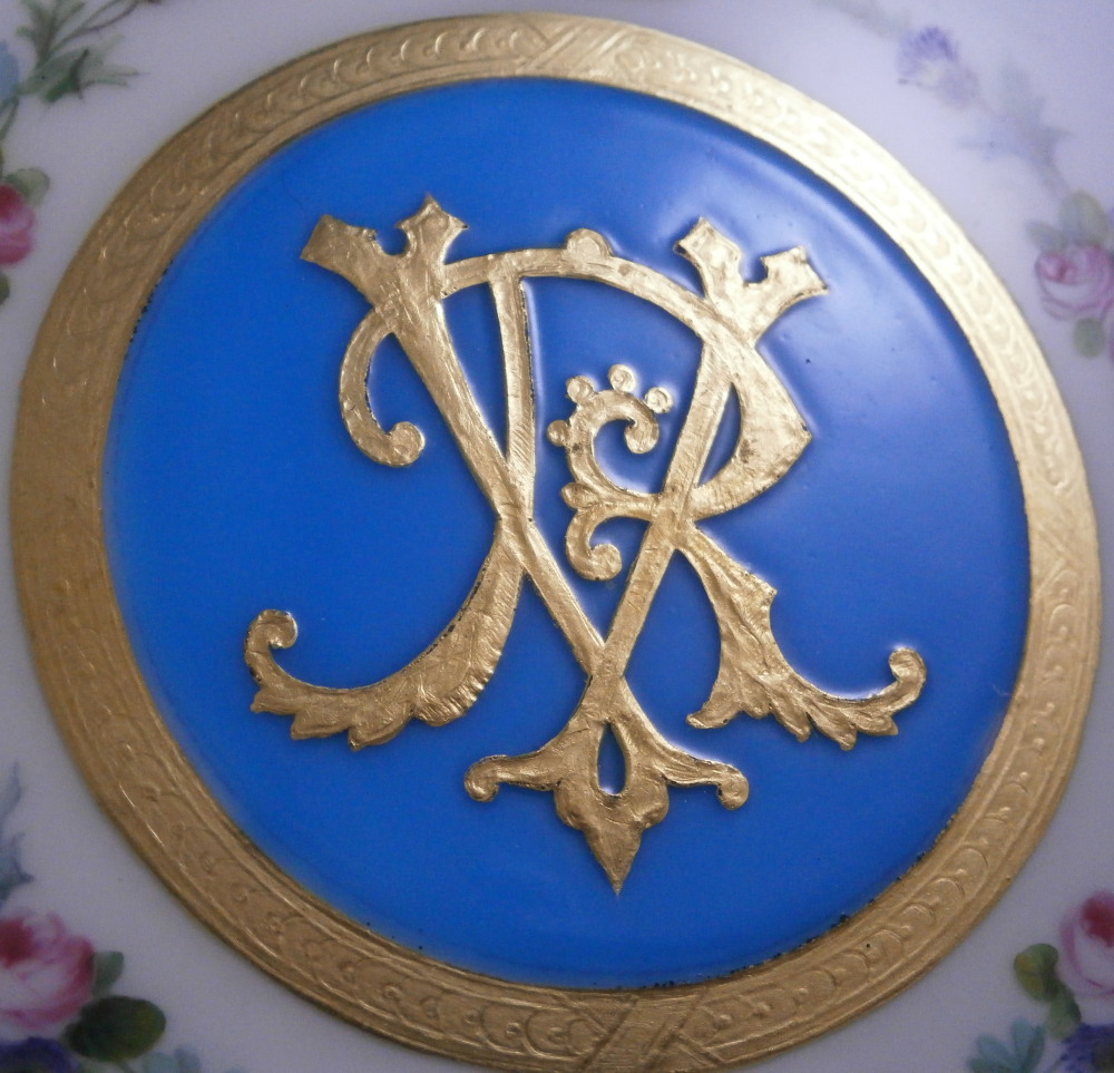 This is a superb and very rare plate made by Minton in 1877 according to the date code. Mintons was famous for this amazing turquoise ground color said to be as close as possible to the Sevres bleu celeste that is so amazing. This plate is quite rare as it is from the royal service of Queen Victoria which is just amazing. I could not find any for sale except some modern reproductions but did find exactly type of this plate in the royal collection with the same date. The service was a favorite of the Queen and is still used today to decorate the tables at state banquets! The plate is made of their famous bone china that is very white. It has a lobed edge with the rim having that superb turquoise ground color to it with three cartouches of national flowers - roses, clover and thistle hand painted on white ground. They are surrounded by a tooled gold trim with oak leaf garlands / swag in between. The best part however is the central design of the VR ( Victoria Regina ) monogram in gold on turquoise ground with a gold band around it, a superb crown above and a floral wreath with a gold bow around the central medallion. The entire piece is just amazing looking and it being a royal piece makes it even more special. It does not come much better than this! It looks stunning! The plate is 0.875 inches tall and 10 inches in diameter. It is in superb condition with just some very minor age marks. It displays perfectly! The plate is marked underneath with the impressed Mintons mark as well as the date code of a circle in a square plus some other impressed letters as well as painter's marks as shown. Please email me for more information or other pictures.