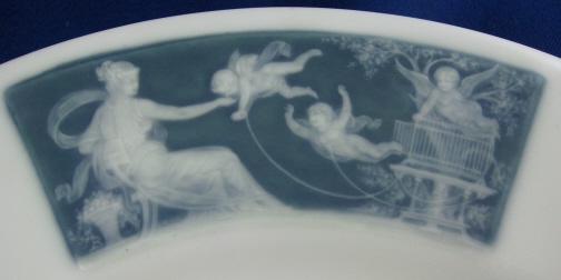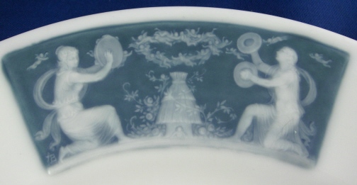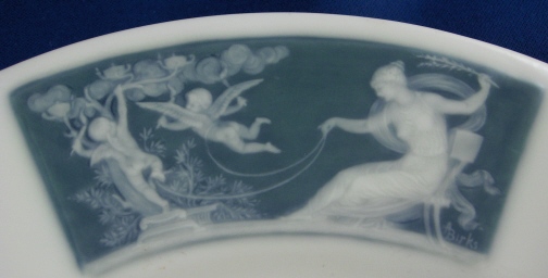 This is a second very detailed pate-sur-pate plate made by Mintons in the early 20th century though I am not sure since I cannot read the date code. It has three different scenic panels in the pate sur pate technique on the rim and is otherwise white which makes this one elegant plate! Each scene is very detailed with ladies with cherubs flying around in the raised white paste with a blueish background color. Each of these was painted by Albion Birks a student of the famous Marc Louis Solon . Two of the scenes are simply signed AB while one is signed A. Birks. The plate is of a nice size being 10.5 inches in diameter and it is in perfect condition with almost no wear at all and only some very fine and hard to spot crazing in spots typical of these plates. It is marked underneath with impressed Mintons as well as their typical date cyphers but they are hard to make out. I have two other matching plates as well. Please email me for more information or other pictures.