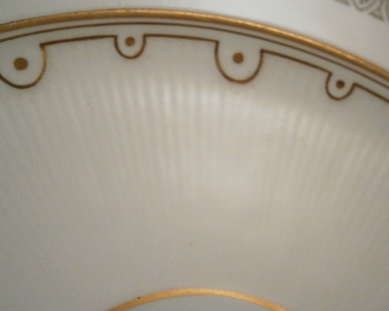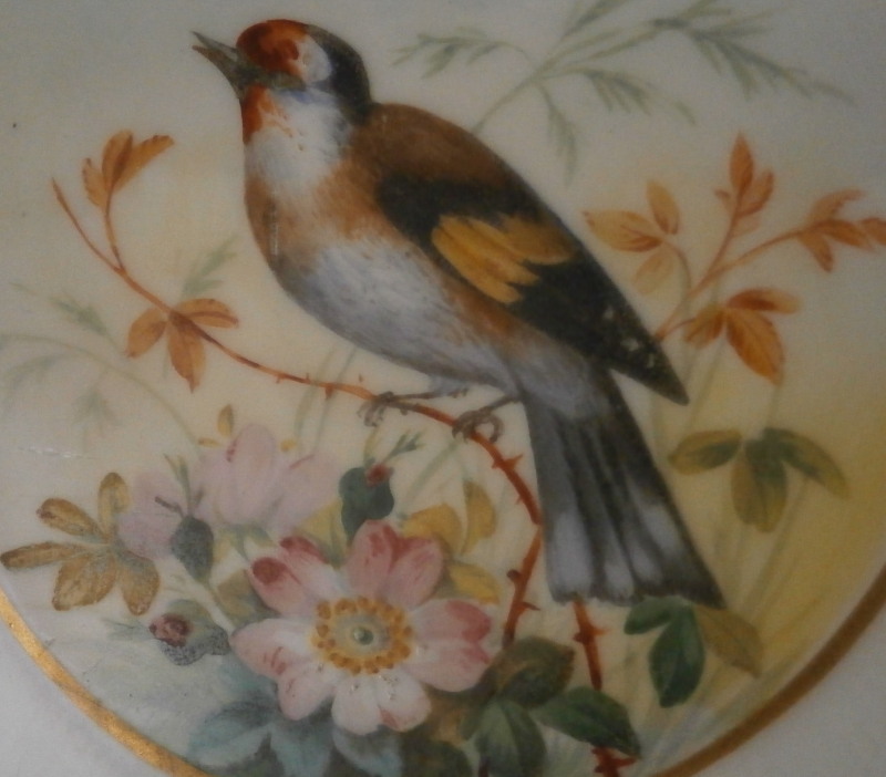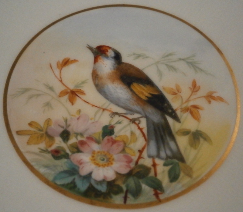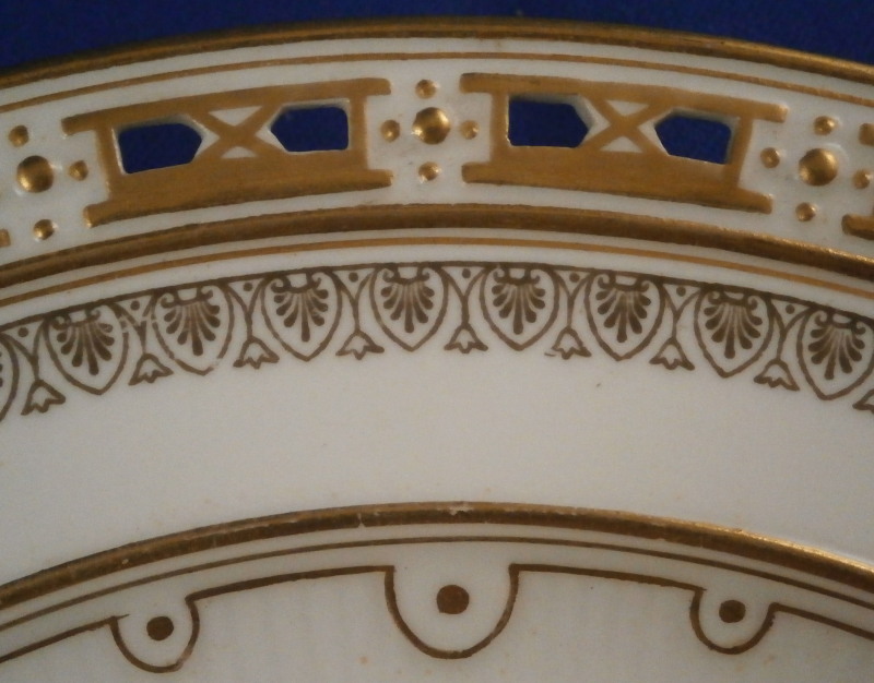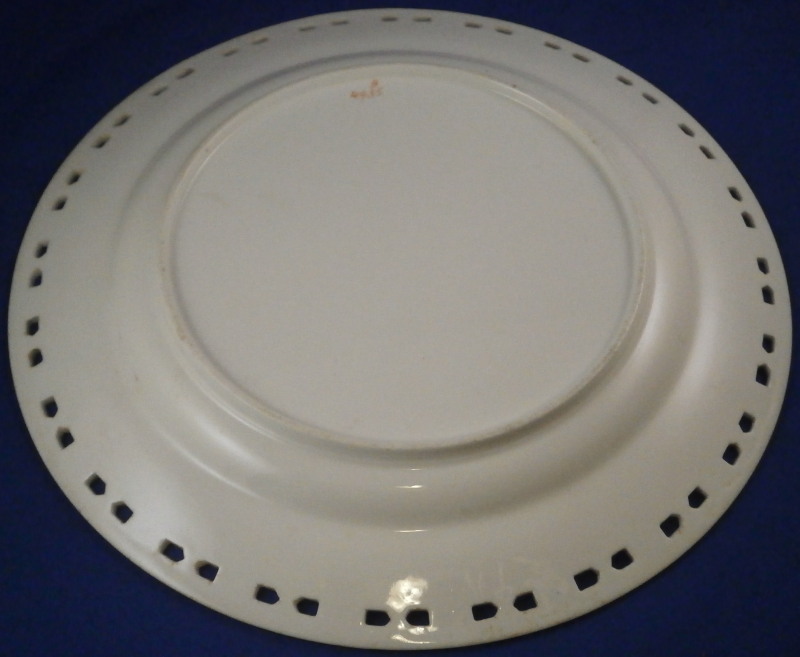This is a very nice plate made by Minton in the 19th century. The plate has a nice reticulated rim with lots of nice gilding to it, another gold design along the edge of the well, a ribbed design to most of the well and a superb hand painted bird scene in the center. A truly elegant plate, The central medallion is a bit raised from the rest of the well. The scene is of very nice quality with the bird surrounded by flowers and leaves. Sadly the scene is not signed. The plate is 9.125 inches in diameter and 0.875 inches tall. It is in great condition with some very minor wear. The piece is marked underneath with a red B over 4935 as shown. Please email me for more information or other pictures.