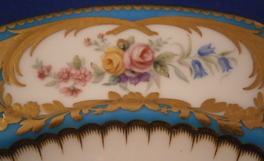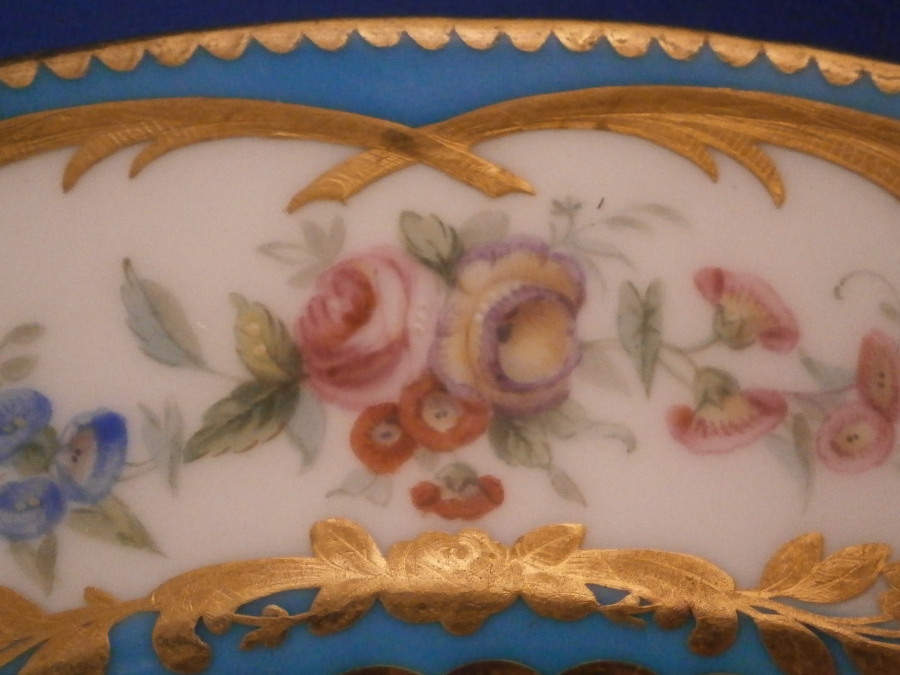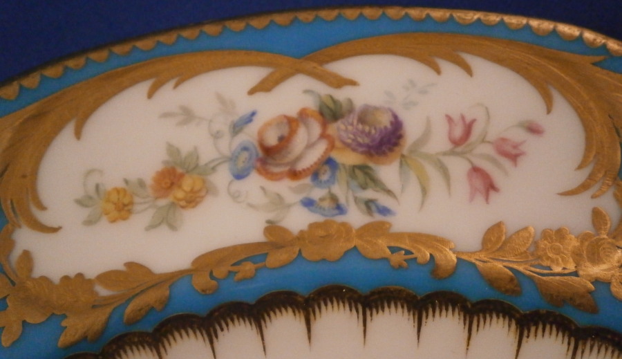 This is a superb plate made by Minton in 1860 according to the date code. This style of painting is usually attributed to Antonin Boullemier but the date code and ermine mark place this in a time period before he arrived at Mintons . Only way this was painted by him would be that it was painted after the blank was made but the ermine mark would have been added at the time of painting so it's a bit of a mystery. The style and execution is definitely fitting of him and I don't know of any other artist that painted in this style before him. Either way it is an amazing plate and might be a nice research tool for someone. The plate is hand painted with a scene in the center after Francois Boucher including a couple in a landscape surrounding. The gentleman has a set of bagpipes in his hands while the lady is holding a wreath and has a basket full of eggs under her arm. The edge of the well has a nice gold trim to it and the rim has their famous turquoise ground color to it with three cartouches of Sevres style flowers on white ground surrounded by raised and tooled gilding with gold leaf swag going across the turquoise ground to the next cartouche. Dentil gilding to the dge. Besides the original Sevres piece this is the next best thing. Amazing quality! One of the nicest plates I have seen by Minton! Just a great combination of colors and quality. It looks stunning! The plate is 1 inch tall and 9.625 inches in diameter. It is in superb condition with some very minor sratches which is common on these softer glaze pieces but it displays perfectly! It is marked underneath with the puce 'ermine' mark (1850-1870), impressed date code and other marks as shown, a puce c plus another puce mark that is likely a retailers mark though I have not seen this one before. These plates are really hard to find and it is just superb! Please email me for more information or other pictures.
