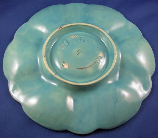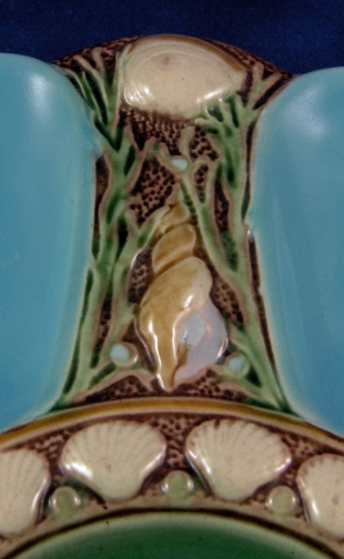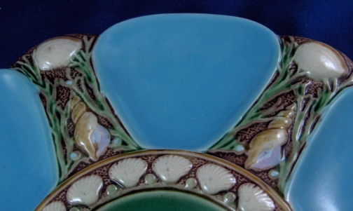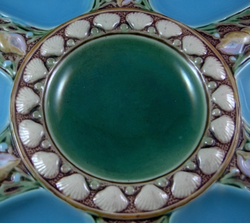 This is a majolica oyster plate made by Minton in 1867. This plate is superbly modeled with a relief deisgn of clams, conchs, scallop shells and seaweed. It has six turquoise color oyster shell wells and an iridescent green center. The plate is marked on the back with various marks including MINTONS and impressed English date stamp registry mark along with some other marks and a number 1323. The piece is in great condition with a few small manufacturing flaws like tiny spots of missed glaze or little zits and on the underside are three stilt marks that were removed and took a bit of glaze off in the process which is common. The plate is 0.75 inches tall and 9.125 inches in diameter. Please email me for more information or other pictures.