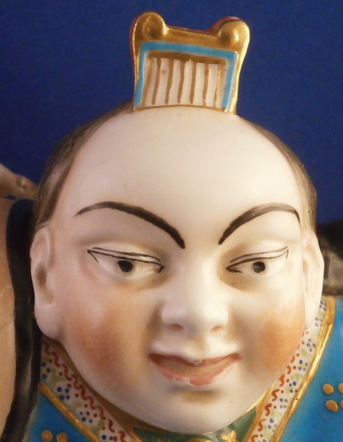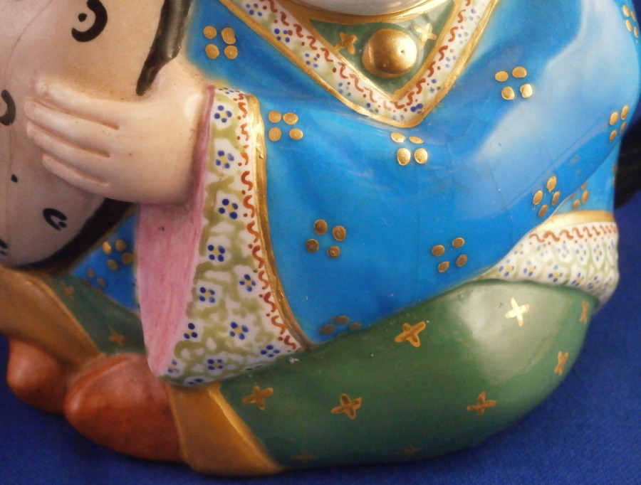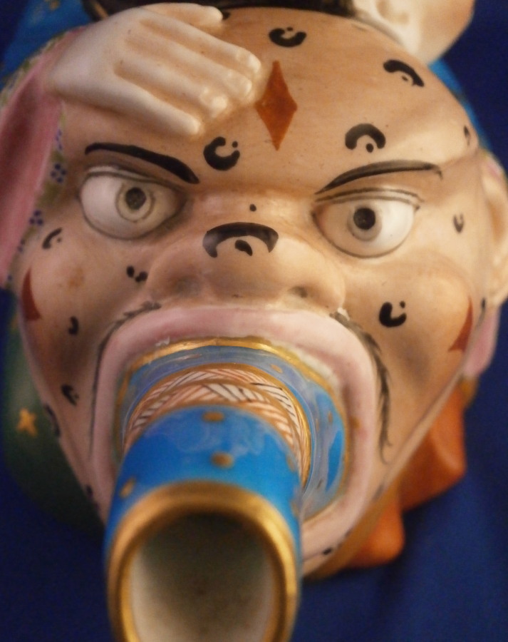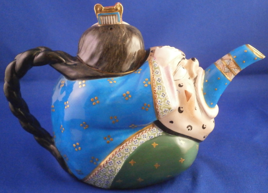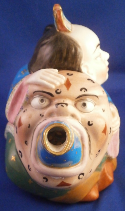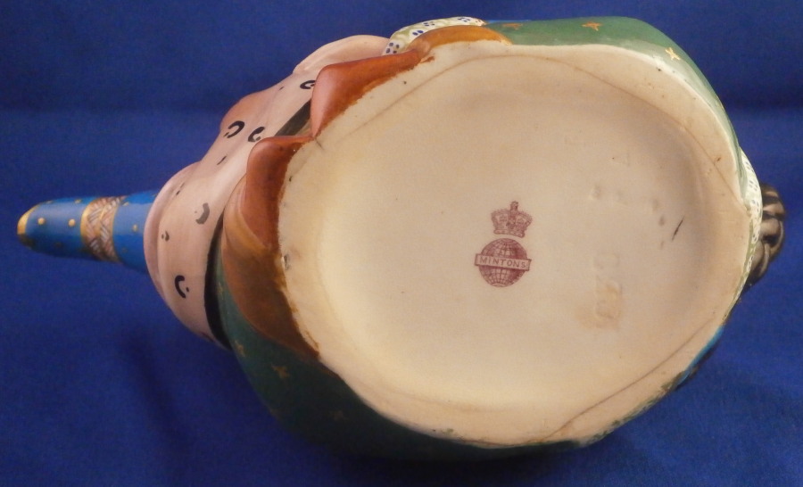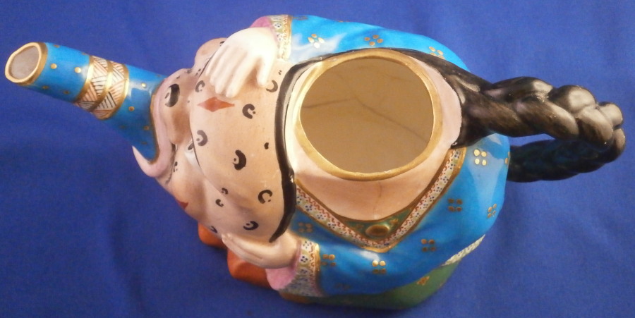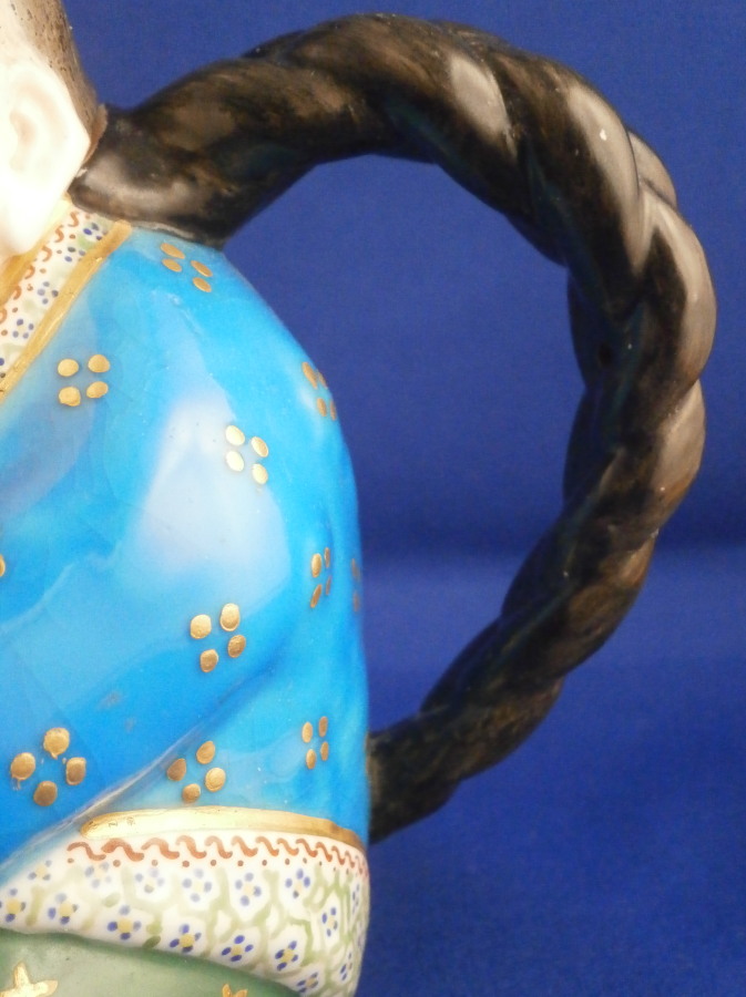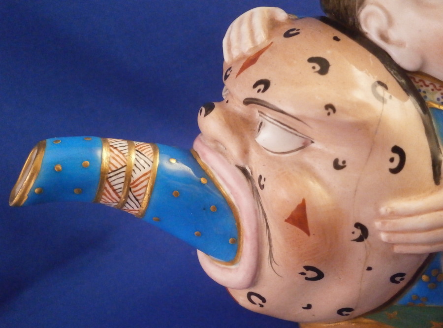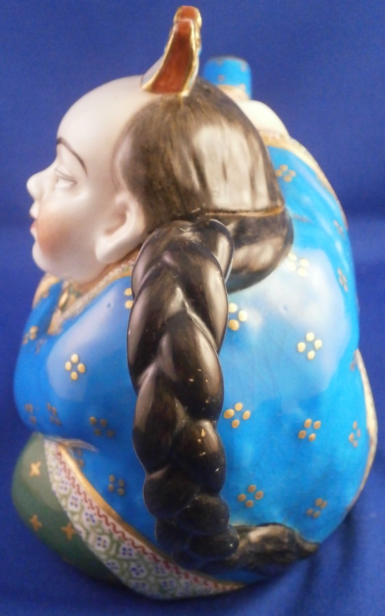 This is a superb and rare porcelain teapot made by Minton probably in the late 19th century though I cannot make out a date code on it though it might be the one for 1885. This puce mark was used from 1873 until 1891 when England was added under it. This shape teapot is usually found made of Majolica but here we have a porcelain version which I have never seen nor can find another example during my searches. In the book it is called a Japanese dwarf with a mask though I ahve seen it more foten described as a Chinaman or Chinese actor holding a Noh mask. Either way this is a stunning example with the head forming the lid and the spout projecting from the mouth of the mask. The person is wearing a robe painted in the traditional Minton turquoise color as is the spout. Braided hair forms the handle of the tea pot . Superbly hand painted with lots details. And now for the not so good news. While the piece displays superbly it has a good amount of hairline cracks which is likely why there are no porcelain versions to be found. There is a crack on the left side of the Noh maks , a tiny chip to the opening which is hidden when the head is in place, a crack down the center to the collar area, a crack all around the bottom inside edge of the piece and some crazing to the turquoise ground color. No restorations, etc. and it does display amazingly and is a rare survivor for sure! The piece is 4.7.5 inches tall, 7.25 inches from handle to spout and about 3.5 inches deep. The pot is marked underneath witht he puce Mintons mark as well as impressed Mintons, some numbers and other marks as shown. Please email me for more information or other pictures.