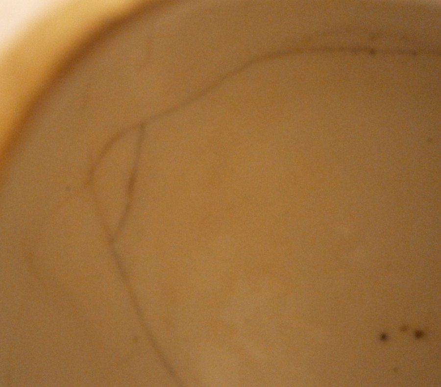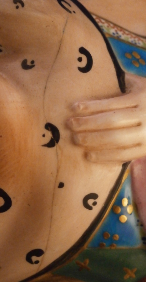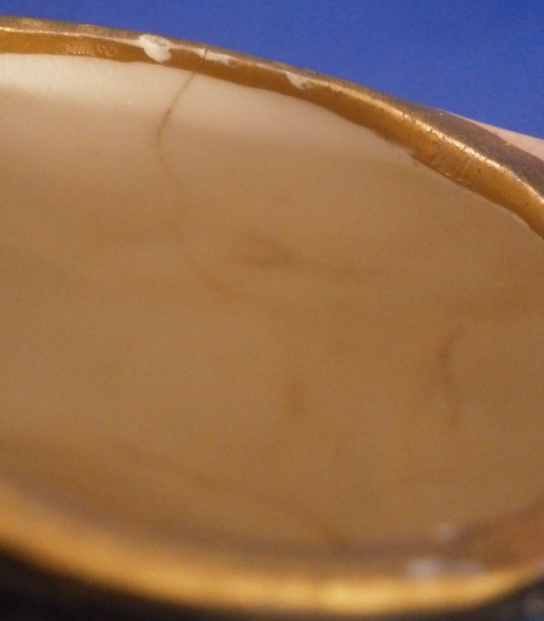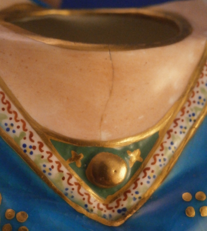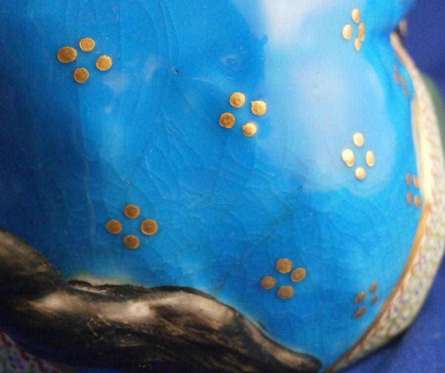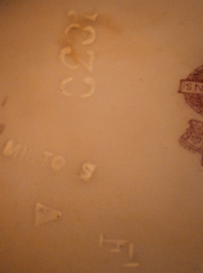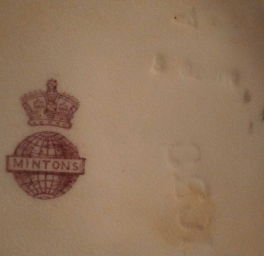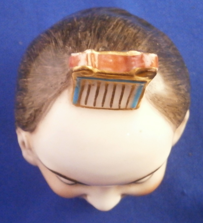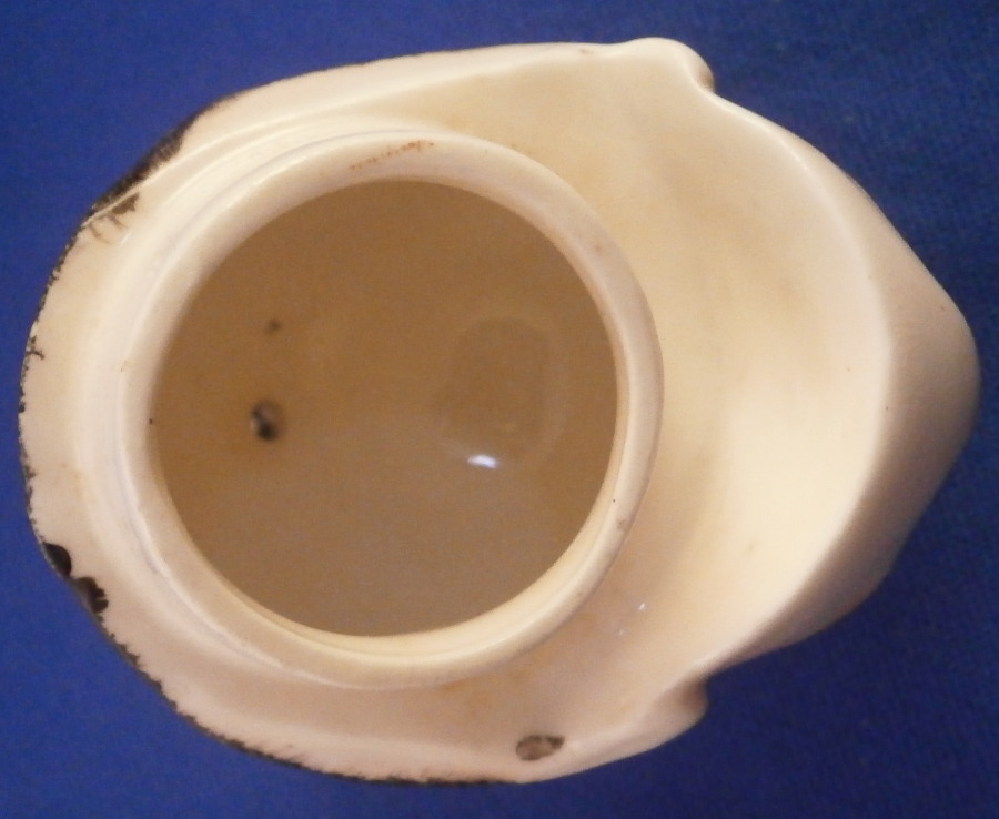 This is a superb and rare porcelain teapot made by Minton probably in the late 19th century though I cannot make out a date code on it though it might be the one for 1885. This puce mark was used from 1873 until 1891 when England was added under it. This shape teapot is usually found made of Majolica but here we have a porcelain version which I have never seen nor can find another example during my searches. In the book it is called a Japanese dwarf with a mask though I ahve seen it more foten described as a Chinaman or Chinese actor holding a Noh mask. Either way this is a stunning example with the head forming the lid and the spout projecting from the mouth of the mask. The person is wearing a robe painted in the traditional Minton turquoise color as is the spout. Braided hair forms the handle of the tea pot . Superbly hand painted with lots details. And now for the not so good news. While the piece displays superbly it has a good amount of hairline cracks which is likely why there are no porcelain versions to be found. There is a crack on the left side of the Noh maks , a tiny chip to the opening which is hidden when the head is in place, a crack down the center to the collar area, a crack all around the bottom inside edge of the piece and some crazing to the turquoise ground color. No restorations, etc. and it does display amazingly and is a rare survivor for sure! The piece is 4.7.5 inches tall, 7.25 inches from handle to spout and about 3.5 inches deep. The pot is marked underneath witht he puce Mintons mark as well as impressed Mintons, some numbers and other marks as shown. Please email me for more information or other pictures.