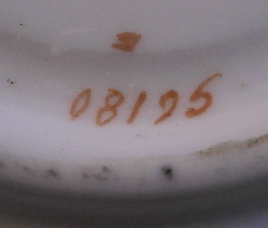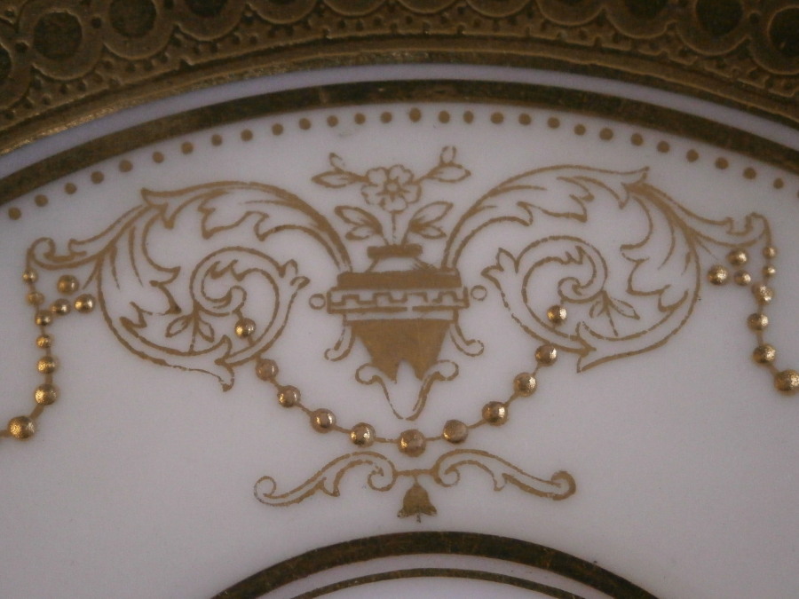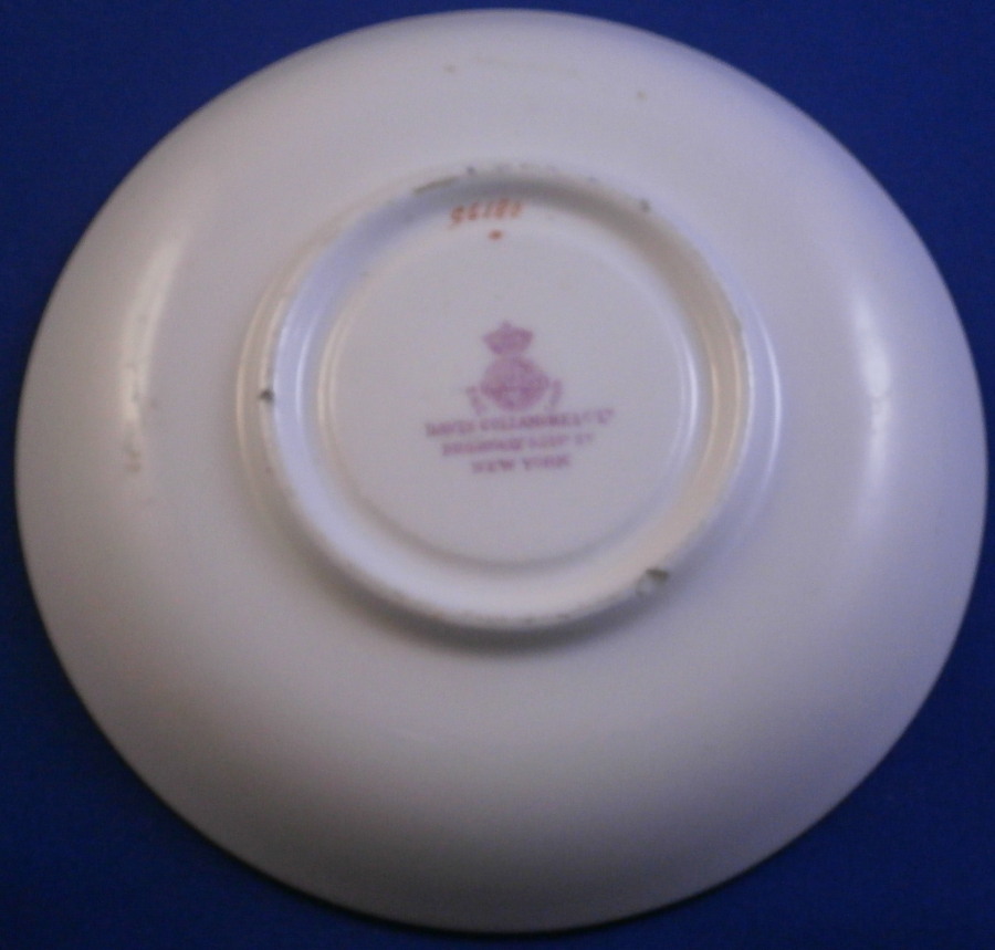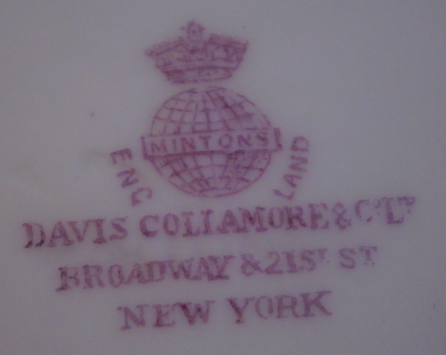 This is a nice saucer made by Mintons of England between 1891 and 1902. It seems to be for a demitasse type cup. The piece is decorated with a very fancy gold design around the well on a light yellow ground with a gold trim to the edge that has a raised design to it. One sees this type of decoration on plates more than on cups and saucers but it would ahve been a stunning set if it still had its cup! Even without it it still has that special feeling to it. The saucer is 4.375 inches in diameter and 0.625 inches tall. It is in superb condition with just the slightest of wear plus a small chip to the foot ring and is marked with their puce mark as shown including MINTONS in the center of a globe, ENGLAND to the sides and a crown above with the retailer in NY it was made for. Also some red numbers and another mark. Please email me for more information or other pictures.