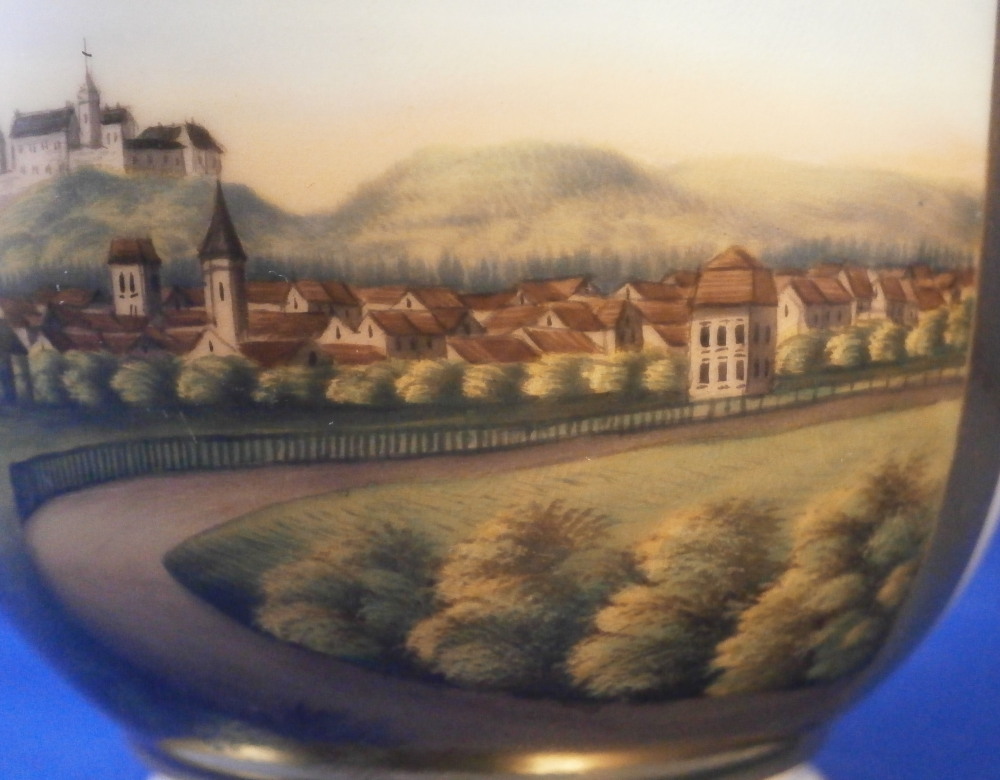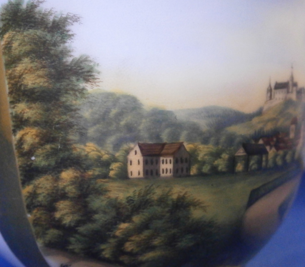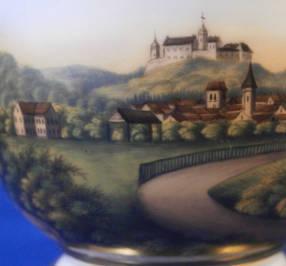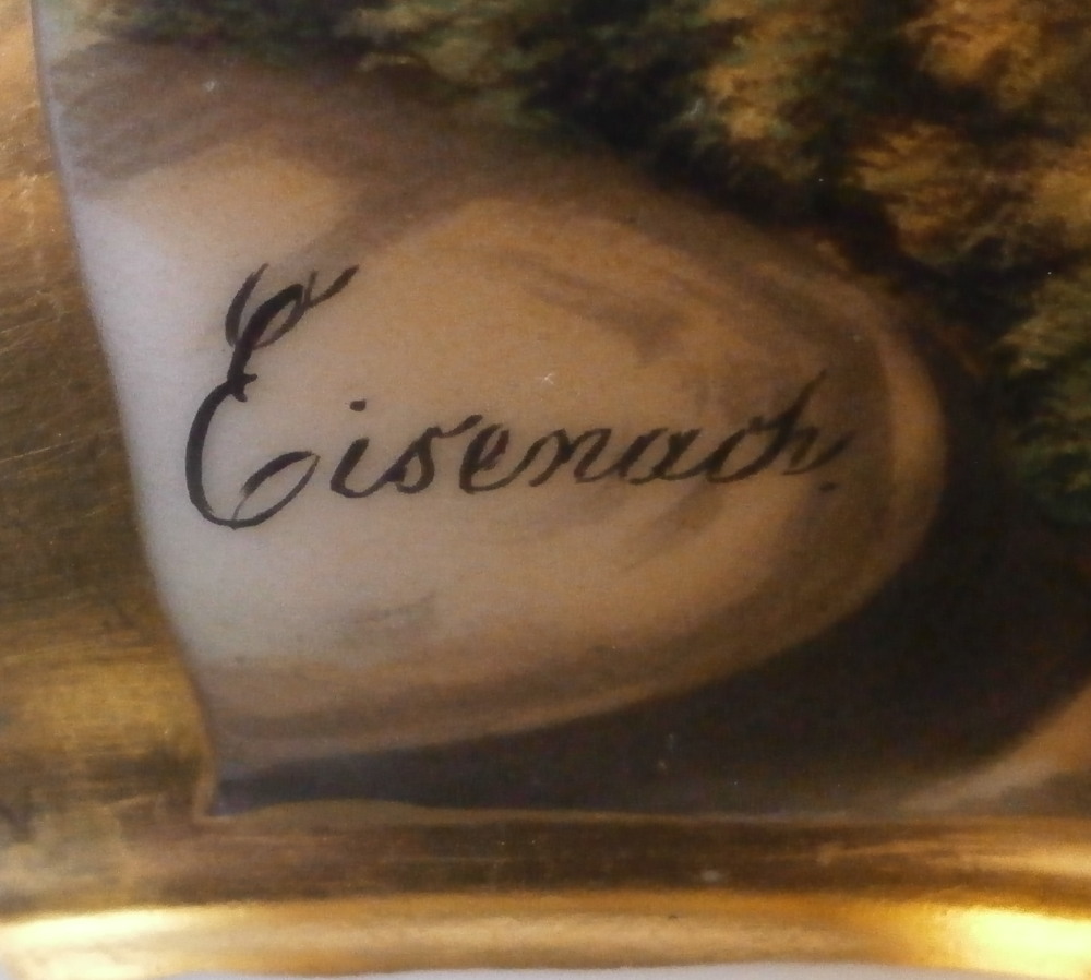 This is a nice cup and saucer set made by Moabit in the second half of the 19th century. Moabit was located in Berlin and was founded by M. Schumann and son around 1835 and lasted until about 1913. The cup has a superb scene on the front of the city of Eisenach which is located in the Thuringia region of Germany and I think even had its own porcelain factory for a short while. The scene is of the town with the famous Wartburg castle on top of the hill and the city below in a nice landscape surrounding. The name of the scene is written in the left bottom corner as shown. The scene is surrounded by a gold trim with more gold trim to the top and bottom of the cup as well as the handle. The saucer has a gold ring around the well and gold trim to the edge. A nice example with a nice topographical scene by a maker one does not see very often. The set is in good condition with just some wear to the gilding as shown. The cup is marked underneath with the eagle mark over the letters SPM in under glaze blue. The saucer has a similar mark with the eagle wings upwards instead of downwards as well as an impressed letter B and some numbers as shown. The cup is 3.25 inches tall and 3.875 inches in diameter. The saucer is 1 inch tall with a diameter of 6.25 inches. A very nice size set with a great scene to it! Please email me for more information or photos.