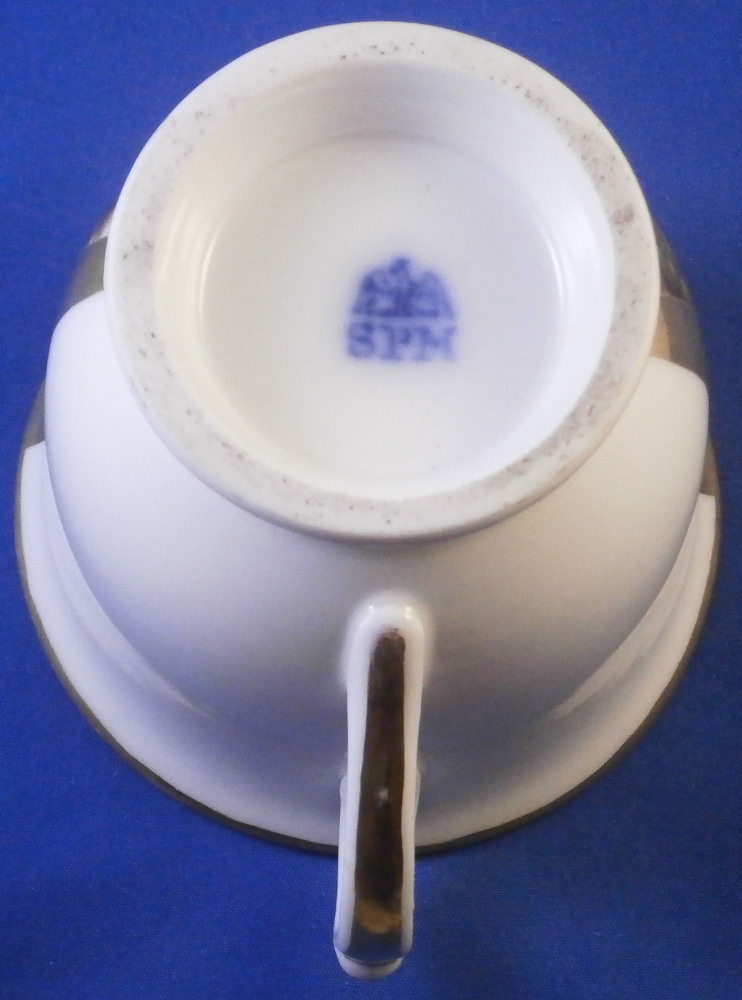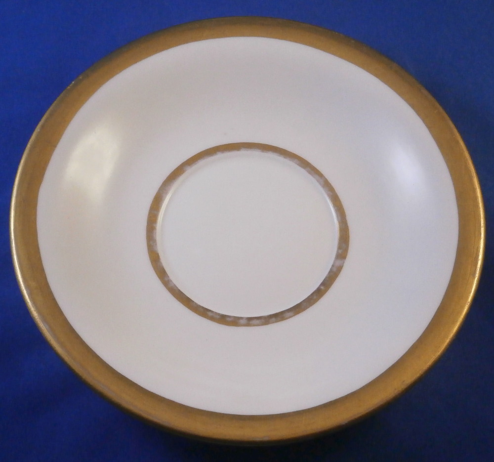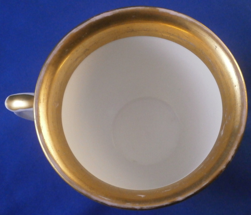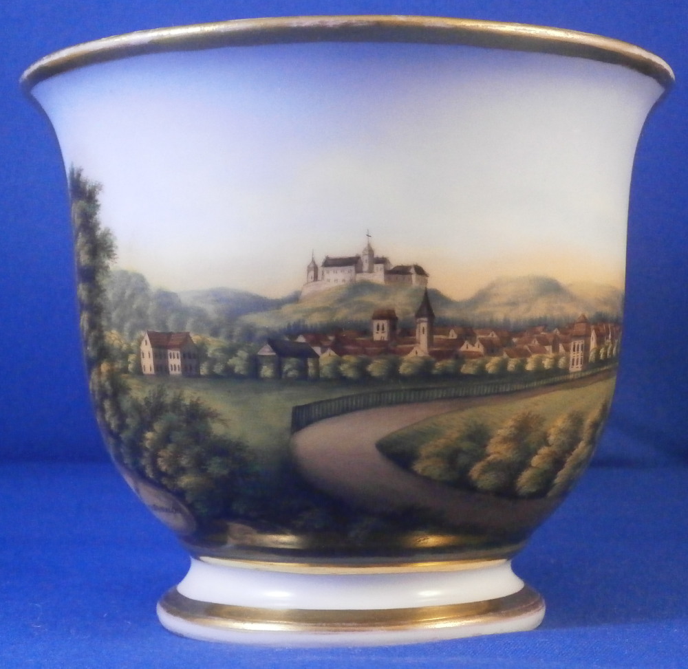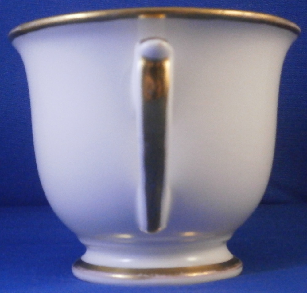 This is a nice cup and saucer set made by Moabit in the second half of the 19th century. Moabit was located in Berlin and was founded by M. Schumann and son around 1835 and lasted until about 1913. The cup has a superb scene on the front of the city of Eisenach which is located in the Thuringia region of Germany and I think even had its own porcelain factory for a short while. The scene is of the town with the famous Wartburg castle on top of the hill and the city below in a nice landscape surrounding. The name of the scene is written in the left bottom corner as shown. The scene is surrounded by a gold trim with more gold trim to the top and bottom of the cup as well as the handle. The saucer has a gold ring around the well and gold trim to the edge. A nice example with a nice topographical scene by a maker one does not see very often. The set is in good condition with just some wear to the gilding as shown. The cup is marked underneath with the eagle mark over the letters SPM in under glaze blue. The saucer has a similar mark with the eagle wings upwards instead of downwards as well as an impressed letter B and some numbers as shown. The cup is 3.25 inches tall and 3.875 inches in diameter. The saucer is 1 inch tall with a diameter of 6.25 inches. A very nice size set with a great scene to it! Please email me for more information or photos.