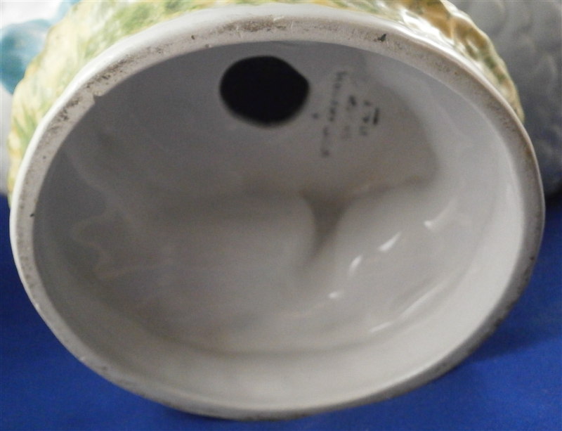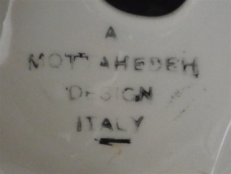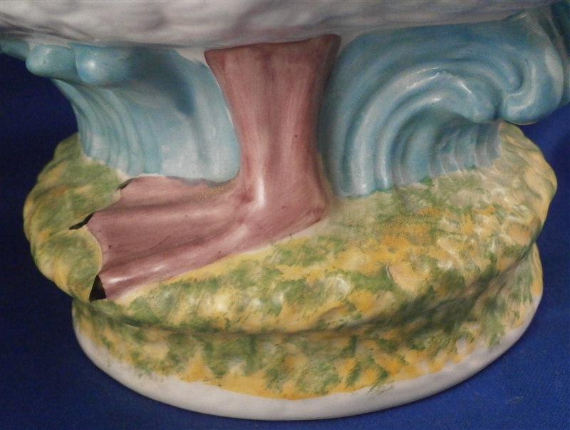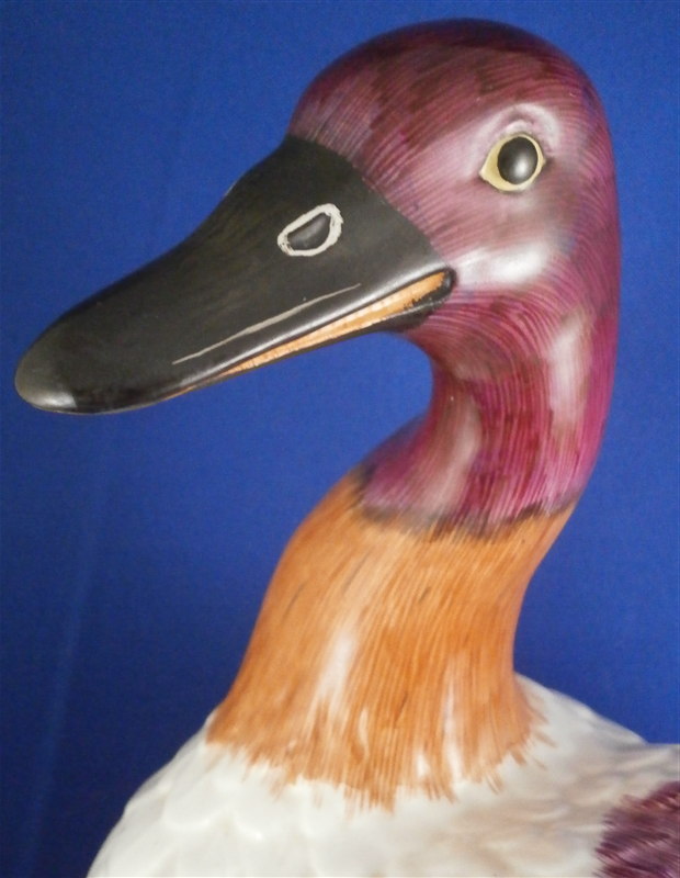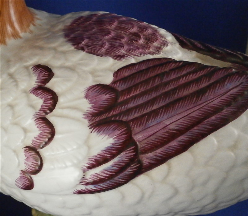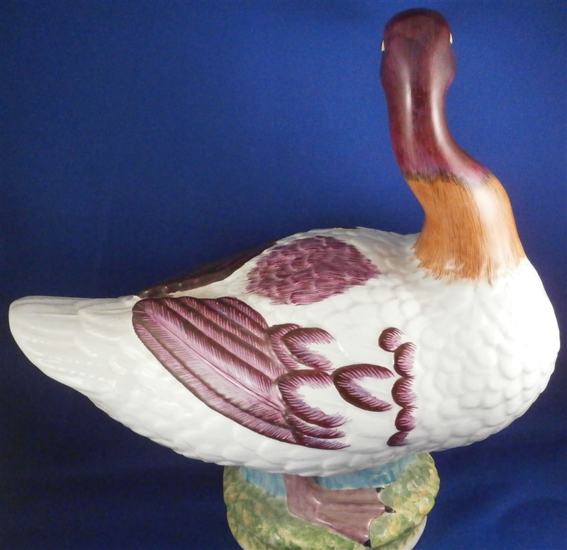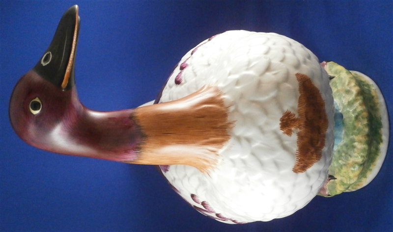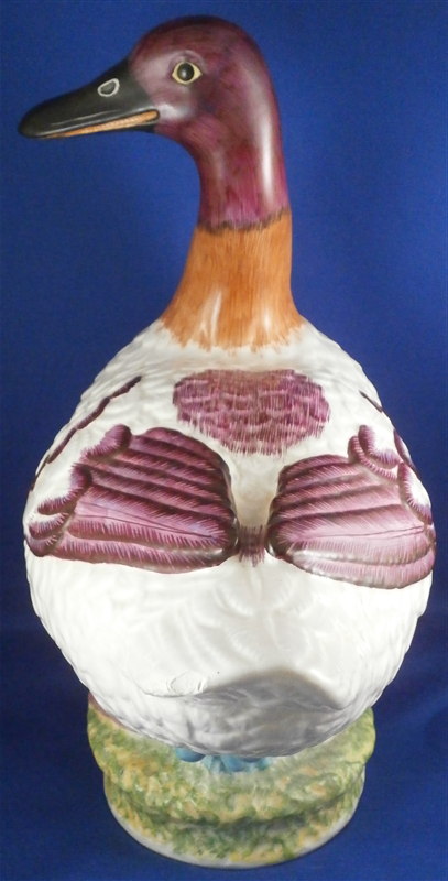This is a large figurine made by Mottahedeh in the 20th century after a Chinese Export piece of the 18th century. It is either a duck or goose - not sure. It is nicely modeled and colorfully painted just enough to make it fun to look at. I think it is made of some sort of ceramic rather than porcelain because it is much lighter than porcelain would be. The figure is rather large being about 12 inches tall, 11 inches long and 5.5 inches wide. The piece is marked underneath with a black script saying A Mottahedeh Design Italy as shown. The duck/goose is in great condition with a chip to the back tail edge as shown. It was restored there at some point but came off again. An easy fix if need be but it displays nicely as is! Please email me for more information or other pictures. Prag