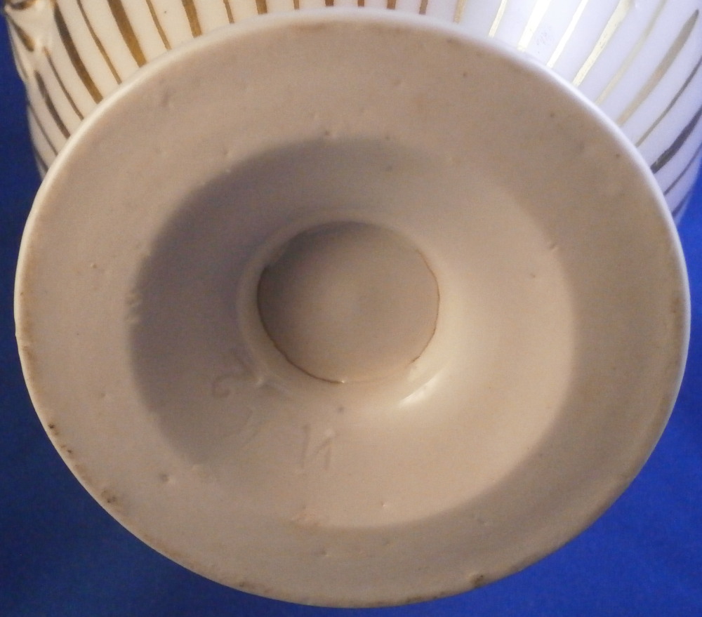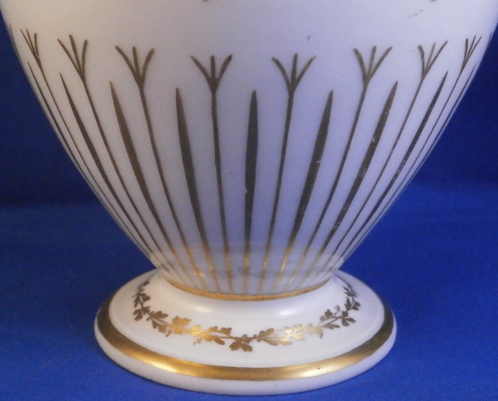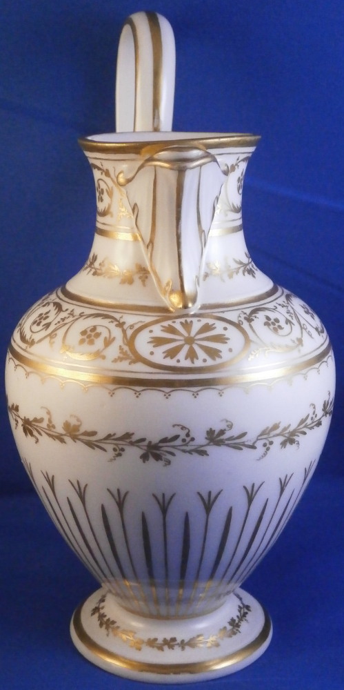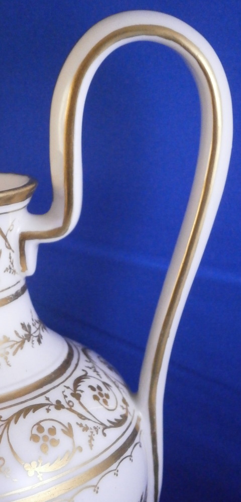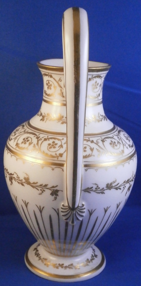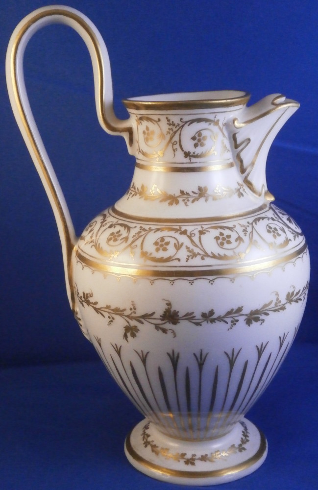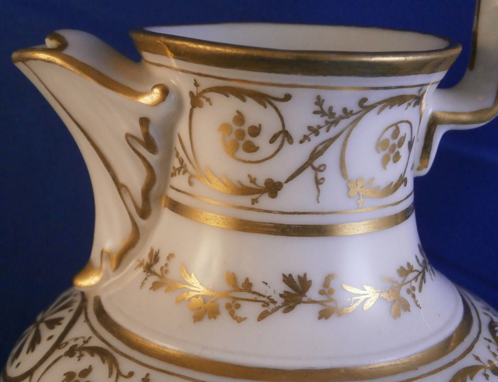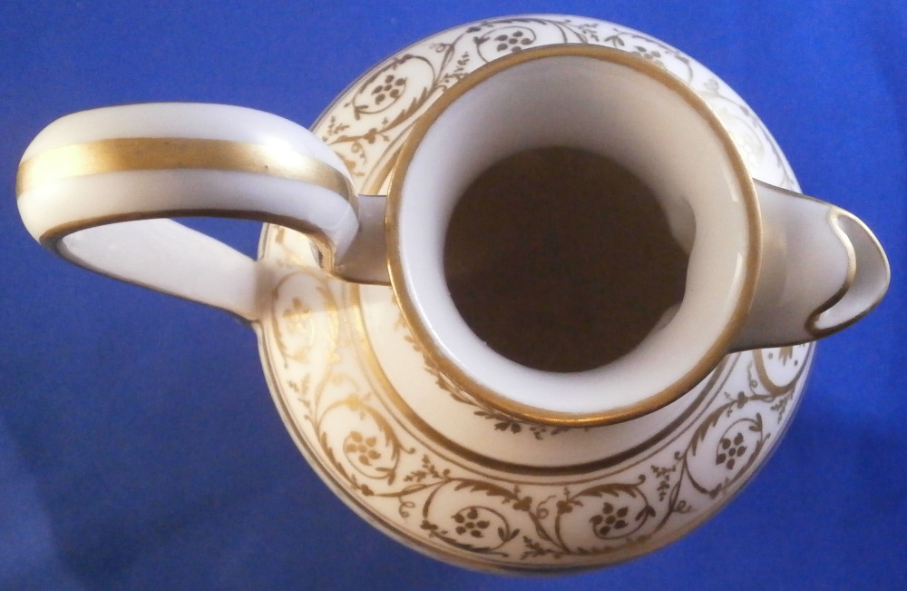 This is a nice creamer / cream / milk pot made by Naples , Real Fabbrica Ferdinandea , in the 18th century. Not a maker one finds pieces from very often and it's not the most exciting piece ever but it looks great and is in superb condition! The entire main body is hand painted with a fancy gold design with a nice spout and handle shape. It's a great looking piece and a rare survivor. The piece is in superb condition with just a touch of very minor wear to the gilding. It is 8.375 inches tall including the handle with a diameter of 4.25 inches. The creamer is marked underneath with just some impressed / incised letters as shown but it came with its matching sugar dish that also had the crown under N mark. The matching sugar dish is listed separately if anyone is interested in a rare set. Please email me for more information or other pictures.