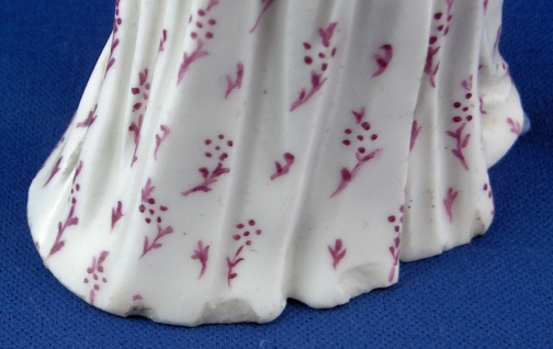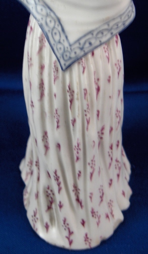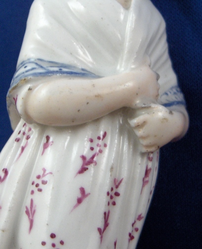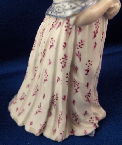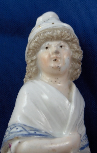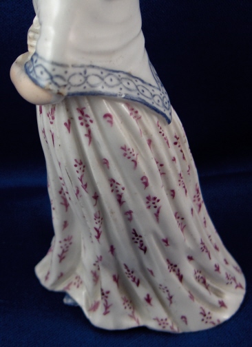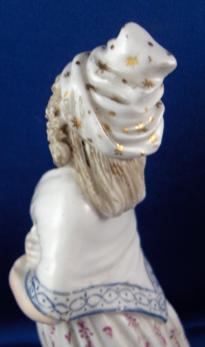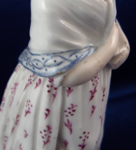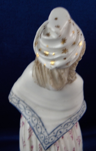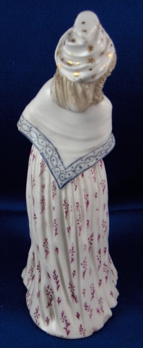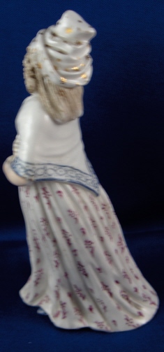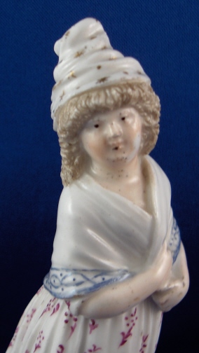 This is a very rare figurine made by Naples ( Real Fabbrica Ferdinandea ) around 1775. It is of a lady wearing a nice skirt, a scarf over her sholder and a hat on her head. She is made of softpaste porcelain and has the typical hair for this period and maker. Really well modeled and handpainted and one can see the Capodimonte influence in the painting and colors. Quite heavy for her size since softpaste is very thickly potted as it would otherwise not hold up during the firing process. The figurine is in great condition with some small firing spots on her arms and face, a tiny meanigless chip to the edge of her scarf by her left elbow and five small chips to the bottom edge of her skirt which are not obvious at all due to the folds and white color. A small chip to the very tip of her left foot. So she displays perfectly especially for such an old and rare piece. She is unmarked which seems to be the norm from the few pieces I have been able to find. The figurine is about 5.5 inches tall, 2 inches wide and 2.75 inches deep. Please email me for more information or other pictures.