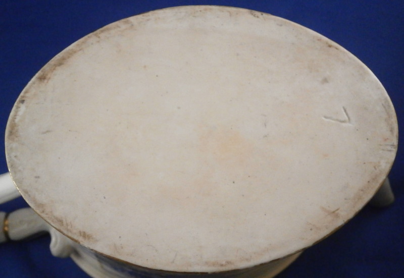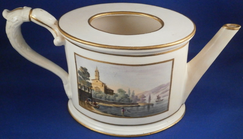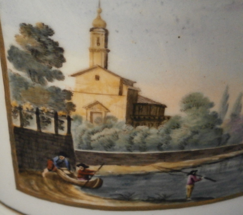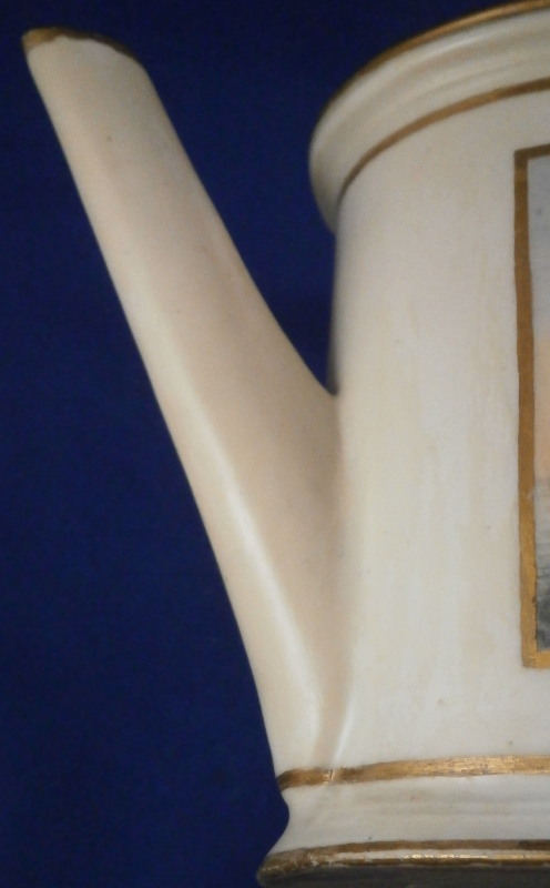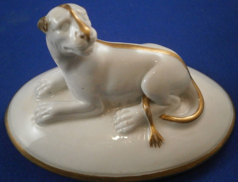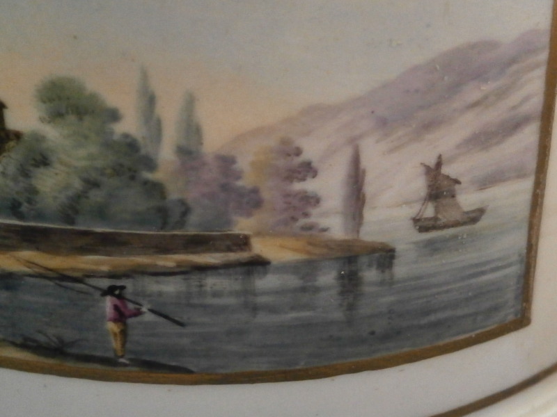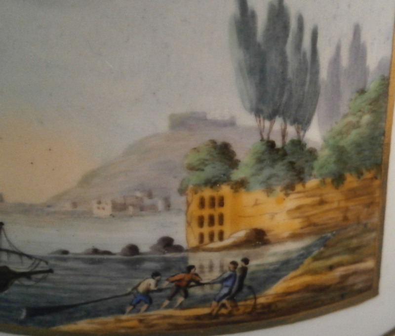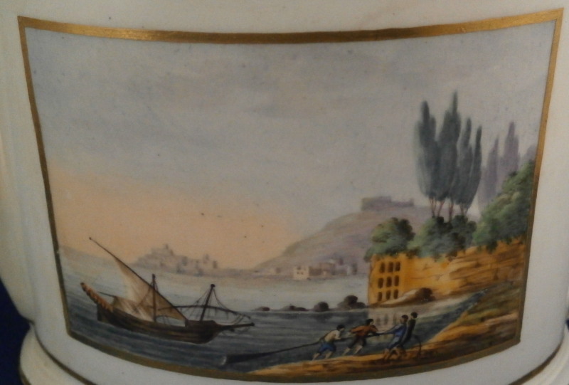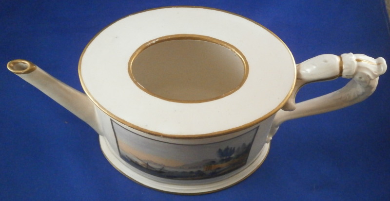 This is a very rare tea pot made in Naples , Real Fabbrica Ferdinandea in about 1795. The Capodimonte factory existed near Naples from 1743 until 1759. It had little to do with the Naples factory which was founded by Ferdinand IV in 1771 and was around until 1806 when the French occupied it and after that the molds, etc. were sold all over the place. The teapot has a nice oval shape to it with an amazing lid that has a lioness as the finial - so Roman :) Each side has a large hand painted harbor scene to it including the water, buildings, ships, people and off course the landscape surrounding. I love these types of pieces because the scenes show how everyday life was back over 200 years ago. Some nice well palces gold trim make this one elegant piece. The piece is in good condition and displays perfectly but there is a small chip to the lioness' ear and the spout has had some work done to it. There is so much over paint that it is impossible to tell what but enough is scratched off to reveal the original porcelain underneath that I suspect it was a break in the spout close to the main body. No way of knowing unless you takke all the over paint off and redo it. It was well done with the paint having slighly discolored over time but still blends in well with the rest of the piece. Rare enough that is really doesn't matter as much since you're not going to find another one. The teapot is not marked except for an incised L but that's pretty common. The piece including the lid is about 6 inches tall, 9 inches from handle to spout and 3.75 inches wide. Please email me for more information or other pictures.