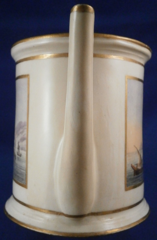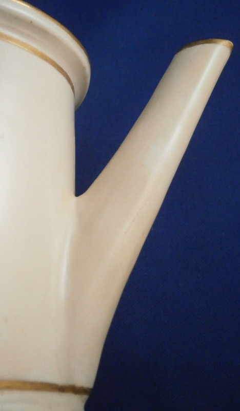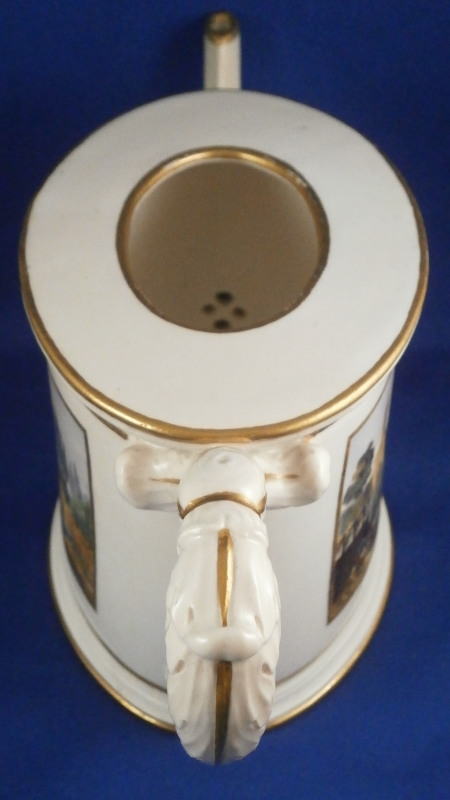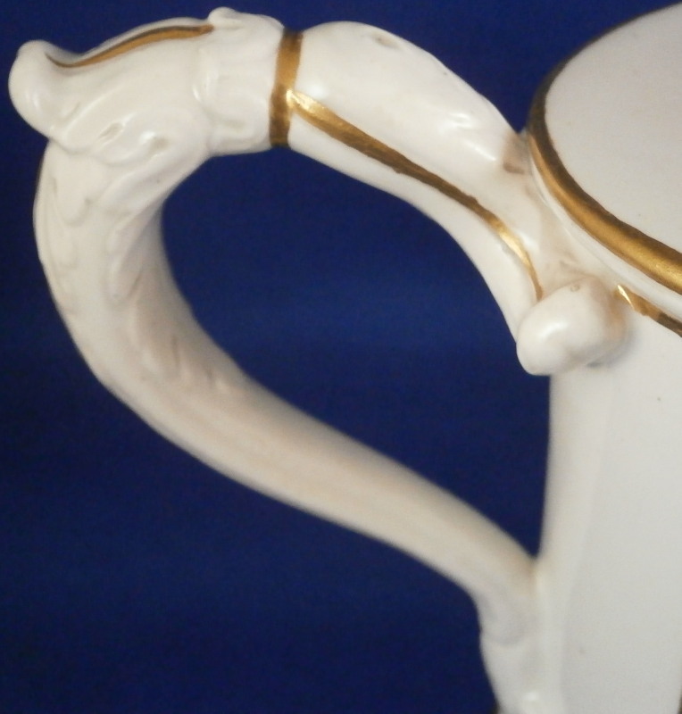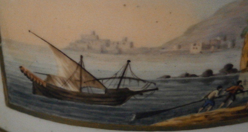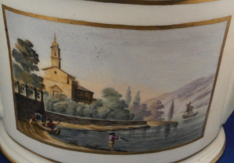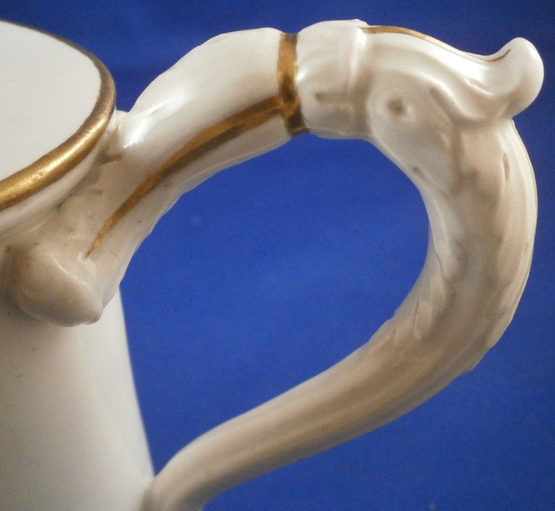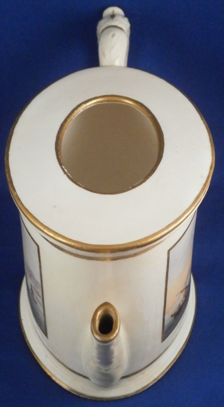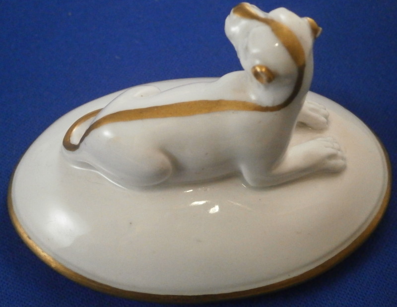 This is a very rare tea pot made in Naples , Real Fabbrica Ferdinandea in about 1795. The Capodimonte factory existed near Naples from 1743 until 1759. It had little to do with the Naples factory which was founded by Ferdinand IV in 1771 and was around until 1806 when the French occupied it and after that the molds, etc. were sold all over the place. The teapot has a nice oval shape to it with an amazing lid that has a lioness as the finial - so Roman :) Each side has a large hand painted harbor scene to it including the water, buildings, ships, people and off course the landscape surrounding. I love these types of pieces because the scenes show how everyday life was back over 200 years ago. Some nice well palces gold trim make this one elegant piece. The piece is in good condition and displays perfectly but there is a small chip to the lioness' ear and the spout has had some work done to it. There is so much over paint that it is impossible to tell what but enough is scratched off to reveal the original porcelain underneath that I suspect it was a break in the spout close to the main body. No way of knowing unless you takke all the over paint off and redo it. It was well done with the paint having slighly discolored over time but still blends in well with the rest of the piece. Rare enough that is really doesn't matter as much since you're not going to find another one. The teapot is not marked except for an incised L but that's pretty common. The piece including the lid is about 6 inches tall, 9 inches from handle to spout and 3.75 inches wide. Please email me for more information or other pictures.