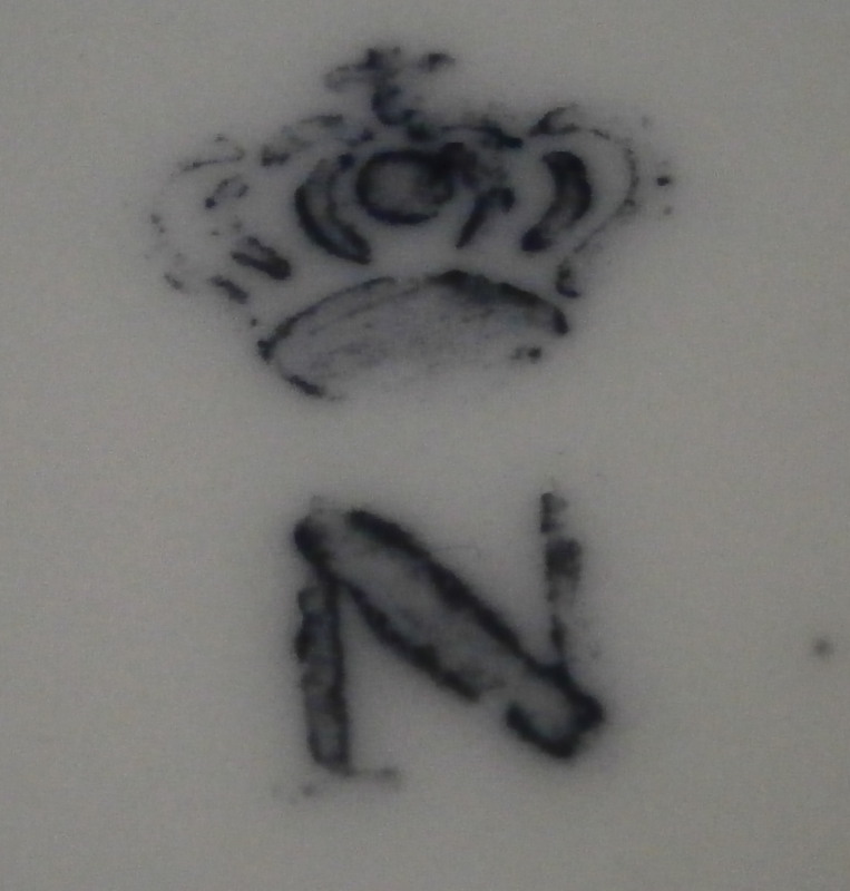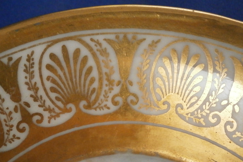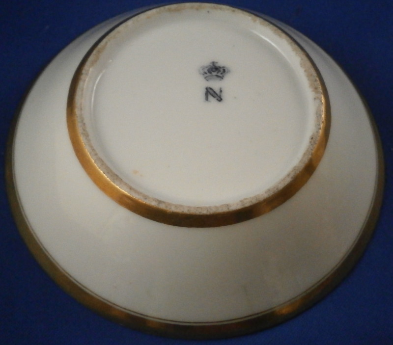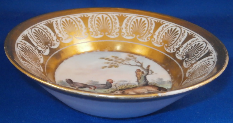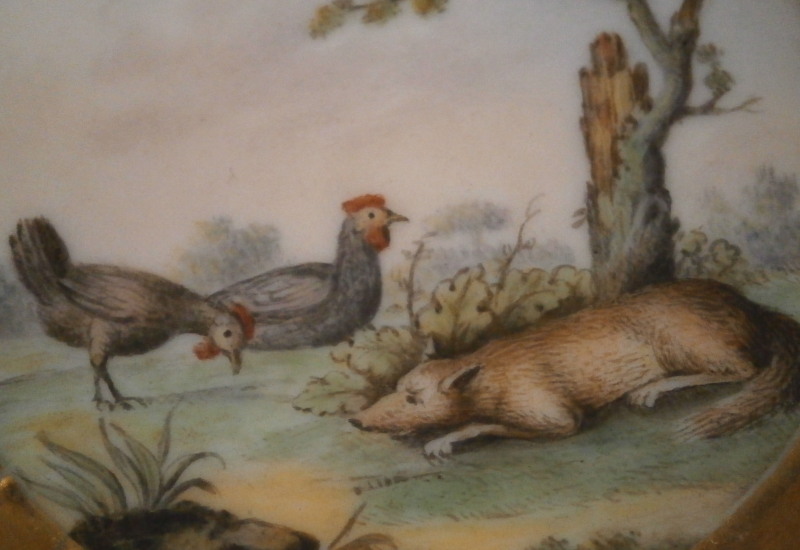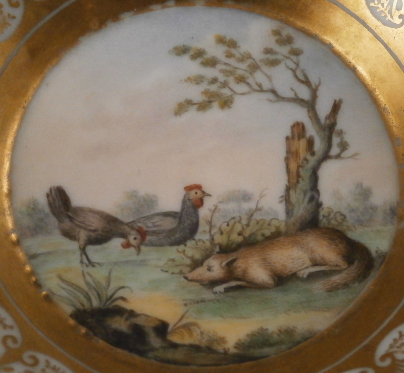 This is a saucer made by Naples in the 18th century. It is hand painted with a superb scene in the center of a fox trying to get to two chicken in a nice landscape surrounding. The sides of the saucer have some fancy gilding to it as shown. The outside rim and foot ring also have a gold trim to them. The saucer is in perfect condition with a minor amount of wear. It is 1.25 inches tall and 5.125 inches in diameter and is marked underneath with the crown over N mark. Please email me for more information or other pictures.