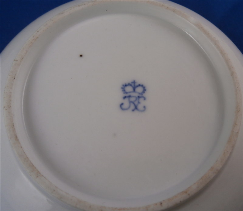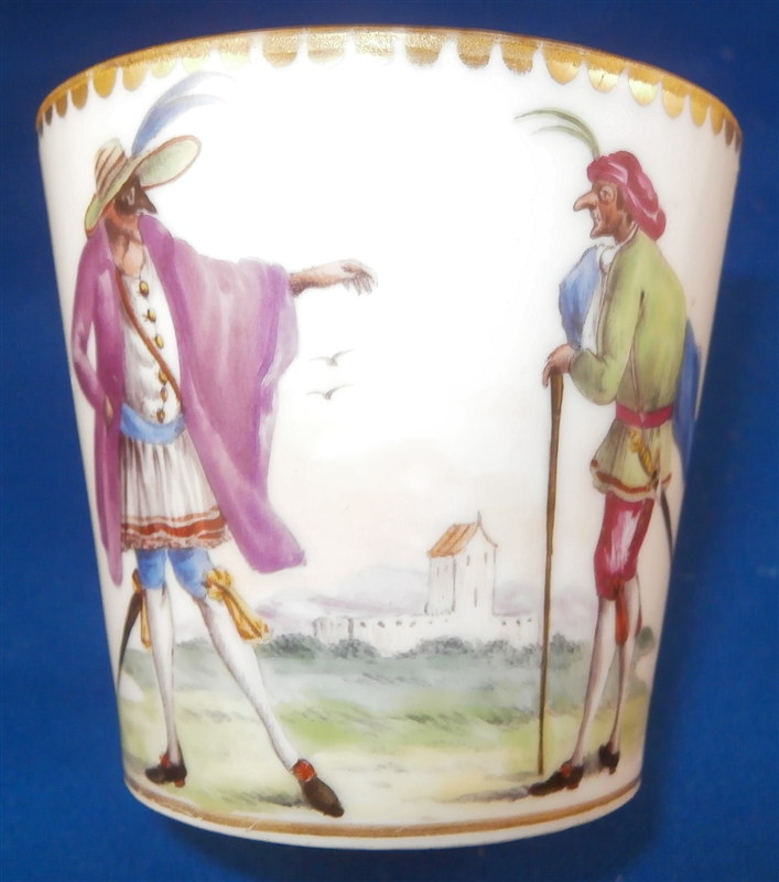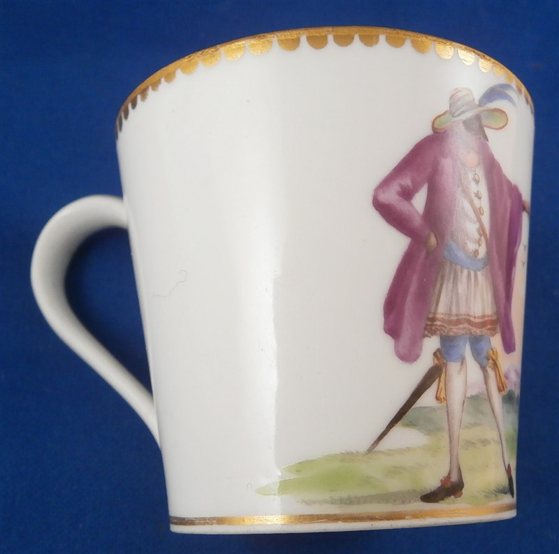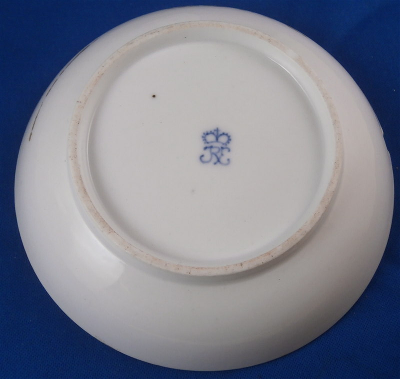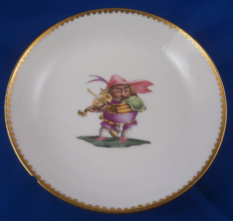 This is a nice cup and saucer made in the 19th century as a copy of an 18th century sofpaste design. It is nciely handpainted with a commedia dell'arte scene on the front of the cup including two characters as well as a landscape scene with a building in it and a dwarf playing the violin in the center of the saucer. Nice gold trim to both! Wish it was a softpaste piece I would have kept it forever :) The set is in great condition with a rim chip to the saucer as shown. The cup and saucer are marked with the underglaze blue RF mark under a crown as shown. The cup stands about 2.5 inches tall, 2.5 inches in diameter. The saucer is about 5 inches in diameter. Please email me for more information or other pictures.