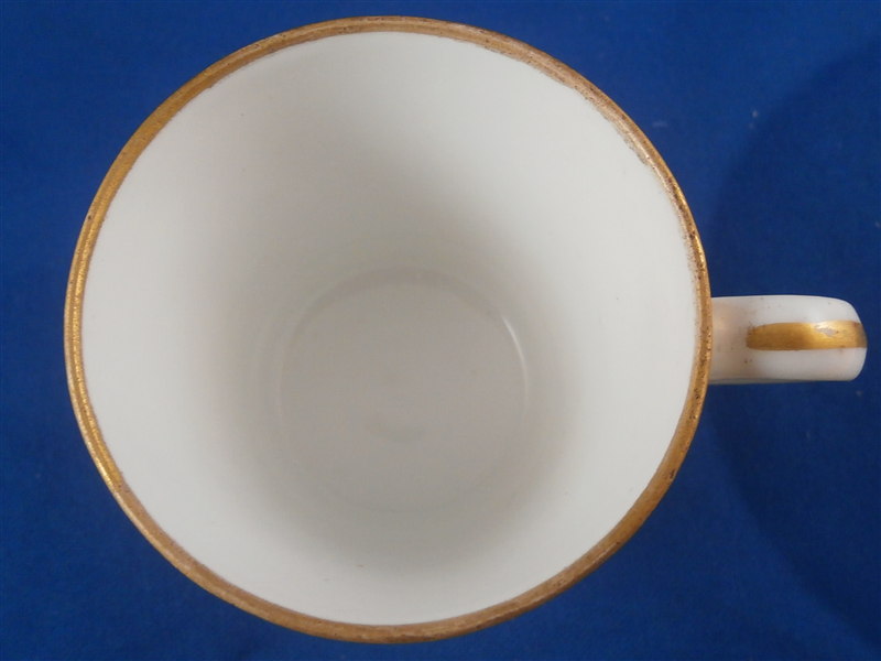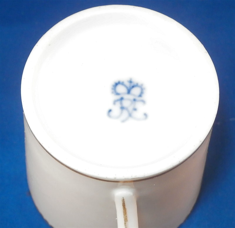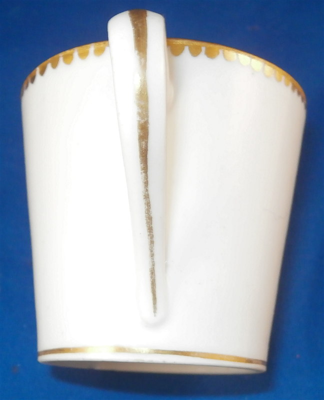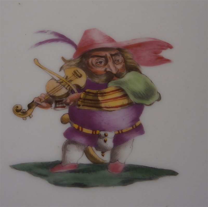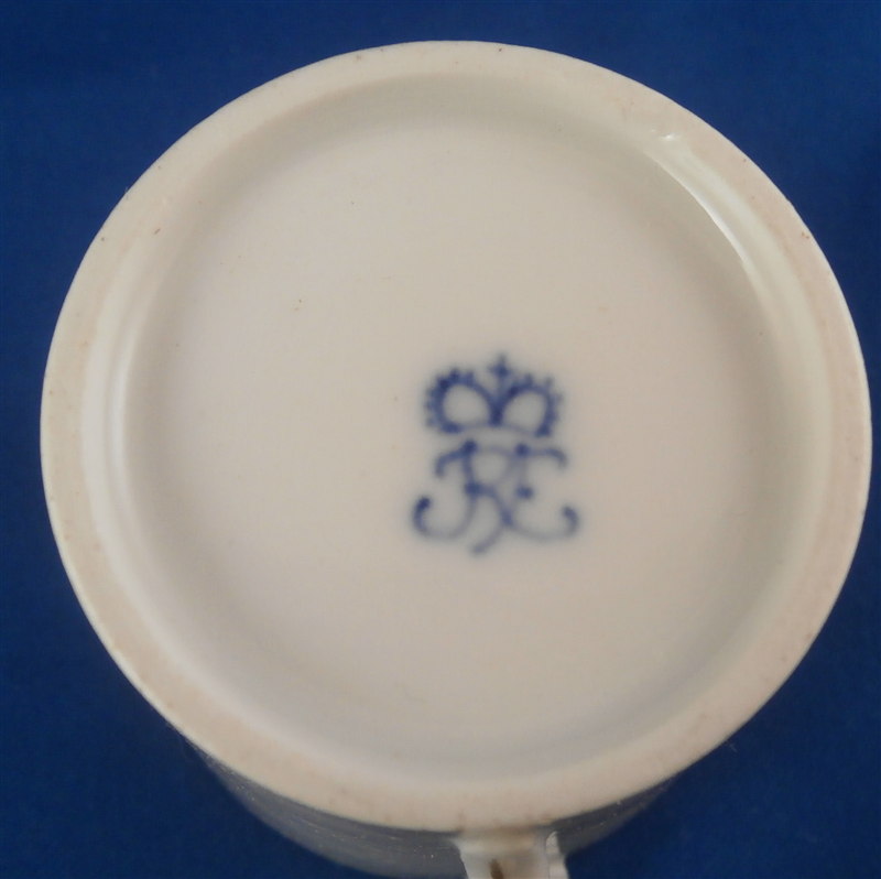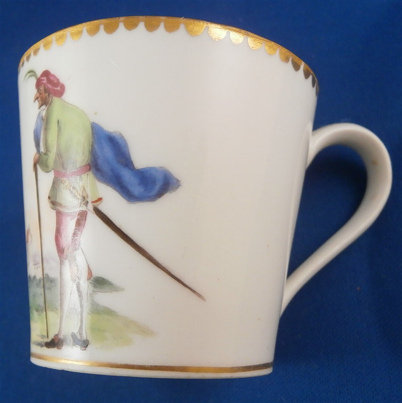 This is a nice cup and saucer made in the 19th century as a copy of an 18th century sofpaste design. It is nciely handpainted with a commedia dell'arte scene on the front of the cup including two characters as well as a landscape scene with a building in it and a dwarf playing the violin in the center of the saucer. Nice gold trim to both! Wish it was a softpaste piece I would have kept it forever :) The set is in great condition with a rim chip to the saucer as shown. The cup and saucer are marked with the underglaze blue RF mark under a crown as shown. The cup stands about 2.5 inches tall, 2.5 inches in diameter. The saucer is about 5 inches in diameter. Please email me for more information or other pictures.
