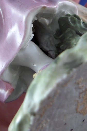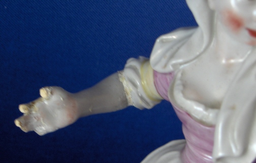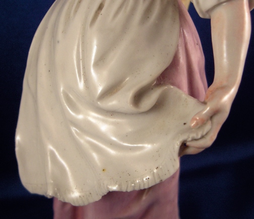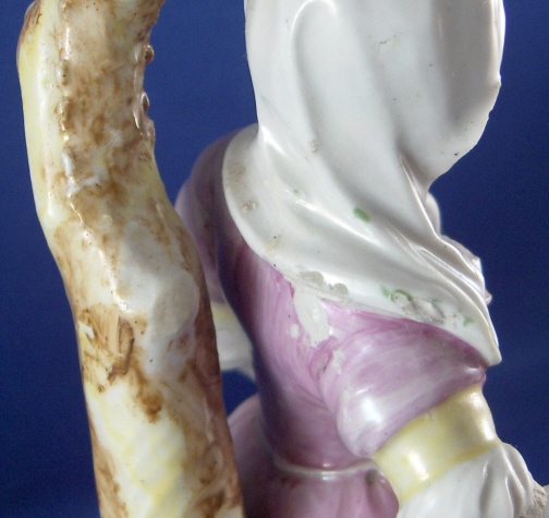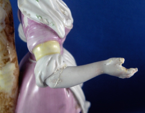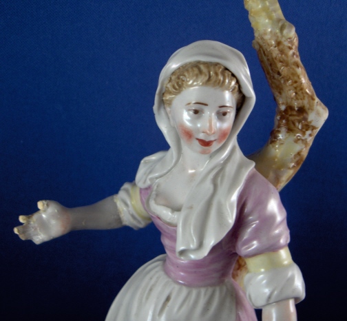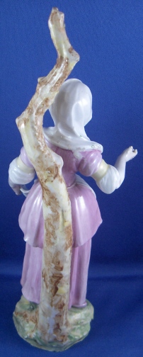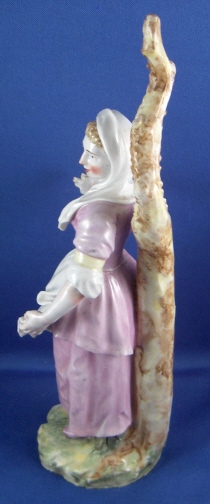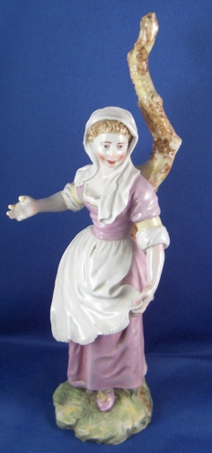 This is a very rare figurine made by either Naples (Real Fabbrica Ferdinandea) , Buen Retiro or most likely I think by Nove di Bassano founded by Pasquale Antonibona in 1750. He began making porcelain around 1752. This piece probably dates to around 1775. It is of a country woman that is modeled superbly and painted simply yet elegantly. She is wearing a pink dress with a white apron and has her head covered with a cloth. Quite the rare figurine! The figure is in good condition with her right arm broken off and reattached, missing fingers on her right hand, a crack in the base and the tree had leaves/ branches I think at some point which are missing and the stumps ground down to hide that fact. One branch must have gone to the back of her right shoulder and there is some damage there from the leaves being removed. The piece displays nicely! It is unmarked but that is not uncommon. The piece is 9.625 inches tall, 3.375 inches wide and 3 inches deep. Please email me for more information or other pictures.