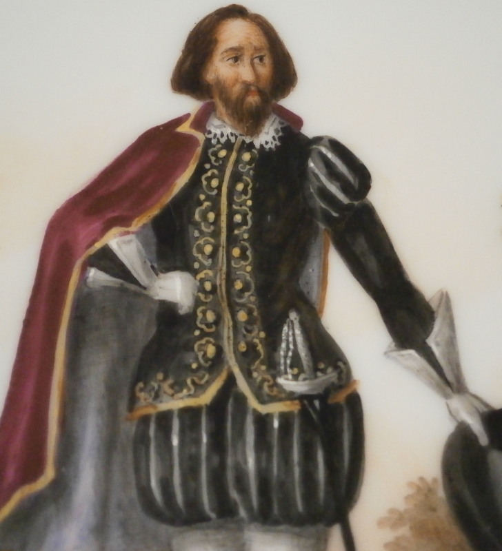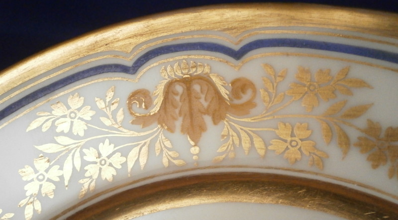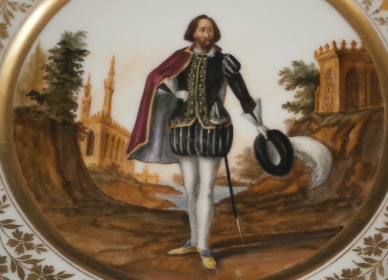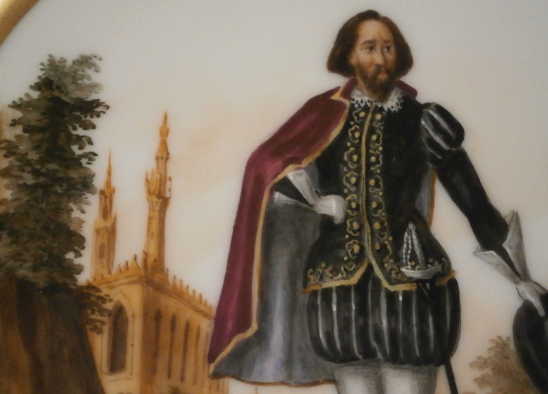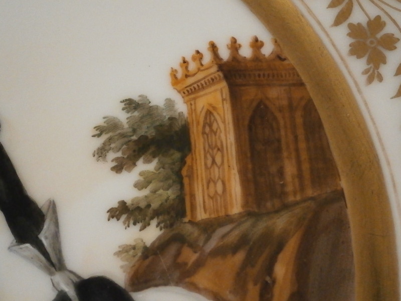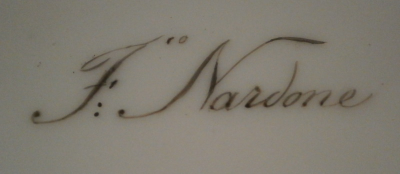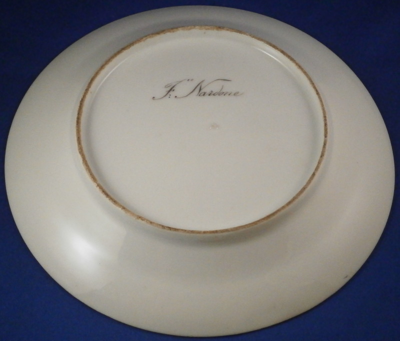 This is an interesting plate made in Naples in the early 19th century around 1830. Likely a Paris blank that was decorated in Naples by the likes of Raffaele Giovine or someone like that. The piece is superbly painted with a superb scene in the center including a bit of a landscape and some buildings with a prominet central figurine dressed in some fancy clothes of the period or maybe even a bit earlier. The person seems to be F. Nardone - a member of the prominant Naples Nardone family . The surname Nardone was first found in the Kingdom of Naples , formerly Napoli or Neapolis, in southern Italy. Not sure who the actual person is but there are quite a few noble members with this name. Either way a fun and unusual plate. The rim has a nice gold leaf and yellow design trim with a blue and gold line around the edge. The plate is in superb condition with some very minor wear. It is not makred except for the name in black as mentioned. The plate is 1.25 inches tall and 9.125 inches in diameter. A must have for a family member or a collector of Italian porcelain :) Please email me for more information or other pictures.