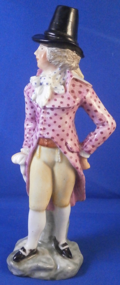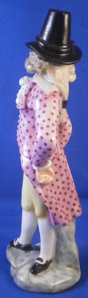 This is a very rare figurine made by Naples ( Real Fabbrica Ferdinandea ) around 1795. It is from the Real Passeggio series and is of a gentleman wearing a fancy outfit including long pink coat with a dot design to it, top hat and yellow pants. Standing on a simple base. Typical hair style for this maker and period. The figure was most likely modelled by Filippo Tagliolini (head modeller) and painted by Giovan Battista Polidoro. He is made of softpaste porcelain. Really well modeled and hand painted and one can see the Capodimonte influence in the painting and colors. The figurine is in superb condition with some chips to the edge of the hat which were colored in to hide them better. He displays perfectly! The piece is unmarked which seems to be the norm from the few pieces I have come across. The figurine is about 6.625 inches tall, 2.5 inches wide and 2.25 inches deep. Please email me for more information or other pictures.