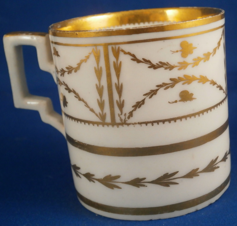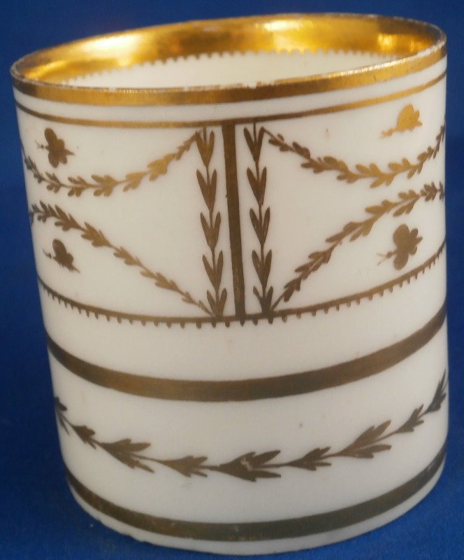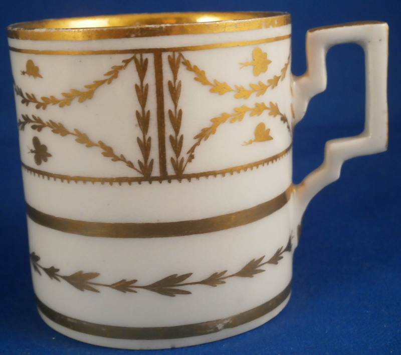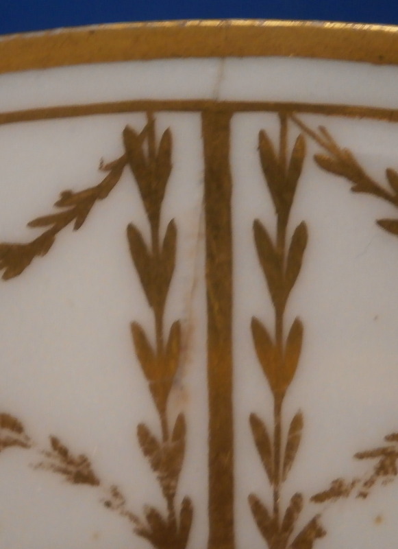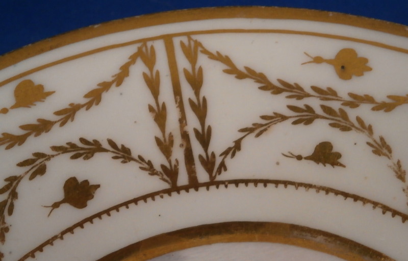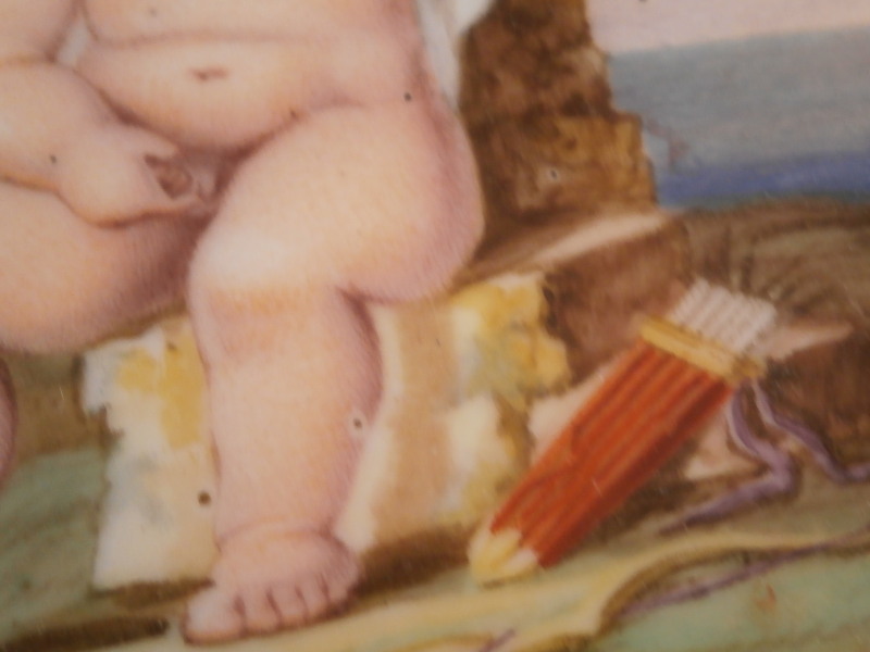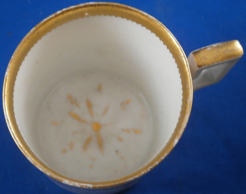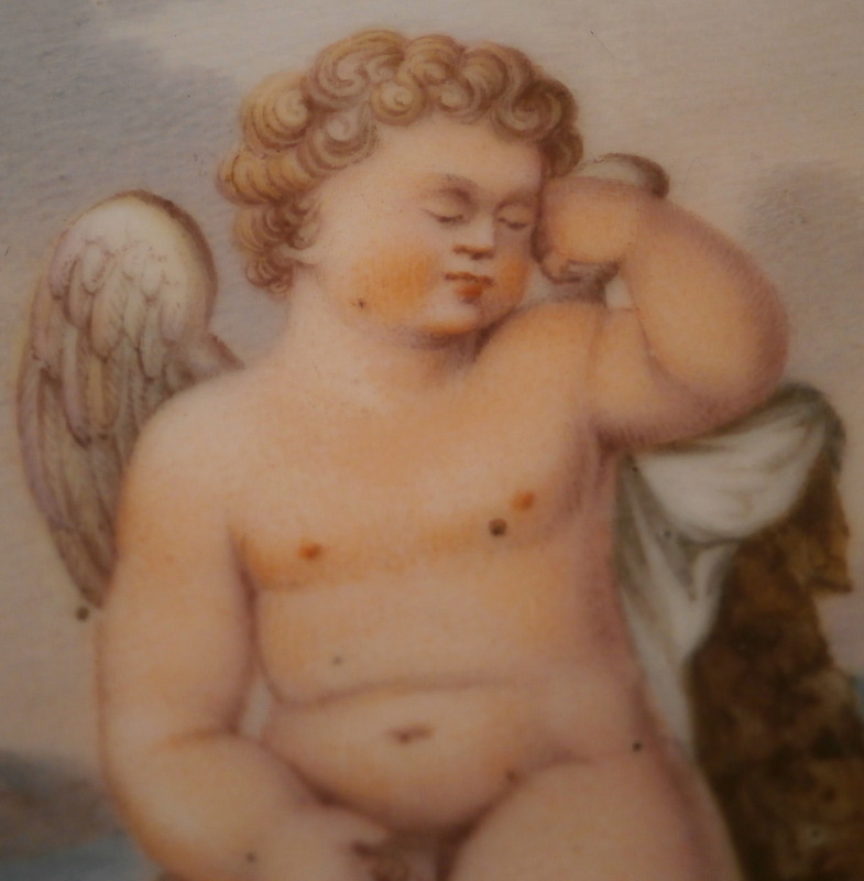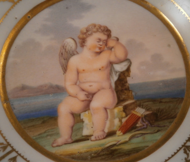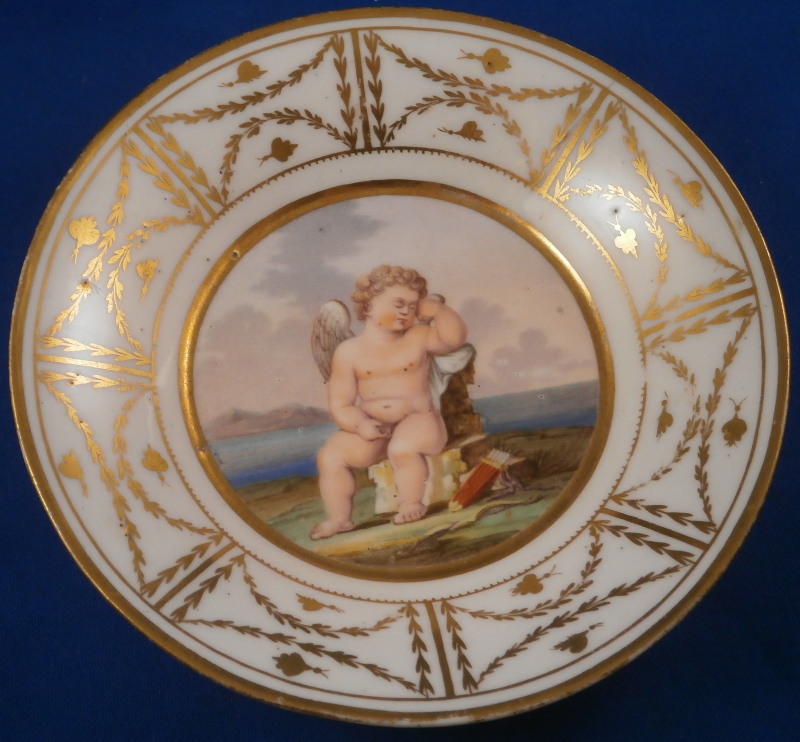 This is a rare cup and saucer made in Naples , Real Fabbrica Ferdinandea in about 1790. The Capodimonte factory existed near Naples from 1743 until 1759. It had little to do with the Naples factory which was founded by Ferdinand IV in 1771 and was around until 1806 when the French occupied it and after that the molds, etc. were sold all over the place. The set is hand painted with a superb scene of a cherub / amorini sleeping while sitting with his head resting on his hand. His arm is placed on a rock base he is sitting on with his quiver and bow by his feet. A lake in the background as well as some mountains. The well of the saucer has a gold ring around it and the rim has a nice gold trim to it. Same gold trim on the cup with a typically shaped handle for this maker. Nice gold design to the bottom inside fo the cup as well. I don't recall having seen a saucer that was so beautifully painted and then the cup just had the gold trim to it. Normally it would be the other way around. The porcelain is thin and of superb quality. It is made of hard paste porcelain though it is extremely fine in quality. The set is in perfect condition but has an old firing line to the rim of the saucer which is why you have those gold designs to the underside as shown. One covers that flaw and the others were painted to make it more even. This is not a newer hairline but from the original making of the piece! Some very minor wear to the gilding. The cup and saucer are not marked except for an incised A8 underneath the saucer as shown. The cup stands 2.375 inches tall, 2.25 inches in diameter. The saucer is 1 inch tall and 5.5 inches in diameter. Please email me for more information or other pictures.