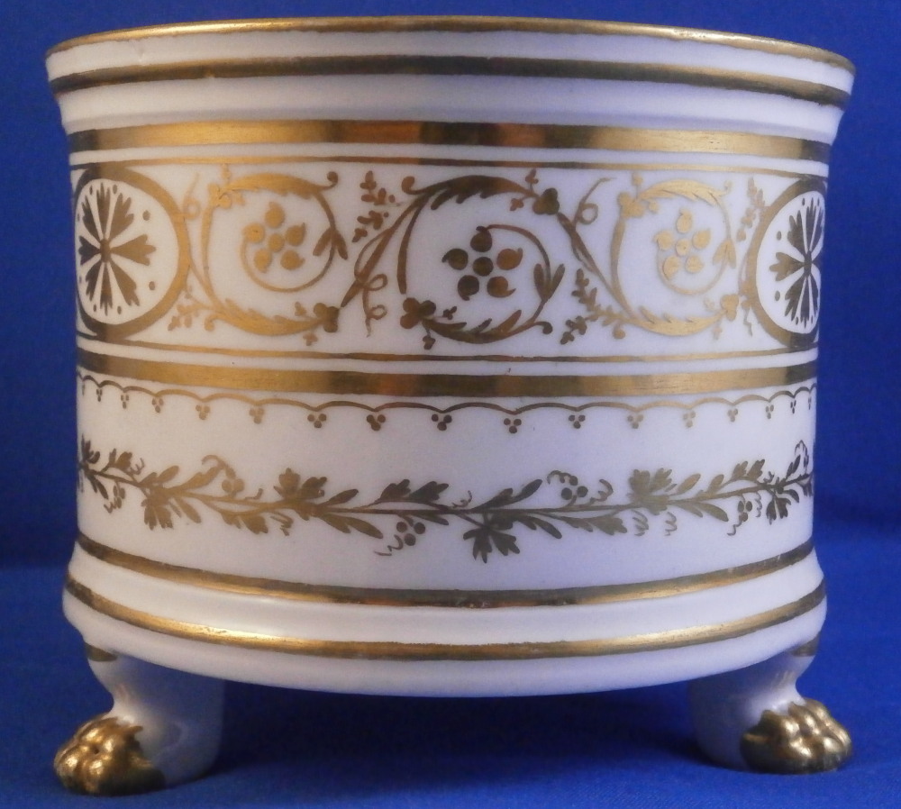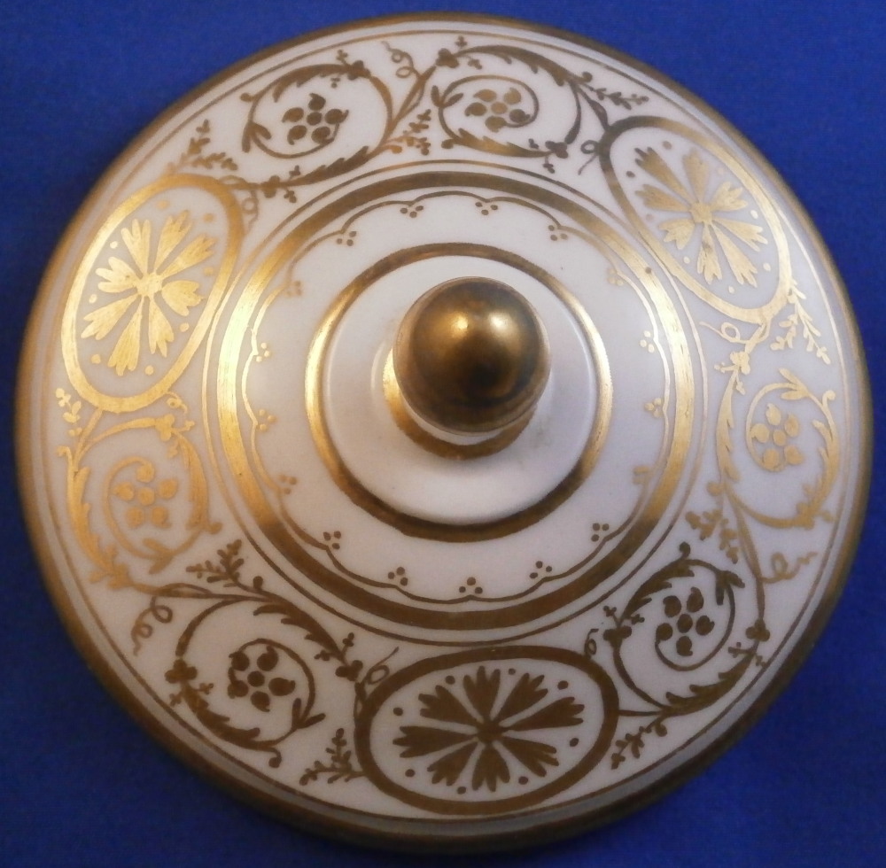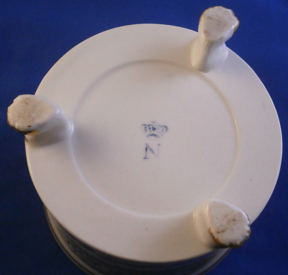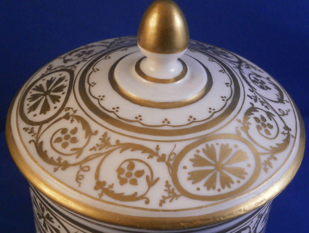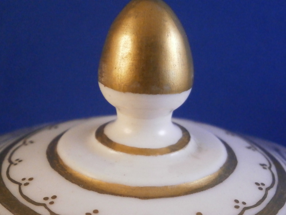 This is a nice lidded sugar dish made by Naples , Real Fabbrica Ferdinandea , in the 18th century. Not a maker one finds pieces from very often and it's not the most exciting piece ever but it looks great and is in superb condition! The entire main body and lid are hand painted with a fancy gold design and it sits on three claw or lion paw feet that are gilded as is the finial. Even the inside of the main body has a little gold design to the top part. It's a great looking piece and a rare survivor. The dish and lid are in superb condition with just a touch of very minor wear to the gilding. It is 4.875 inches tall including the feet and finial with a diameter of 3.625 inches. The lid is a tiny bit bigger in terms of diameter and the feet stick out a tiny bit from the edge as well. The main body is marked underneath with the crown over N mark in under glaze blue. Hand painted mark! Some incised marks to both pieces. I also ahve the matching creamer which I will list separately if anyone is intersted in a rare set. Please email me for more information or other pictures.