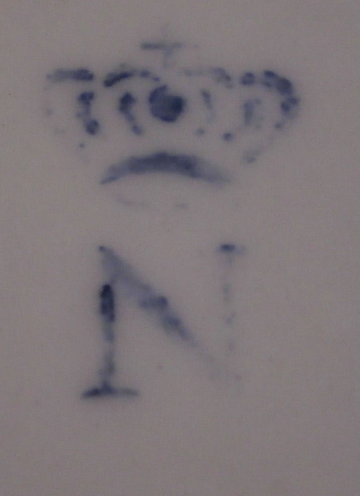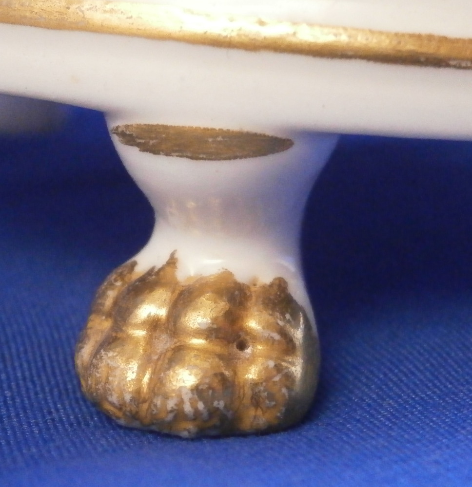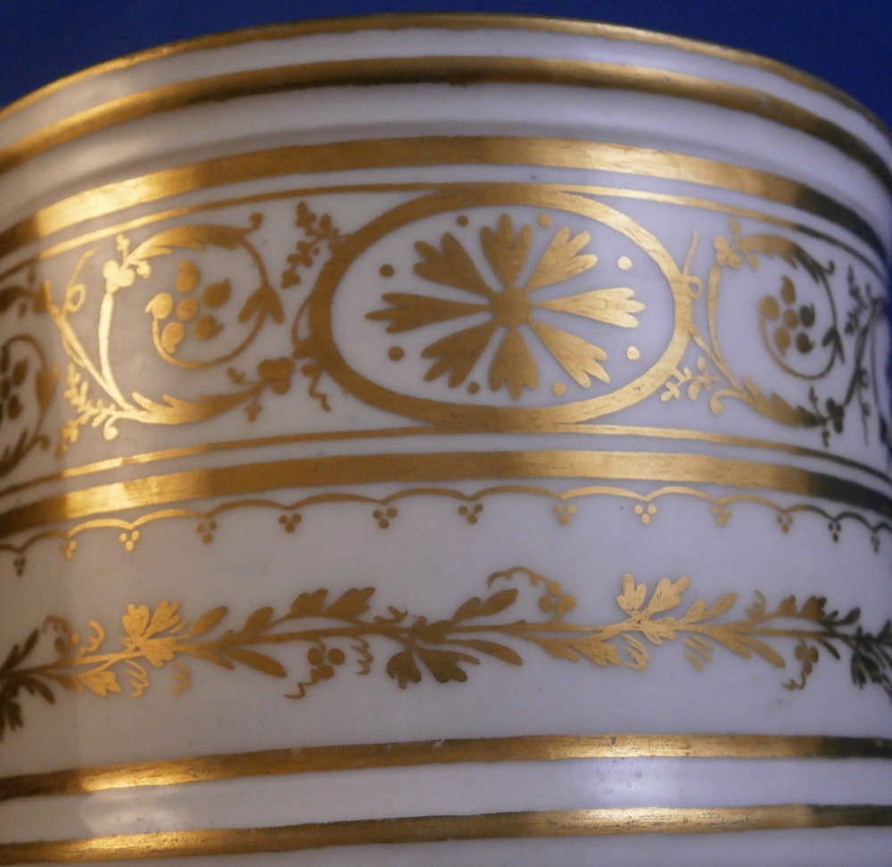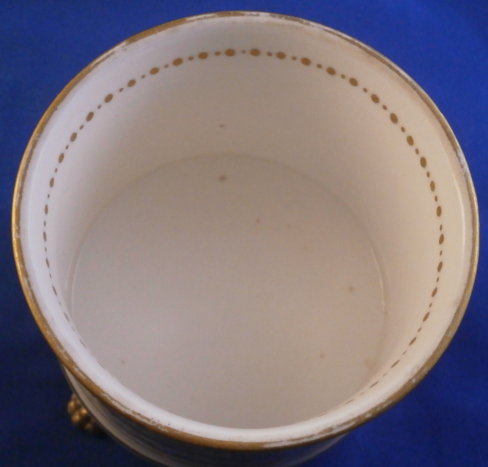 This is a nice lidded sugar dish made by Naples , Real Fabbrica Ferdinandea , in the 18th century. Not a maker one finds pieces from very often and it's not the most exciting piece ever but it looks great and is in superb condition! The entire main body and lid are hand painted with a fancy gold design and it sits on three claw or lion paw feet that are gilded as is the finial. Even the inside of the main body has a little gold design to the top part. It's a great looking piece and a rare survivor. The dish and lid are in superb condition with just a touch of very minor wear to the gilding. It is 4.875 inches tall including the feet and finial with a diameter of 3.625 inches. The lid is a tiny bit bigger in terms of diameter and the feet stick out a tiny bit from the edge as well. The main body is marked underneath with the crown over N mark in under glaze blue. Hand painted mark! Some incised marks to both pieces. I also ahve the matching creamer which I will list separately if anyone is intersted in a rare set. Please email me for more information or other pictures.