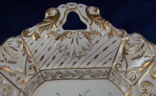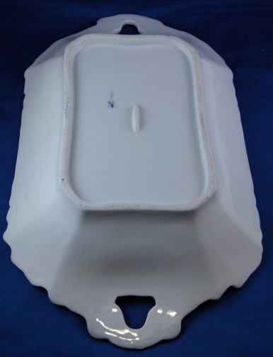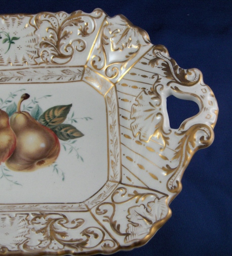 This is a superb serving dish made by Nathusius / Althaldensleben in about 1830. Althaldensleben was started by Gottlob Nathusius in about 1814 as an earthenware factory but soon (about 1826) converted to porcelain making. After his death in 1836 the factory was closed. It is rare to find pieces by this maker as they only made porcelain for a few years. The dish has a nice fruit scene in the center and a raised design to the sides which is highlighted with lots of gilding. A handle on each side and two small flowers on the rim as well. The tray is marked with the underglaze blue N with a line above it underneath. It is 2.25 inches tall, 13.5 inches long and 8 inches wide. The dish is in perfect condition with just a tiny bit of wear. Please email me for more information or photos.