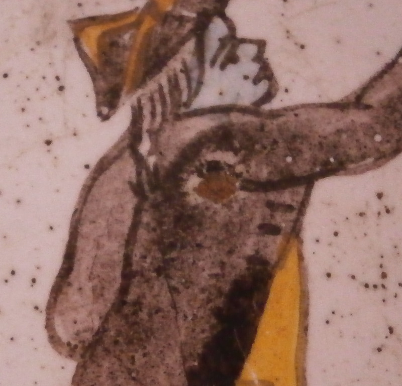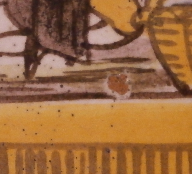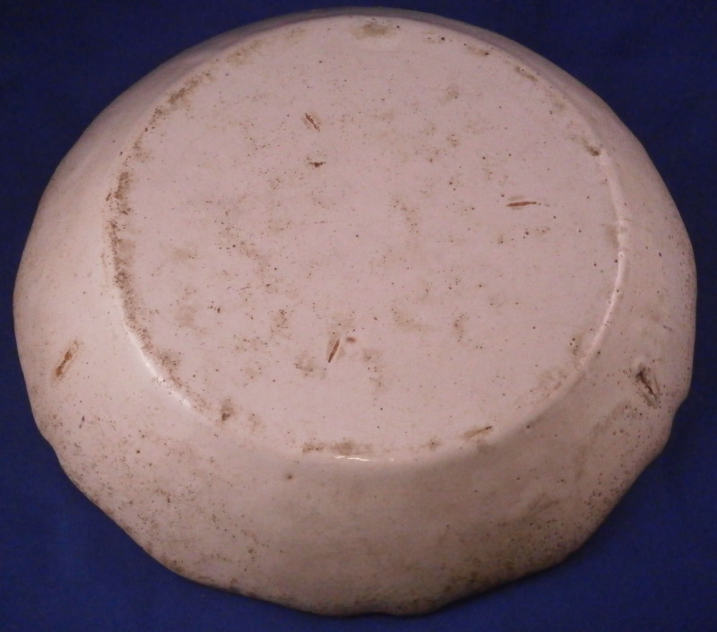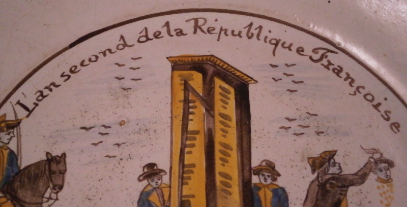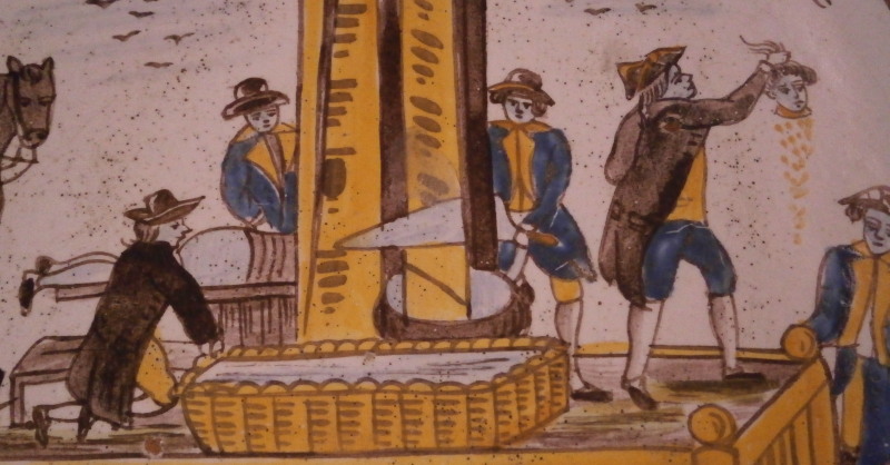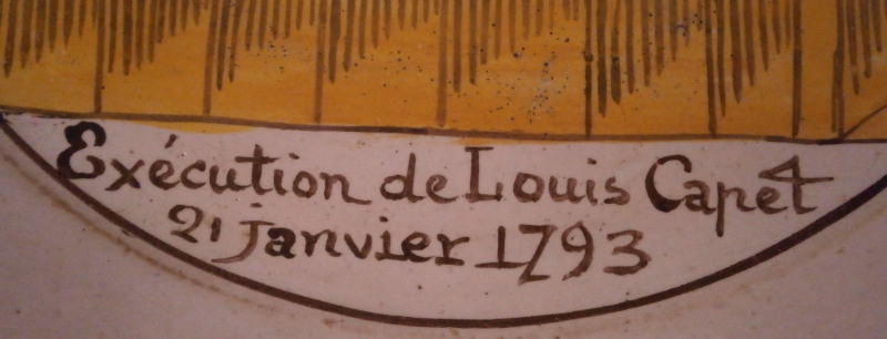 This is a rare faience bowl / plate made in Nevers around the late 18th century. It has a hand painted scene of the execution of King Louis the 16th on January 21 , 1793 . I don't know a whole lot of about this sort of ware but from everything I could find it looks to be a rare original period piece. I found an idential plate with more damage described at a French auction as ASSIETTE en faïence de grand feu polychrome " Exécution de Louis Capet 21 janvier 1793 " " L'An second de la République française " that sold for 4100 Euros. The bowl is in great condition for this sort of ware and age. It has a lot of little firing black spots and the rim has the glaze worn off. No chips or repairs or such. The scene has three tiny spots that do not have any glaze that look like some sort of firing support was in the bowl from when it was made. I am assuming they stacked multiple pieces on top of one another that way when they fired them as there are more spots on the underside from supports. Something a little different from what I usually buy and a whole lot more macabre :) I guess this is how they spread the news back in the day. The piece is unmarked but is definitely from the Nevers region of France. It is 1.5 inches tall with a diameter of about 9 inches. Please email me for more information or other pictures.