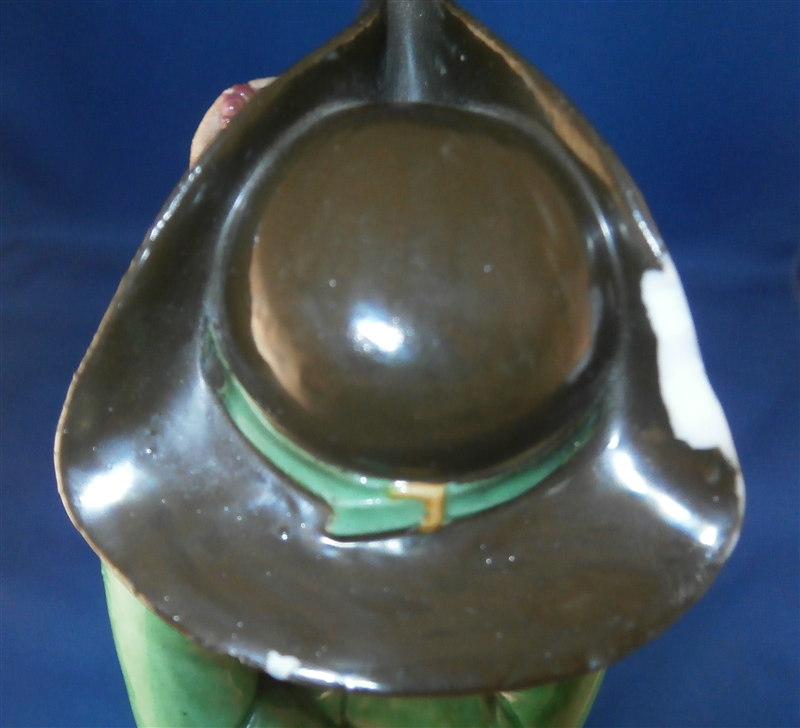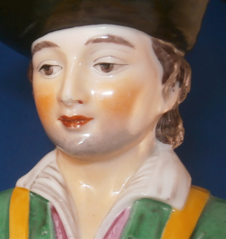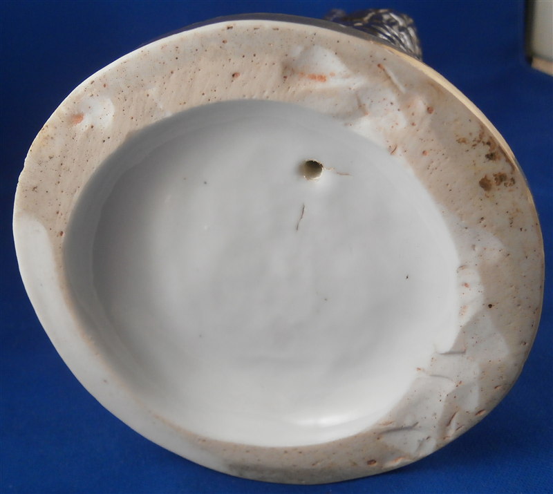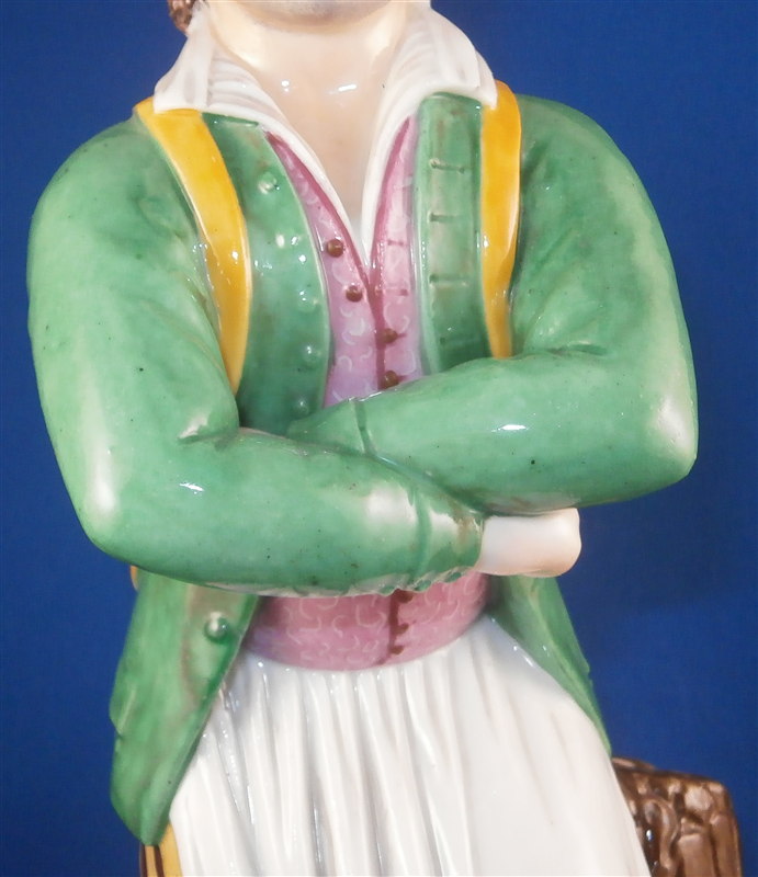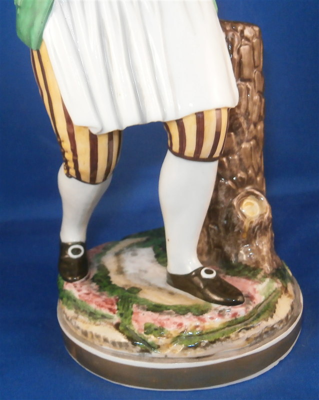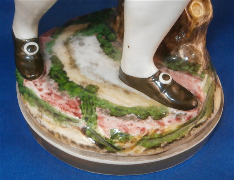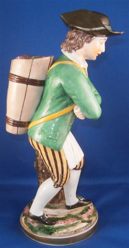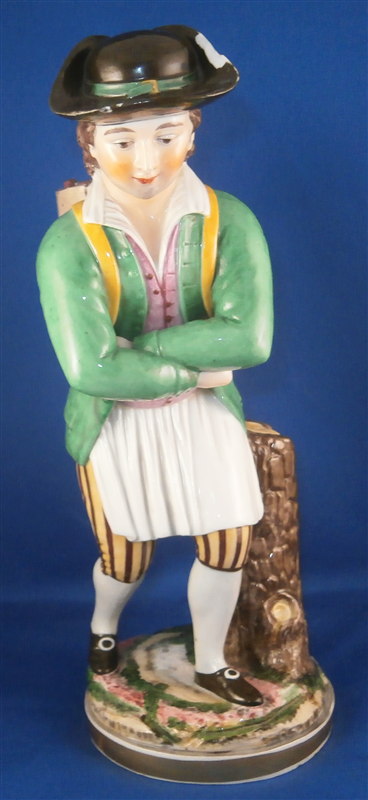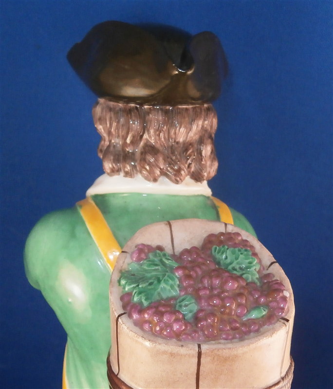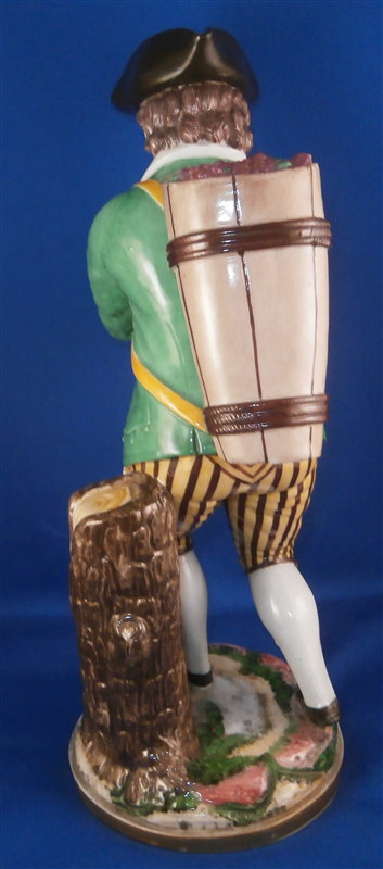 This is a large figur of a gentleman harvesting grapes made by Niderviller around 1800. The gentleman is dressed nicely, is wearing a hat, has a basket full of grapes on his back all while being next to a tree trunk on a nicely done base which is typical for this maker. The figurine is unusally large with some nice details and hand painted to perfection. There is the typical rock work as well as the gold trim on the base. The piece is extremely solid and heavy but unlike their smaller pieces this one has an airhole in the base. The figure is in great condition with chipping to the hat most of which wouldn't be seen if covered by black paint and chipping to the udnerside base likely from grinding it because the base wasn't quite even after firing. 99.9% of that cannot be seen when he stands on a flat surface. He displays superbly as none of these issues are distracting. Nice to have a pair of these as I also have the lady figurine! As is the case with most of their figurines he is unmarked. The figurine is 10.625 inches tall and the base has a diameter of 4.125 inches. Please email me for more information or other pictures.