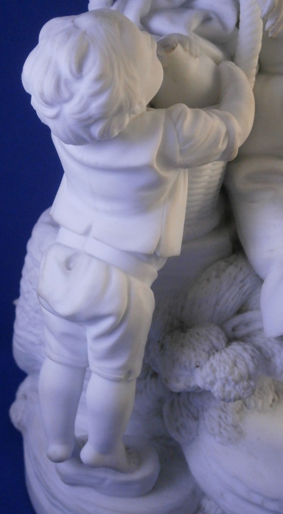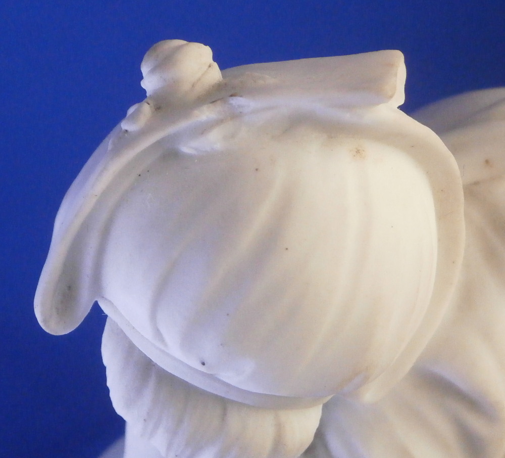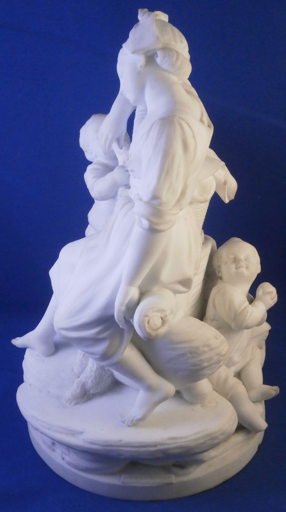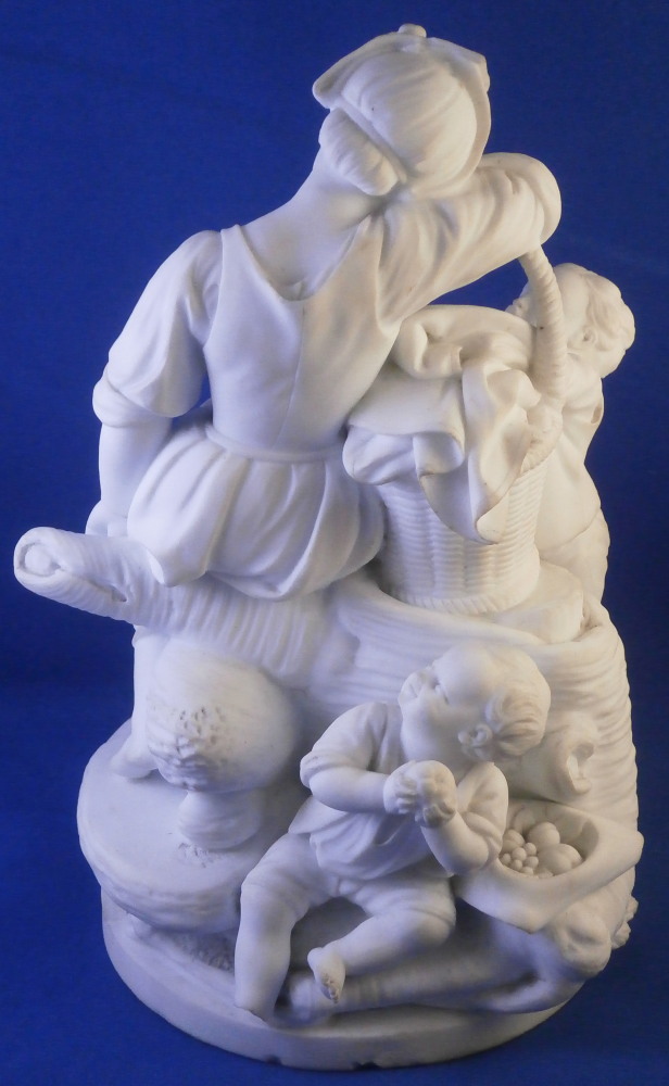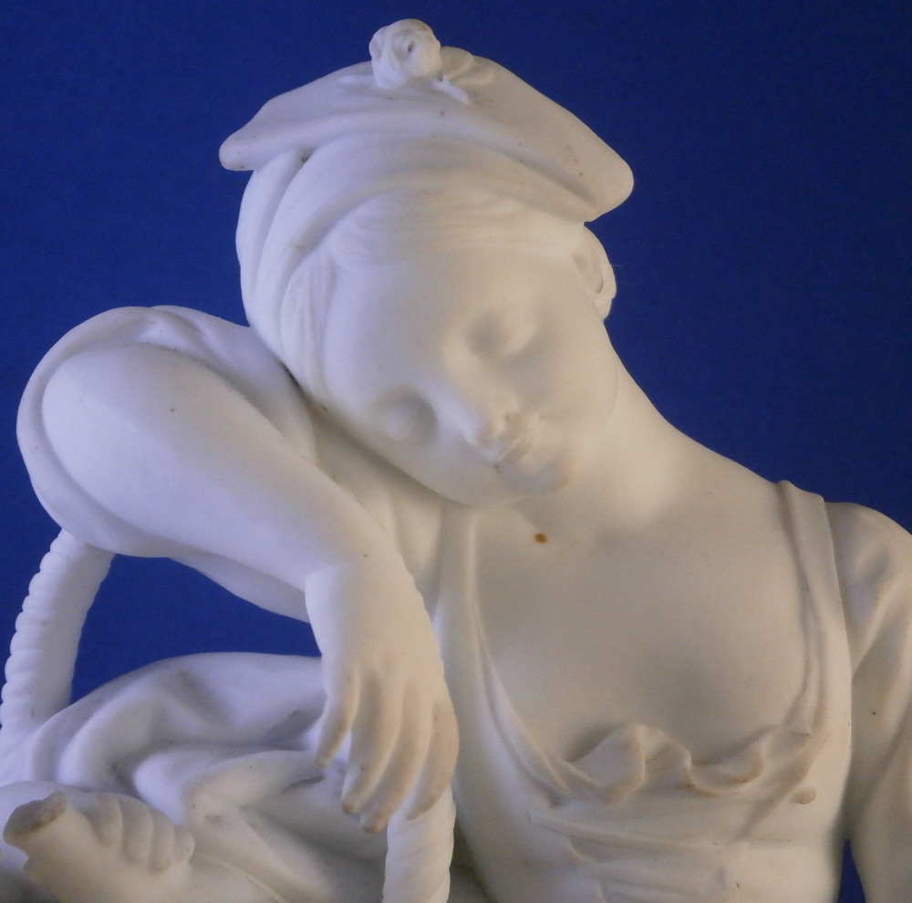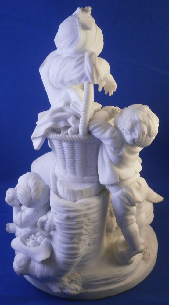 This is a really ncie figurine made by Niderviller in the late 18th century. Made in unglazed or biscuit porcelain it is of a lady that has fallen sleep while sitting on a tree branch and her two young children are up to no good - one of them taking a piece of fruit from a hat filled with fruit and the other taking a sip of wine (I assume) from a flask in her basket. These biscuit pieces are superb as the detail is so much nicer than on glazed pieces. The figures are on a typical base with rocks and greenery to it. The piece is in great condition but does have a few issues. There is a bit of damage to her hat, the tip of the bottle is damages a tiny bit and the boy in the back is missing his right foot plus some minor chips to the bottom edge of the base in that same area. All in all in great shape and it looks amazing when displayed. The figure is marked which is fairly rare. It has the little plaque with the name NIDERVILLER on it as shown. The figurine is about 8.375 inches tall and the base is about 5 inches in diameter. An old museum ID underneath in red as shown. Please email me for more information or other pictures.