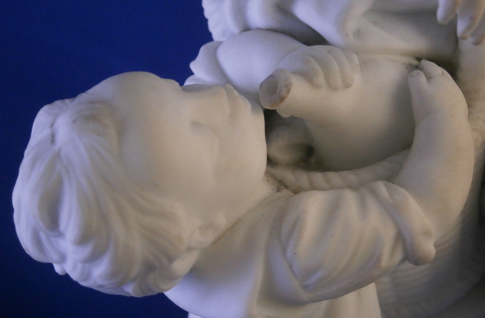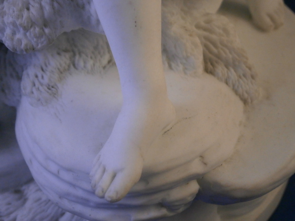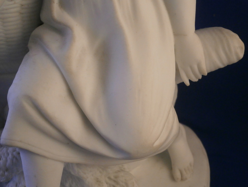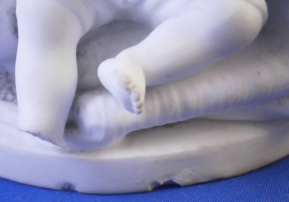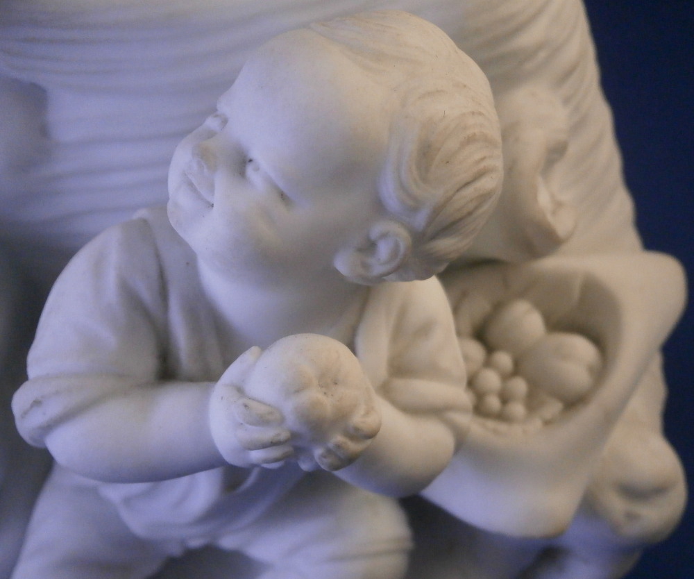 This is a really ncie figurine made by Niderviller in the late 18th century. Made in unglazed or biscuit porcelain it is of a lady that has fallen sleep while sitting on a tree branch and her two young children are up to no good - one of them taking a piece of fruit from a hat filled with fruit and the other taking a sip of wine (I assume) from a flask in her basket. These biscuit pieces are superb as the detail is so much nicer than on glazed pieces. The figures are on a typical base with rocks and greenery to it. The piece is in great condition but does have a few issues. There is a bit of damage to her hat, the tip of the bottle is damages a tiny bit and the boy in the back is missing his right foot plus some minor chips to the bottom edge of the base in that same area. All in all in great shape and it looks amazing when displayed. The figure is marked which is fairly rare. It has the little plaque with the name NIDERVILLER on it as shown. The figurine is about 8.375 inches tall and the base is about 5 inches in diameter. An old museum ID underneath in red as shown. Please email me for more information or other pictures.