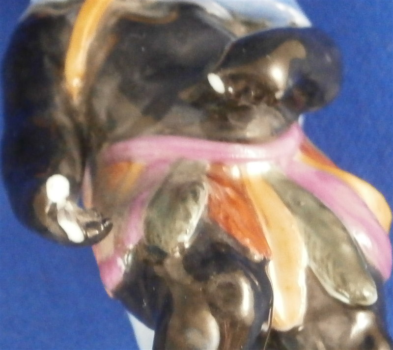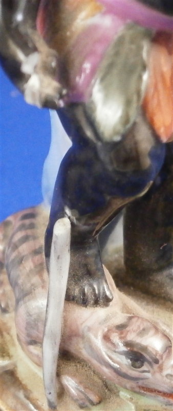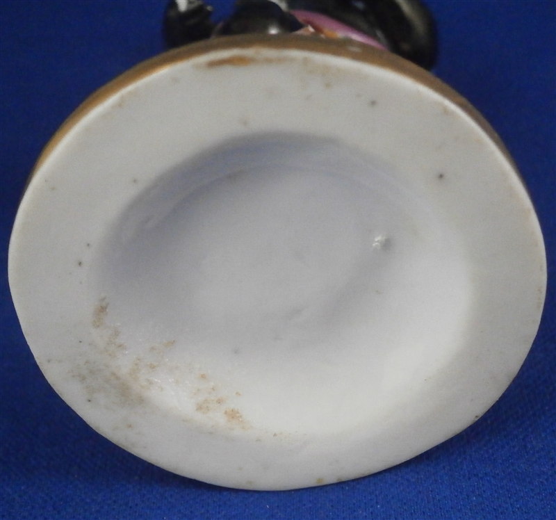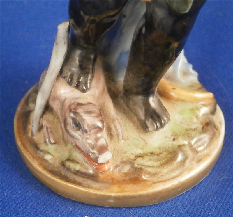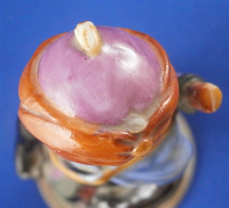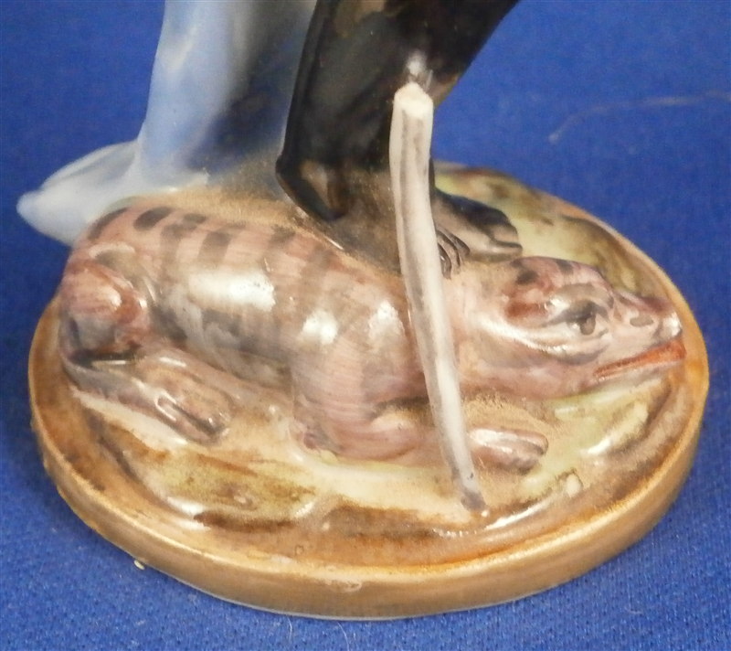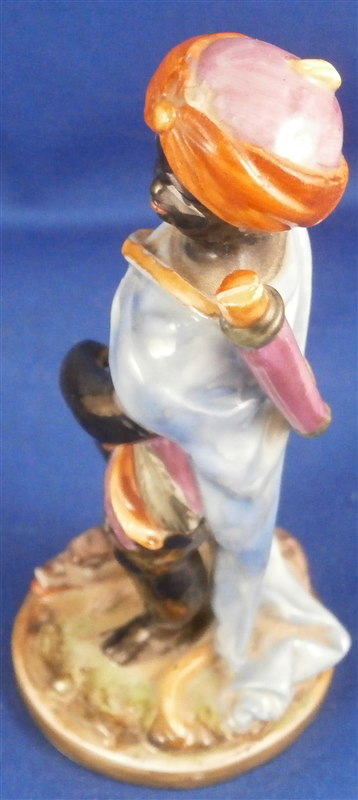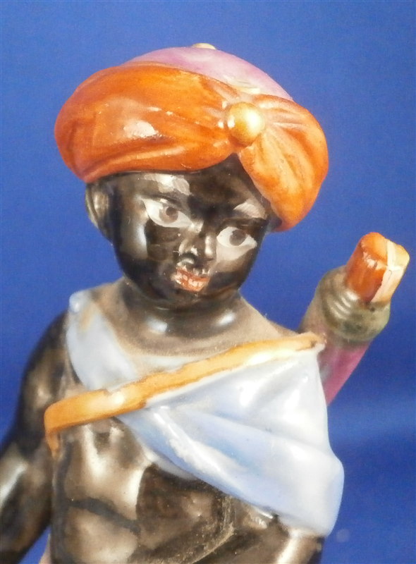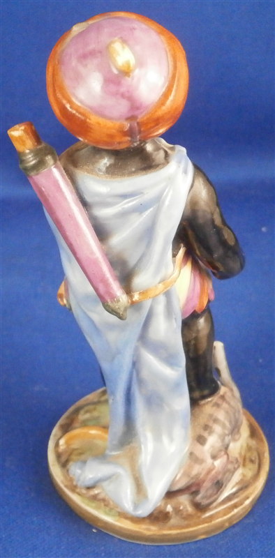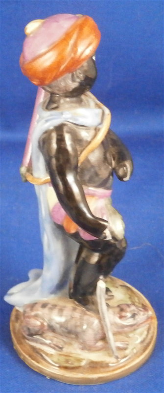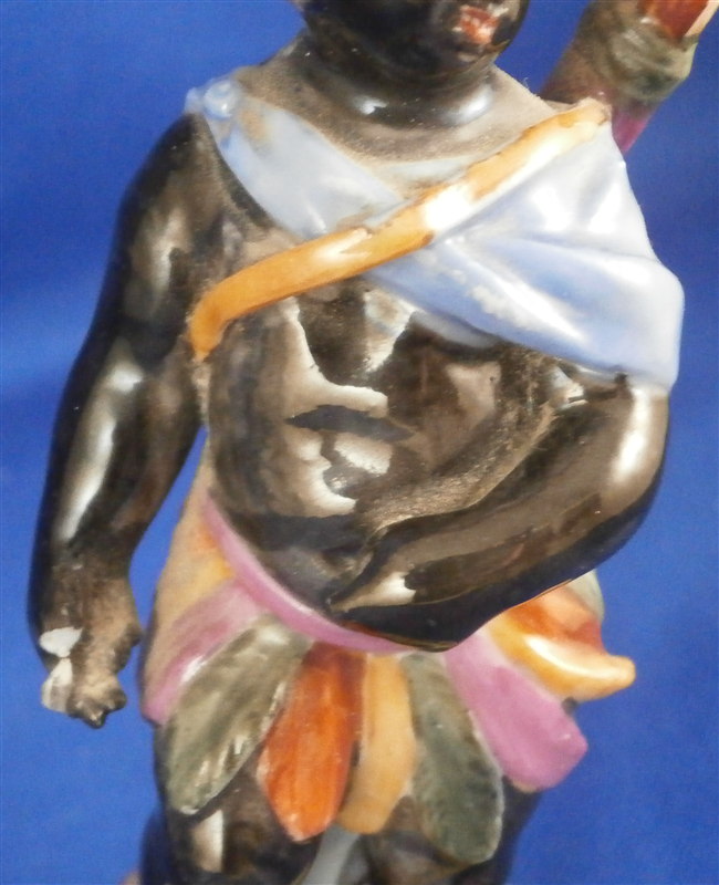 This is a great figurine of a blackamoor made by Niderviller around 1800. The figure likely is meant to represent Africa as a continet with the guy wearing a feather dress, a turban on his head, a quiver on his back with a bow in his hand while standing on a typical rock base with one foot on a crocodile or some sort of lizard. A really nice and detailed piece. The figure is in decent condition with a lot of the grey bow missing, damage to the fingers as shown, the turban likely had a feather in the front which is gone and the very tip of the snout of the lizard has a chip. Still displays very well and would be an easy fix if need be. Different from ost pieces one sees by them. As is the case with most of their figurines he is unmarked. The figurine is 4.125 inches tall and the base has a diameter of 1.875 inches. Please email me for more information or other pictures.