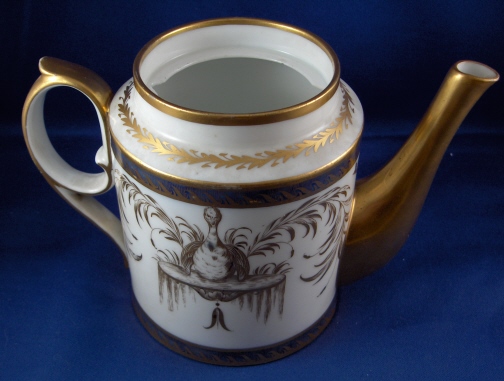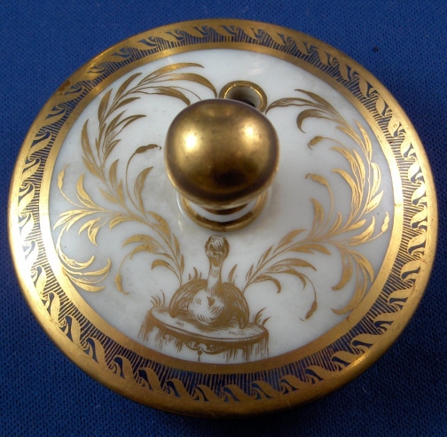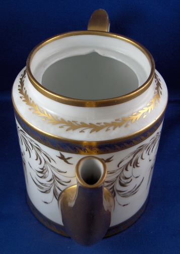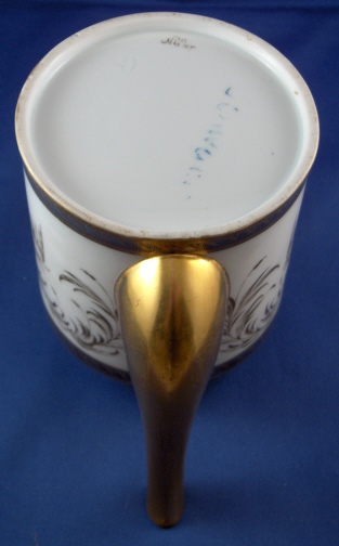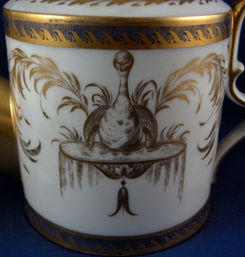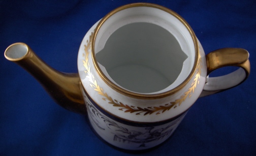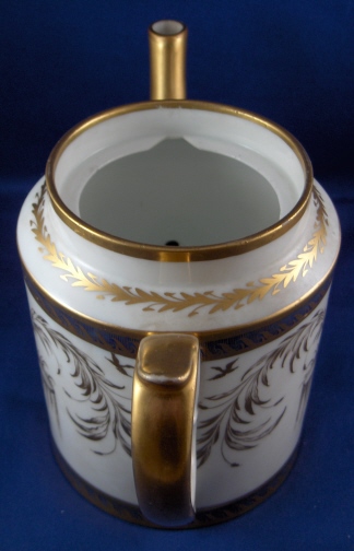 This is the matching teapot for the two cups I have on the site. It was made by Niderviller around 1780 and is handpainted with an underglaze blue double line which is highlighted by a gold design made to look like waves. Between the two stripes is a handpainted fancy gold design of a duck sitting on a small overflowing water design on either side with some foliage between them and four small flying ducks above that. The lid has the same design on it as well. The pot is marked with the gold script Nider mark short for Niderville which was sometimes used back then. There is also a script G or Q incised underneath but I am not sure of what it is exactly. The teapot is in superb condition with only the tiniest amount of wear to the gilding! There is a small chip to the inside rim of the lid which cannot be seen unless you take it out and the two small points that hold it in palce are a little chipped. The pot and lid are about 5.75 inches tall and 4 inches in diameter. Please email me for more information or other pictures.