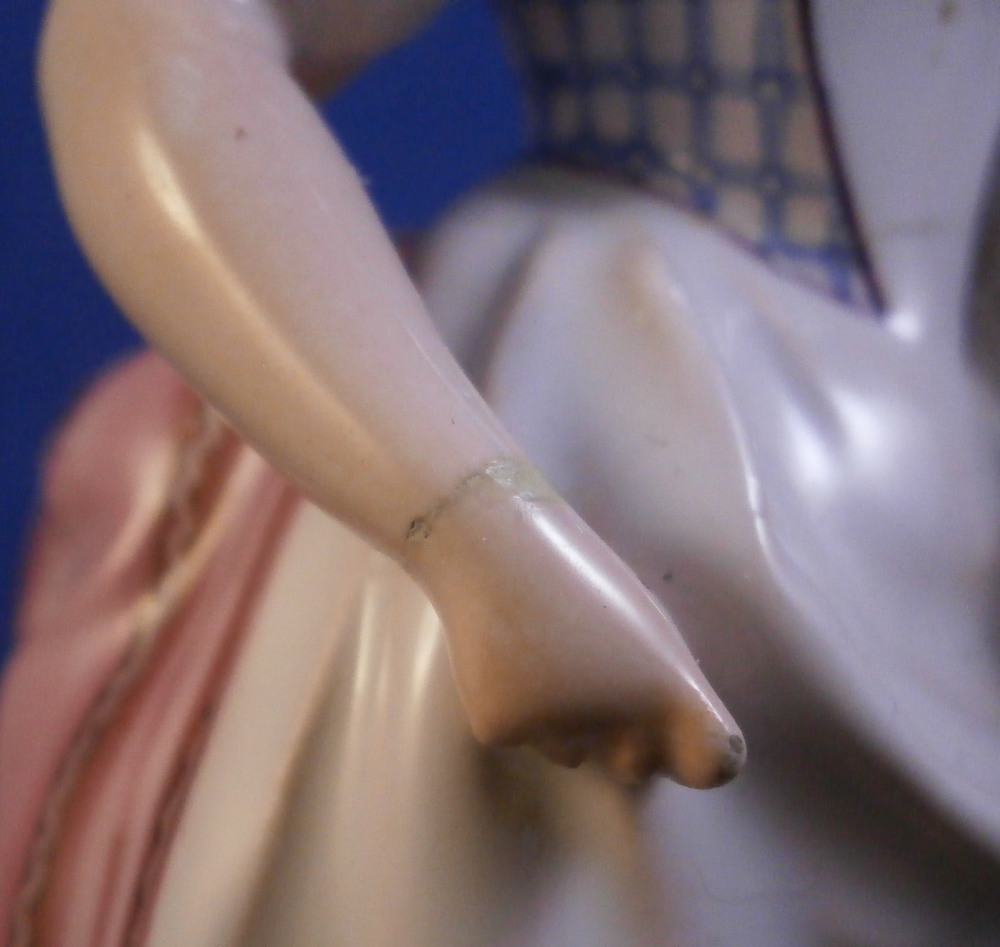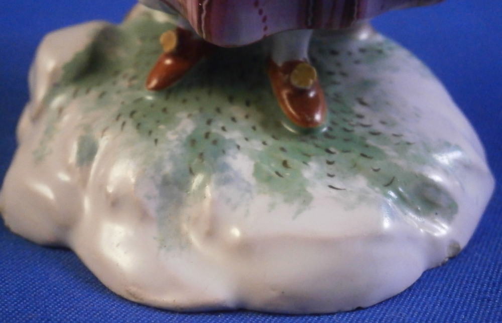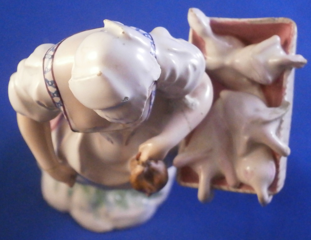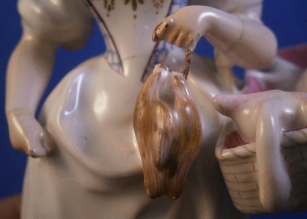 This is a rare faience / earthenware figurine made by Niderviller in the 18th century during the Count of Custine period (1770-1793). It is of a poultry seller - a lady is holding a bird in her left handwith a basket on that same side filled with plucked birds. She is nicely dressed and standing on a typical base for this maker! The piece is nicely modeled and hand painted superbly. It is rare that I find faience figures that are as good as porcelain pieces in terms of quality of the painting. A truly superb example! The figure displays nicely but has some issue though they are hard to spot. I do believe she was broken through the waiste which also means she is broken through with arms near the hands.The neck was broken and there used to be a handle on the basket that went over her arm. A couple of minor chips to the hat and a chip to the edge of the basket. Some issues but she really does display superbly and the breaks are very clean so it would be a breeze for a good restorer to hide these issues perfectly. The figurine is not marked which is normal but does have an old museum ID under it as shown. The figurine is 5.5 inches tall, 3.25 inches wide and 2.25 inches deep. Please email me for more information or other pictures.