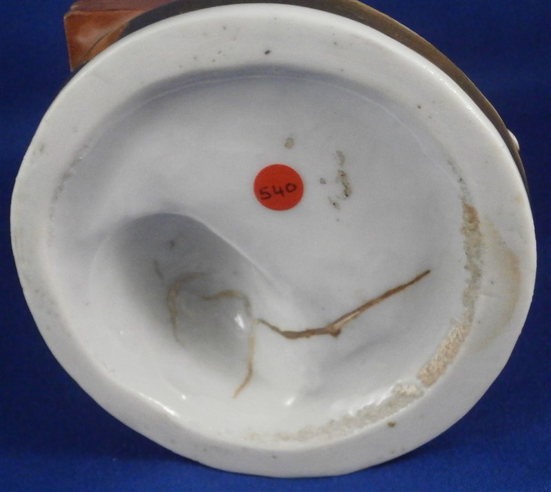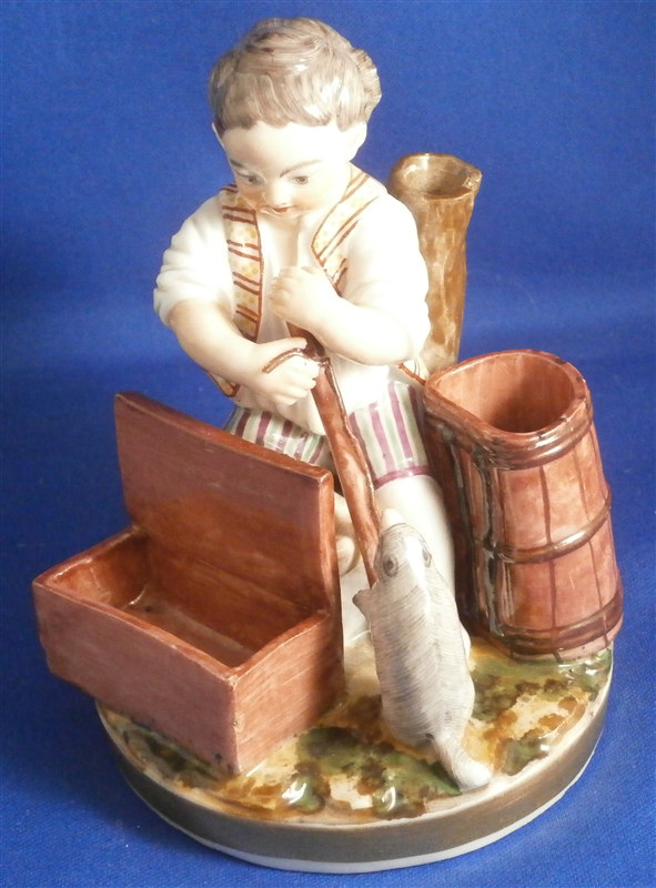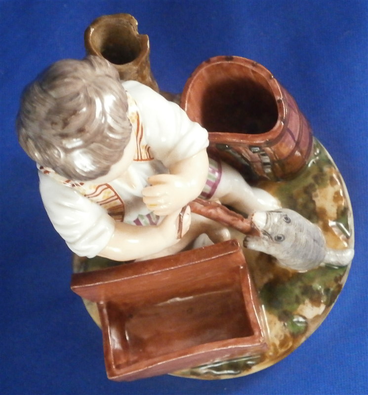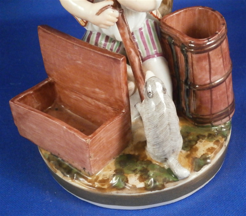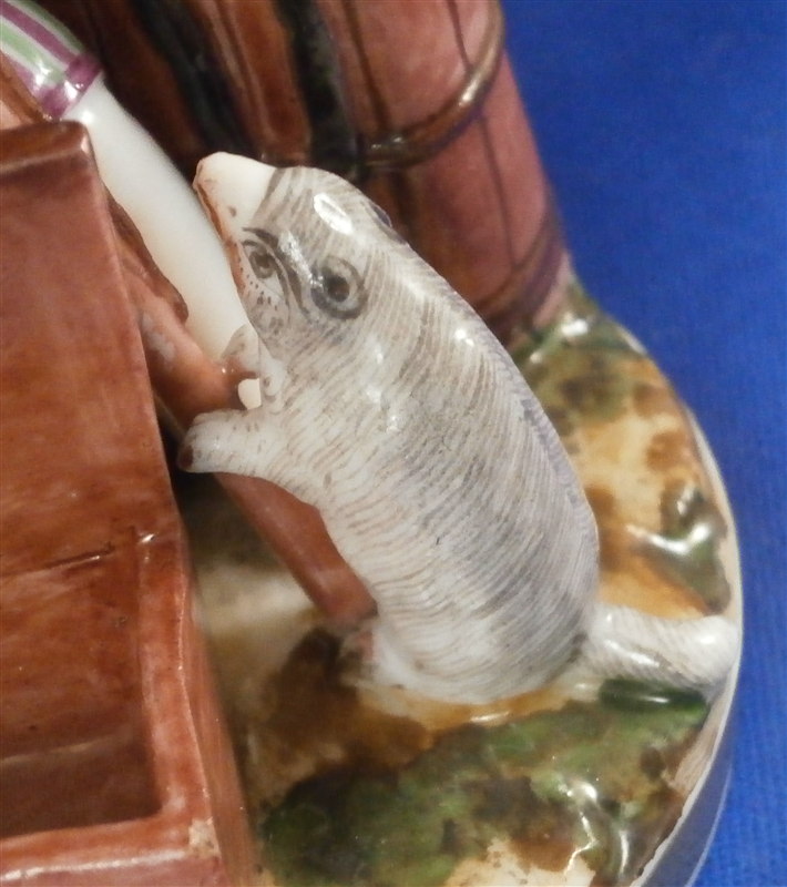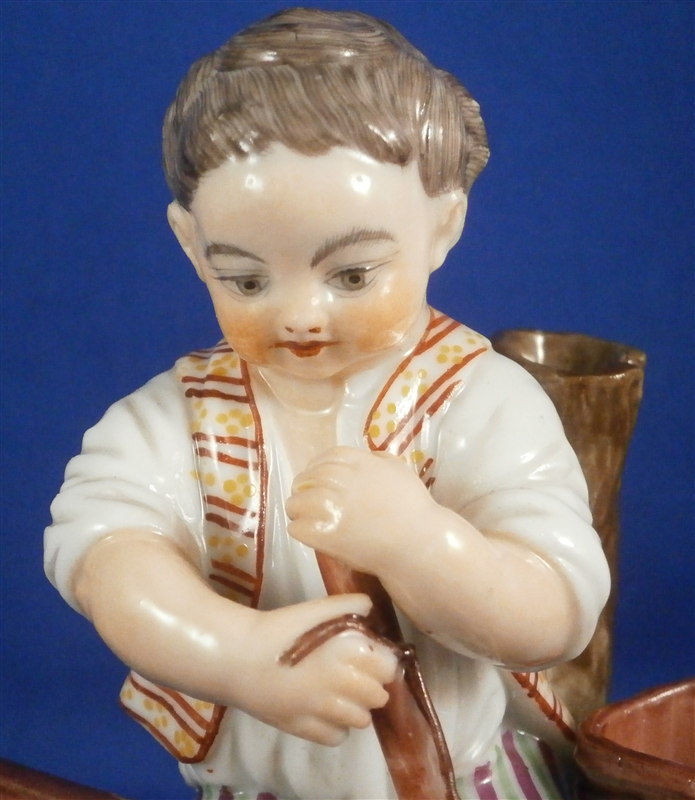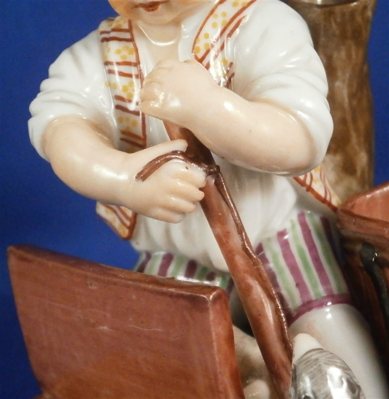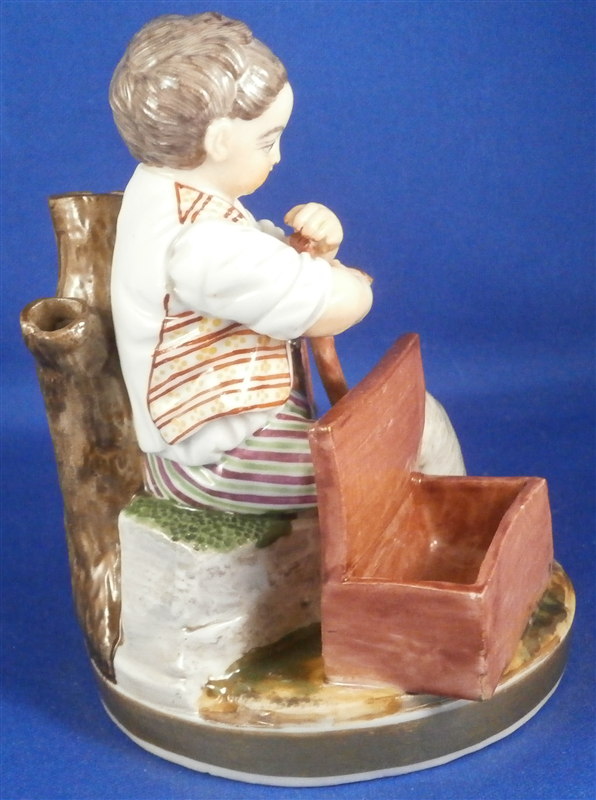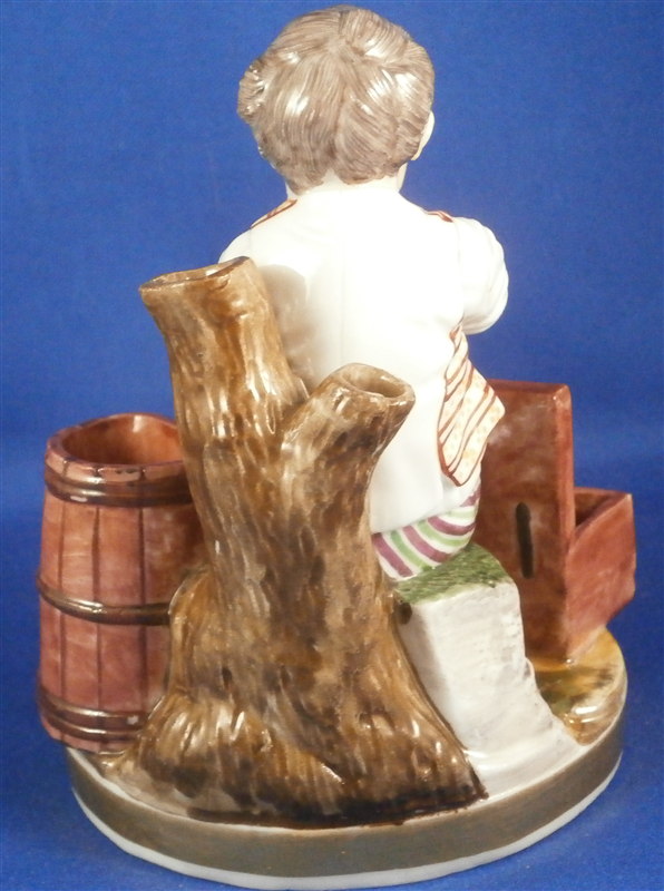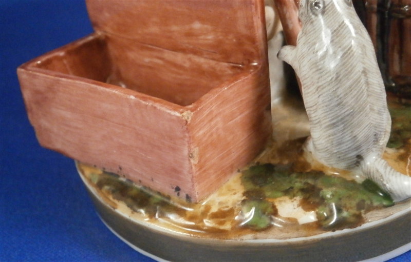 This is a superb figurine of a boy with a rat or something along those lines by his feet made by Niderviller around 1800. The boy is holding a stick in his hand with a line along it which might have formed a noose at the end I think. There is an open chest in front of him, an open barrel to his side and open tree trunks behind him. I think this piece was meant as a spillvase or match holder or something like that back in the day as there would be room for sticks and matches as well as ashes or burned up matches. The figurine is superbly modeled and handpainted in the typical fashion for this maker. A solid and heavy piece for its size as they did not use air holes during the firing process. There is the typical rock work as well as the gold trim on the base. The figure is in great condition with only the noose missing which I am not sure was ever there and three very very minor chips to the edge of the chest. As is the case with most of their figurines he is unmarked. The figurine is 4.5 inches tall and the base has a diameter of 3.25 inches. Please email me for more information or other pictures.