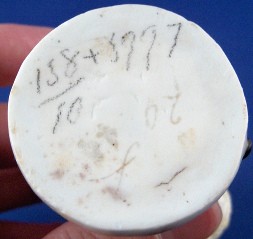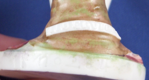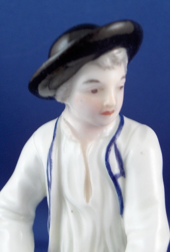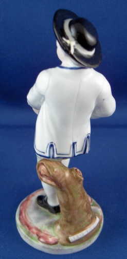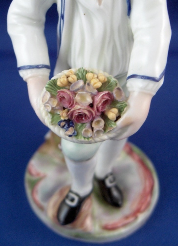 This is a figurine of a gentleman holding a basket of flowers made by Niderviller around 1800. Again a very typical base for this time period - a grassy base with a rock and a tree stump in back. The piece is made of one solid piece of porcelain without an airhole. He is in good condition for his age with a very well done restoration to part of his hat, neck and left side of his face but the head was never off. Also some damage to the bows on his pant leg bottoms. Marked to the back with the raised word Niderville on a white rectangle. He is 5 inches tall, 2 inches wide and 2.25 inches deep. Please email me for more information or other pictures.