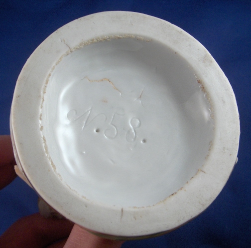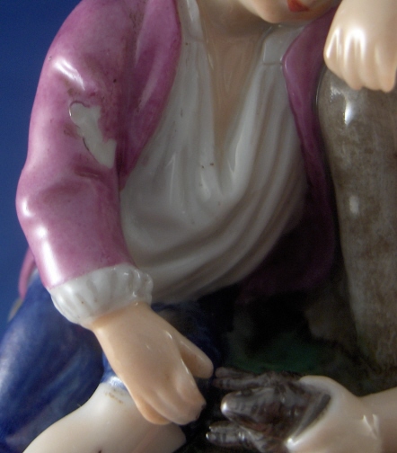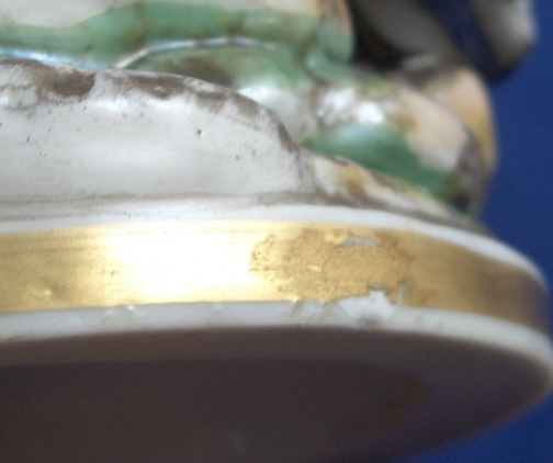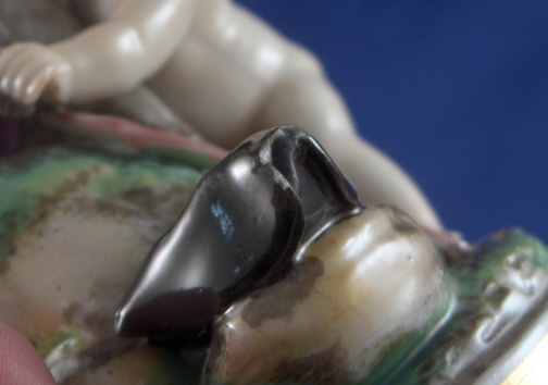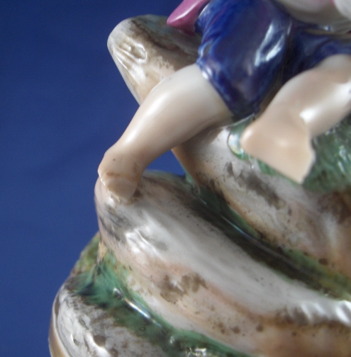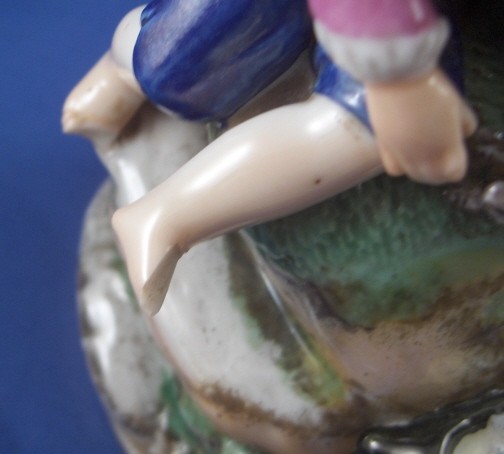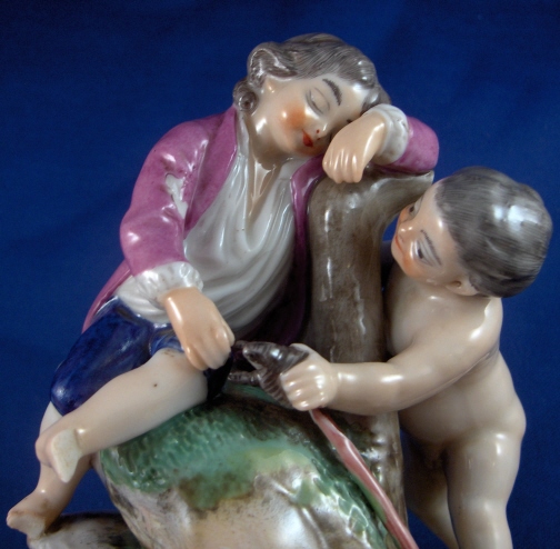 This is a superb figurine of a sleeping gentleman and a nude putto made by Niderviller around 1800. The putto or nude boy is holding a turtle (or maybe a crab of some sort) near the sleeping man's hand to maybe snap at him and wake him/scare him. The figurine is very detailed and painted nicely. There is the typical rock work as well as a hat filled with fish and a cane. Gold trim to the bottom rim. The piece is extremely solid and heavy being made of one solid piece of porcelain. The figure is in good condition for its age with the feet of the gentleman chipped, the corener of the hat chipped the tip of the stick missing which connected to the man's sleeve and might have been a fishing net. Also the two branches of the tree are gone and a gilded over chip to the bottom rim. The damage sounds worse than it is because the figurine still displays superbly! It is marked underneath with an incised N.58. and is 5.375 inches tall and 3.75 inches in diameter. Please email me for more information or other pictures.
