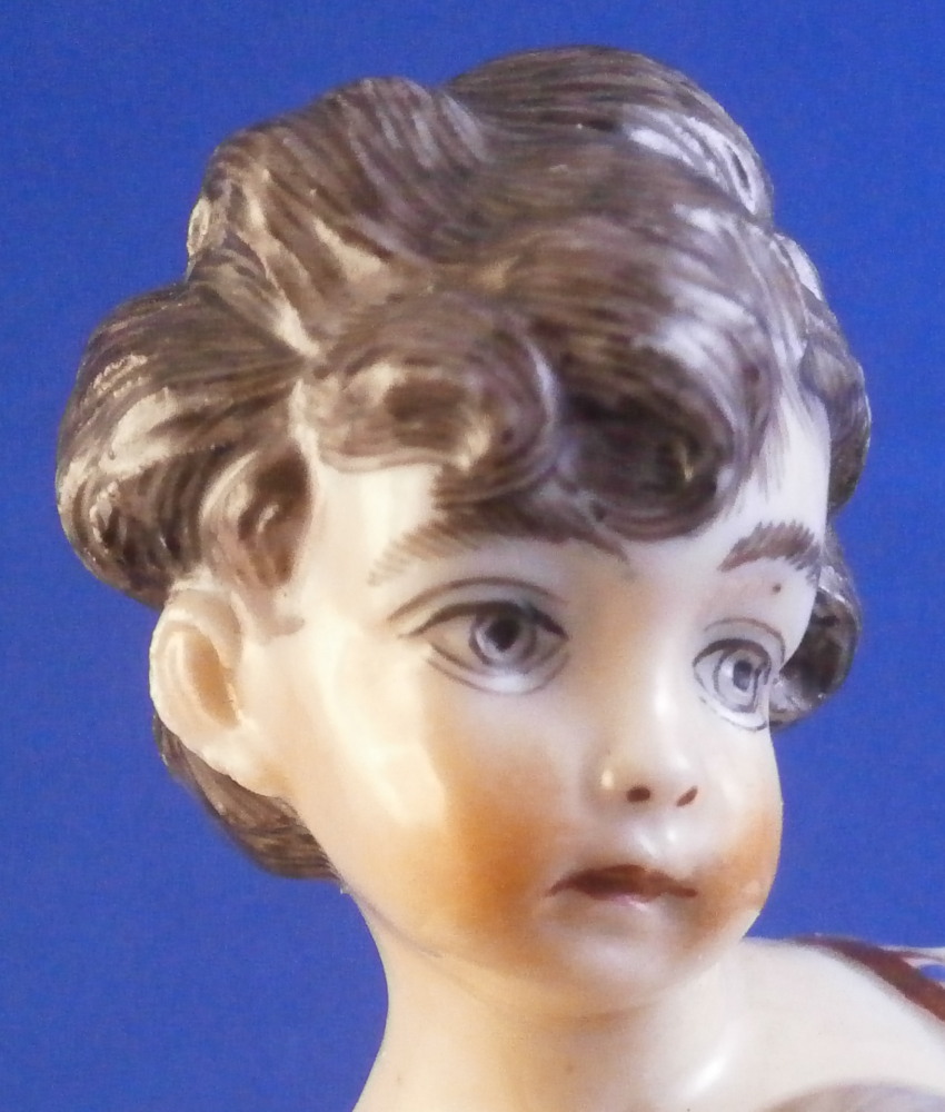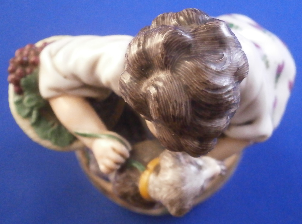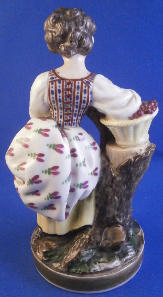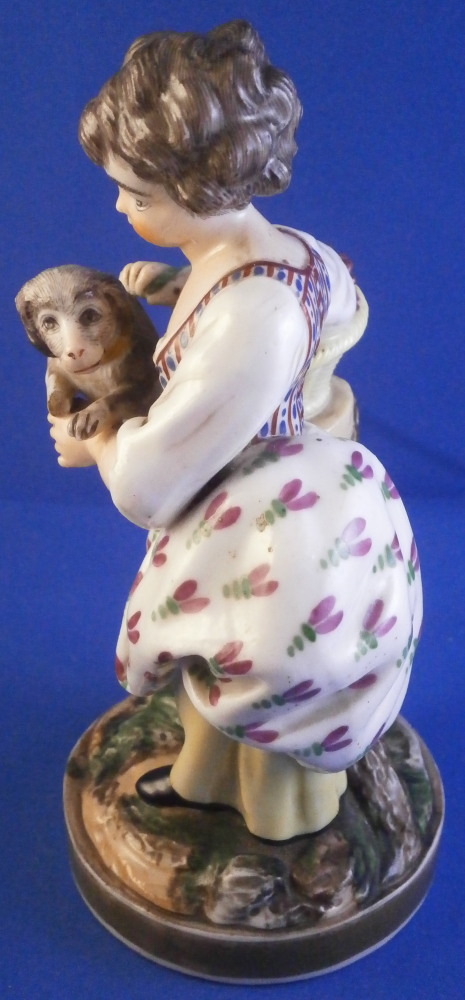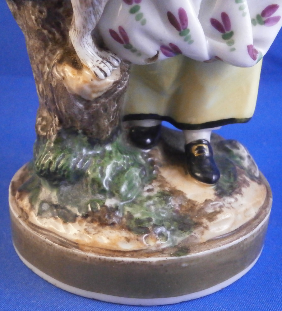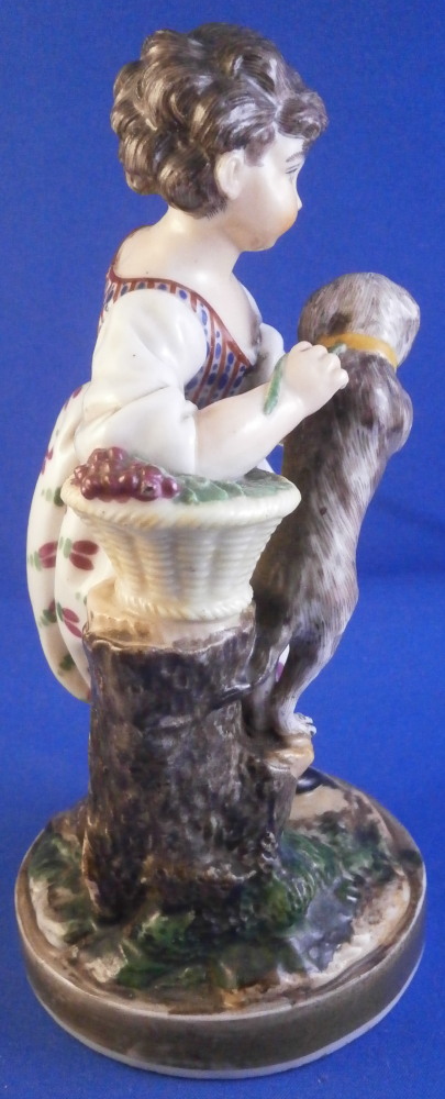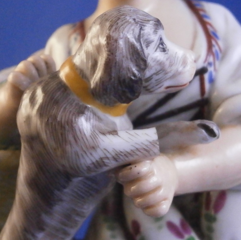 This is a great figurine of a lady playing with her dog made by Niderviller around 1800. The lady is dressed in a very nice floral dress, is leaning on a basket with grapes in it and has her dog standing on his hind legs in front of her on a leash with his front paws on her left hand. Very nice and I think this was originally a Sevres model. The figurine is very detailed and painted nicely. There is the typical rock work as well as the gold trim on the base. The piece is extremely solid and heavy being made of one solid piece of porcelain. The figure is in great condition with the right front paw missing as shown. Obviously a fargile part as I have another of these figures where the left paw is missing. Little bit of wear to the gilding around the base. The figure displays nicely! As is the case with most of their figurines she is unmarked. The figurine is 6 inches tall and the base has a diameter of 2.75 inches. Please email me for more information or other pictures.