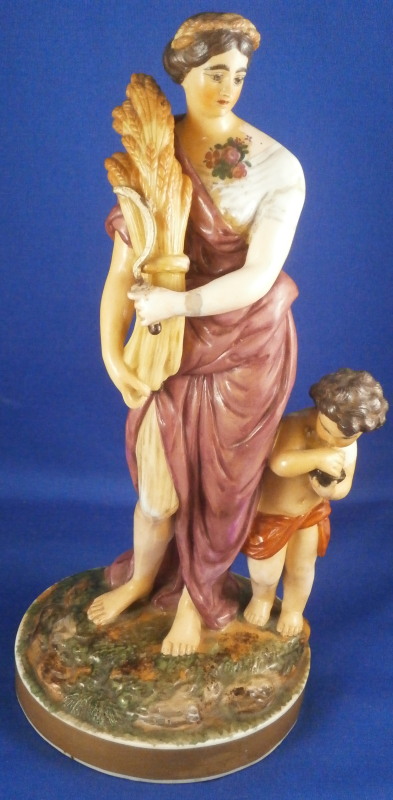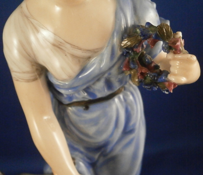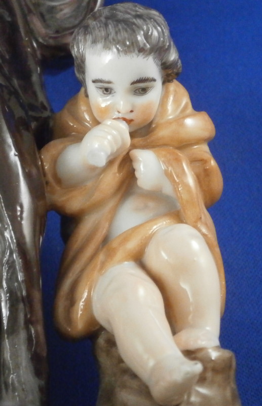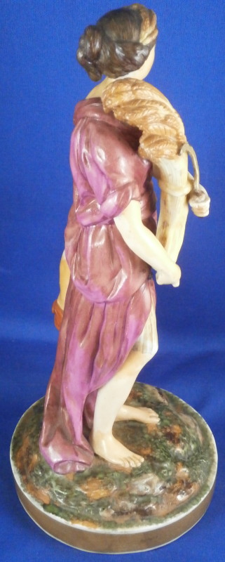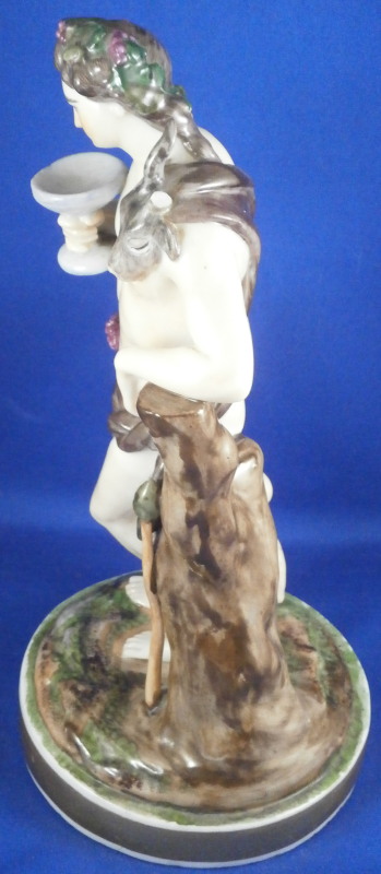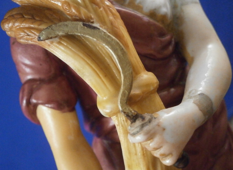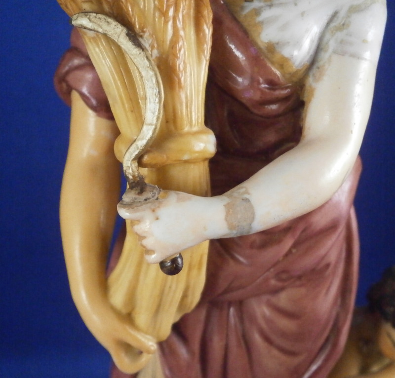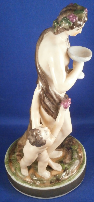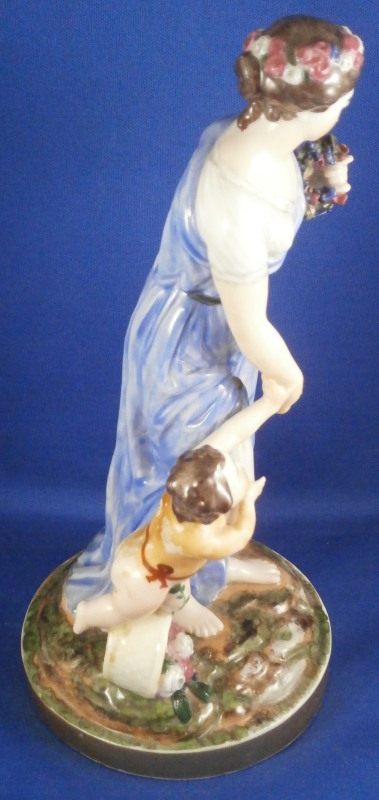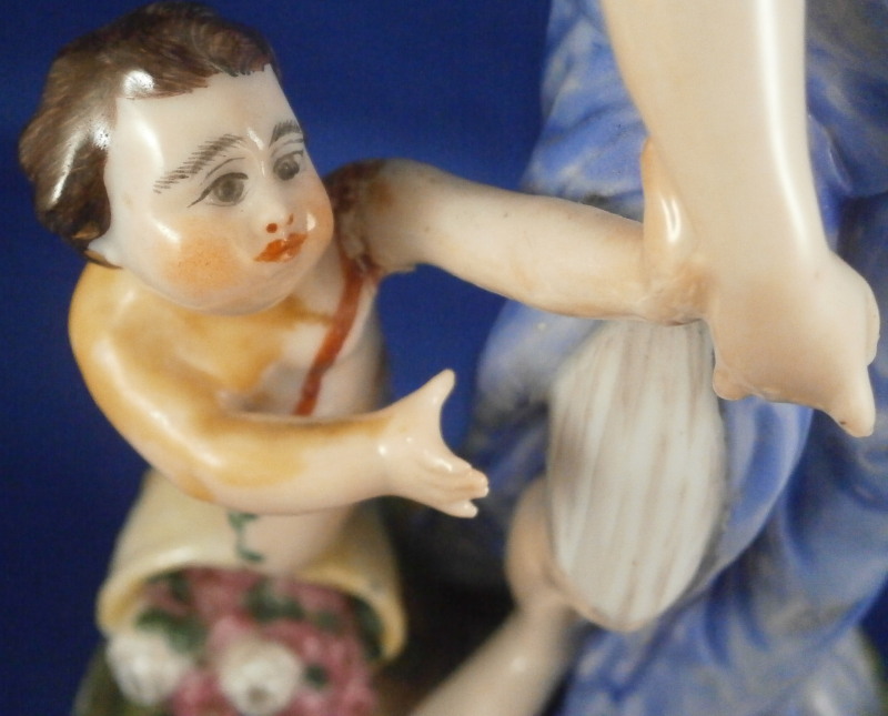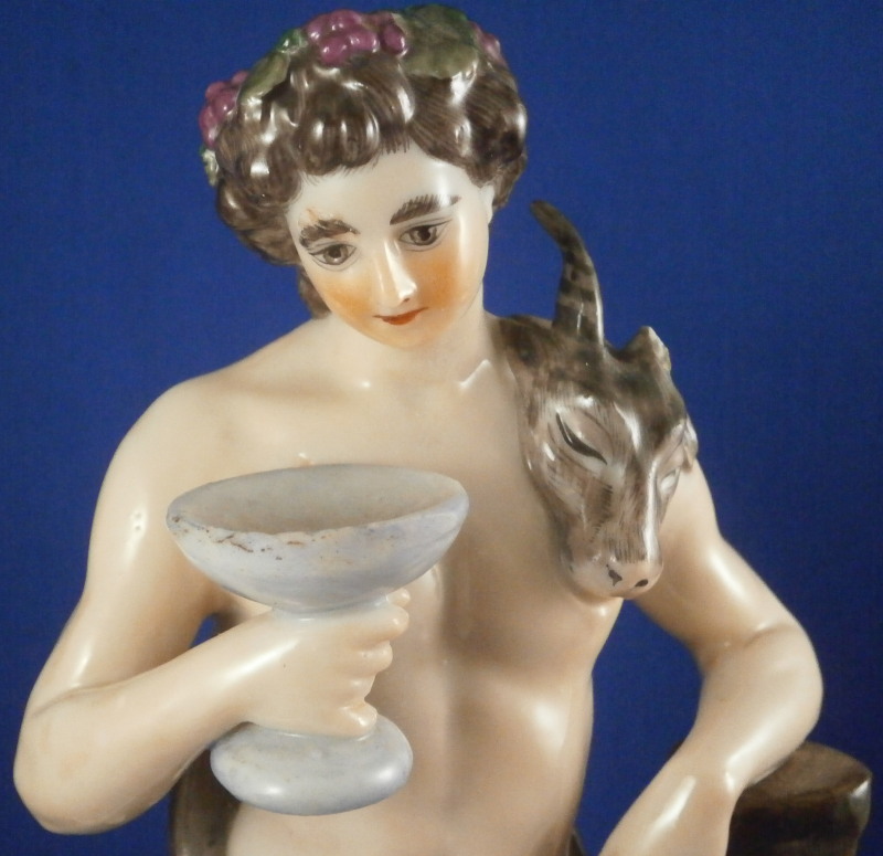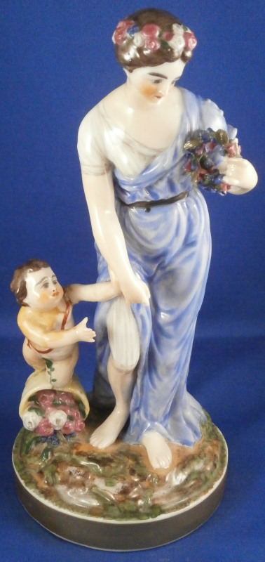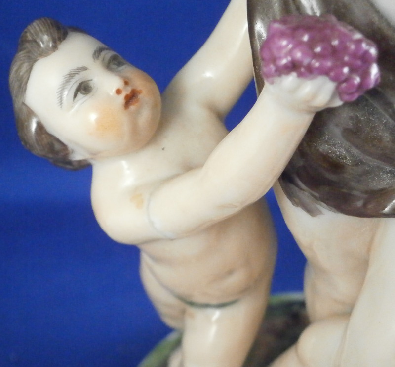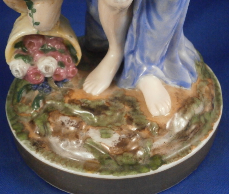 This is a rare set of four figurines depicting the four seasons made by Niderviller around 1800. Each figure depicts a scene typical of that season and is superbly modeled and painted typical of Niderviller. Winter is covering himself with a coat/blanket with a putto next to him doing the same and a fire in front of them. This figure is in superb condition with a small thin sliver of the back top edge of the base and whatever the putti is holding in his right hand is broken off at the bottom. A tiny paint flake on the edge of the coat right above his hair. The fall figurine is of bacchus holding a large chalice while wearing a goat skin with a putto next to him passing a bunch of grapes to him. The one horn of the goat's head is missing, the chalice's front edge is a little uneven though I think this is from when the piece was made and the right arm of the putto was broken off and reattached. The spring figurine is of a lady holding a floral wreath with a putto next to her kneeling on a flower basket that has fallen over and flowers are spilling out of it. The piece has a small chip to the floral wreath and the putto broke off the top of the basket with a break in his left should. There is discolored over painting to his back and roughness so I think he used to be a cherub with wings. The overpainting could easily be removed which would make it look much better. Displays fine as is since most of the issues are on the backside. And lastly the summer figurine which is in thw worst shape though most of it seems to be because the restorer went over board and overpainted all the extremities to blend in with the restored spots. This pieces needs to immersed in a solvent to take it all off. The damage I can truly figure out is the neck of the putto has a break in it, the lady''s left shoulder and wrist have breaks in them with the sickle in her hand replaced with a metal one. The only other damage that might be there is a break in her neck but I do not see any evidence of that though all that paint could hide it. None of the pieces are marked except for this piece which has an incised No. 13 or something along those lines to the underside. The damage that there is is easily made up by the fact that all four figures are present which is really neat. The figures are about 8.75 inches tall with the base having a diameter of about 4 inches. Please email me for more information or other pictures.