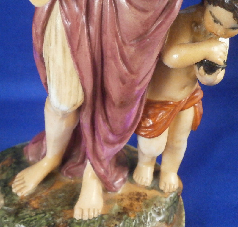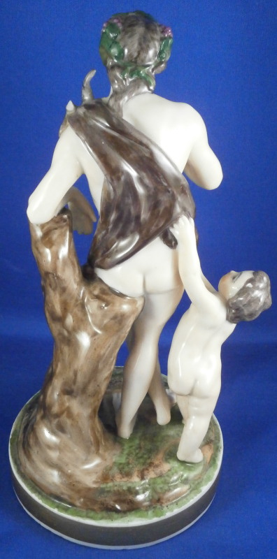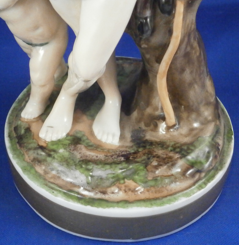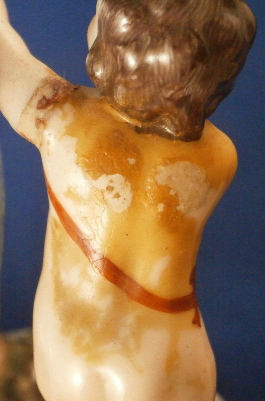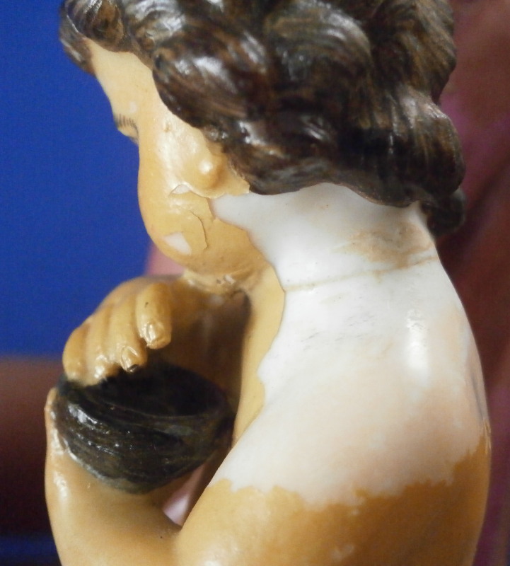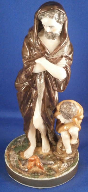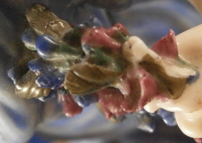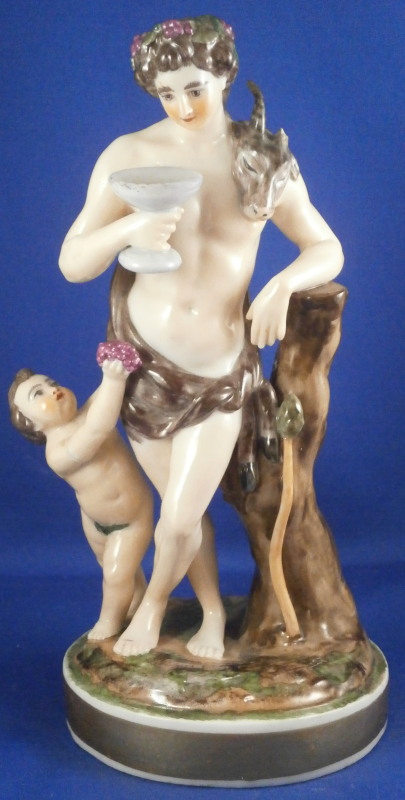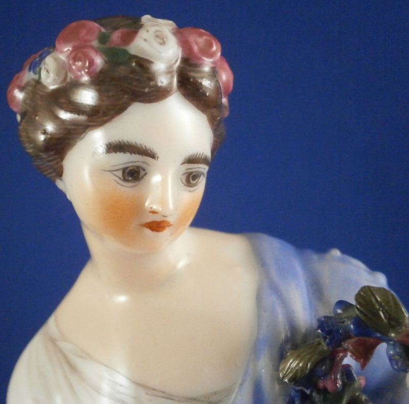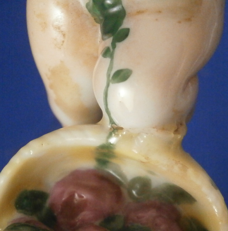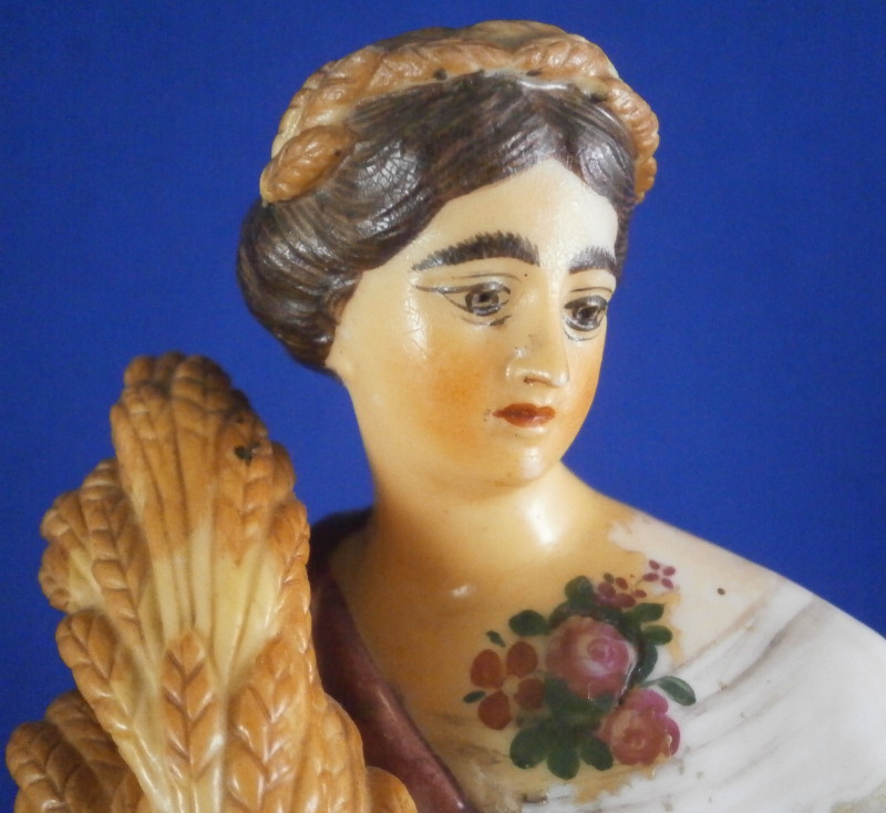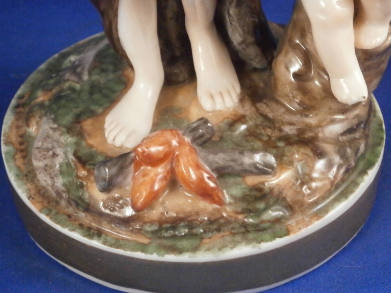 This is a rare set of four figurines depicting the four seasons made by Niderviller around 1800. Each figure depicts a scene typical of that season and is superbly modeled and painted typical of Niderviller. Winter is covering himself with a coat/blanket with a putto next to him doing the same and a fire in front of them. This figure is in superb condition with a small thin sliver of the back top edge of the base and whatever the putti is holding in his right hand is broken off at the bottom. A tiny paint flake on the edge of the coat right above his hair. The fall figurine is of bacchus holding a large chalice while wearing a goat skin with a putto next to him passing a bunch of grapes to him. The one horn of the goat's head is missing, the chalice's front edge is a little uneven though I think this is from when the piece was made and the right arm of the putto was broken off and reattached. The spring figurine is of a lady holding a floral wreath with a putto next to her kneeling on a flower basket that has fallen over and flowers are spilling out of it. The piece has a small chip to the floral wreath and the putto broke off the top of the basket with a break in his left should. There is discolored over painting to his back and roughness so I think he used to be a cherub with wings. The overpainting could easily be removed which would make it look much better. Displays fine as is since most of the issues are on the backside. And lastly the summer figurine which is in thw worst shape though most of it seems to be because the restorer went over board and overpainted all the extremities to blend in with the restored spots. This pieces needs to immersed in a solvent to take it all off. The damage I can truly figure out is the neck of the putto has a break in it, the lady''s left shoulder and wrist have breaks in them with the sickle in her hand replaced with a metal one. The only other damage that might be there is a break in her neck but I do not see any evidence of that though all that paint could hide it. None of the pieces are marked except for this piece which has an incised No. 13 or something along those lines to the underside. The damage that there is is easily made up by the fact that all four figures are present which is really neat. The figures are about 8.75 inches tall with the base having a diameter of about 4 inches. Please email me for more information or other pictures.