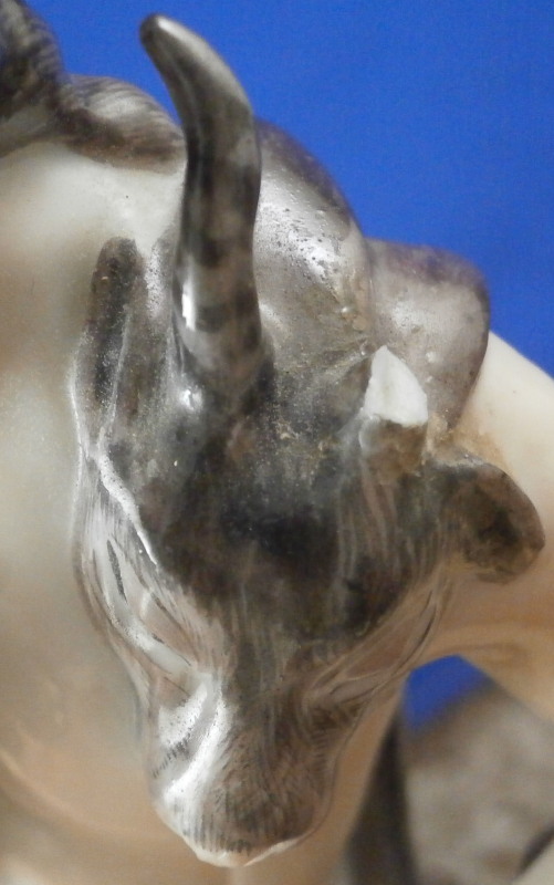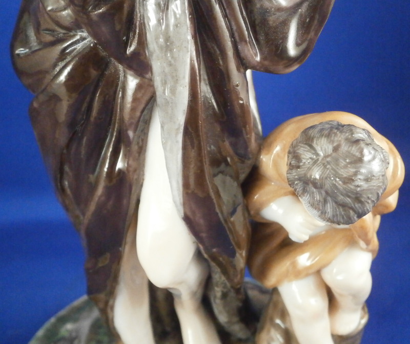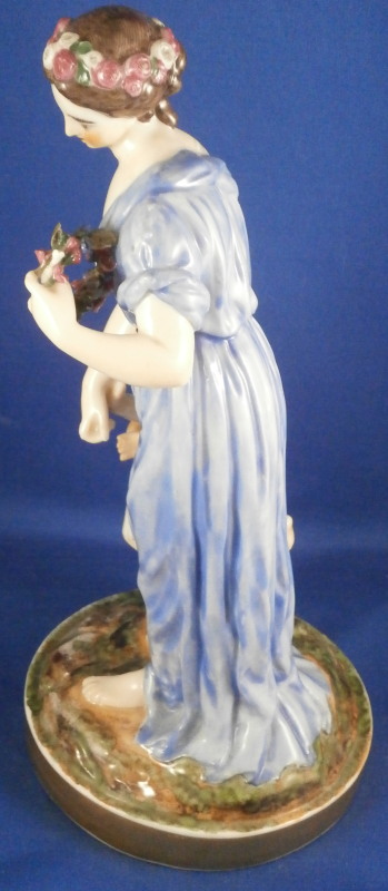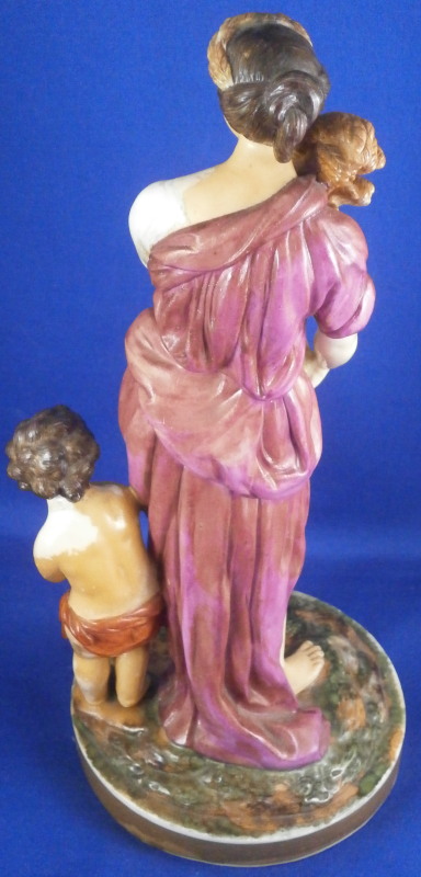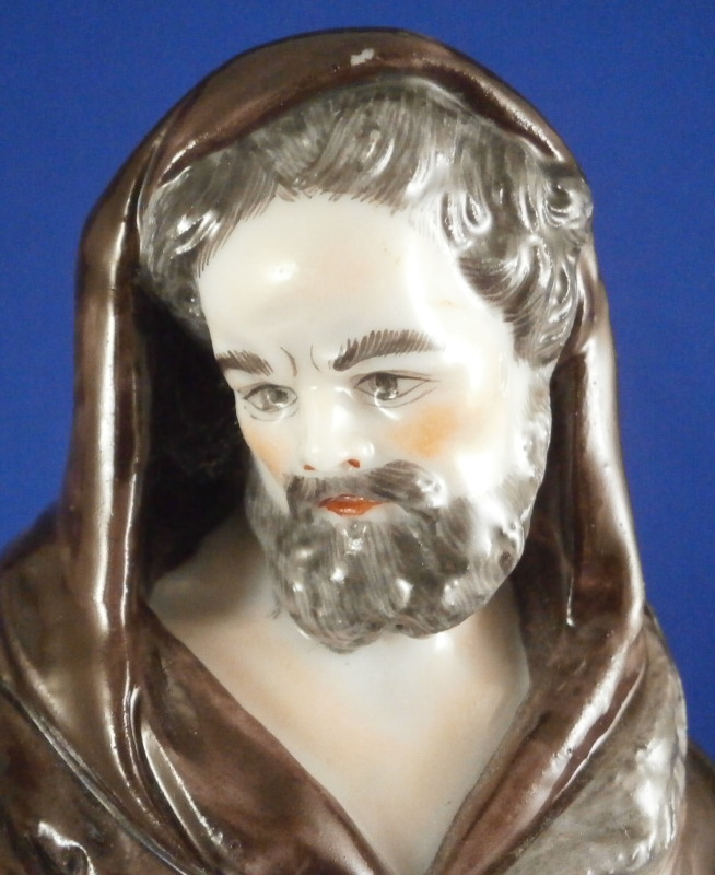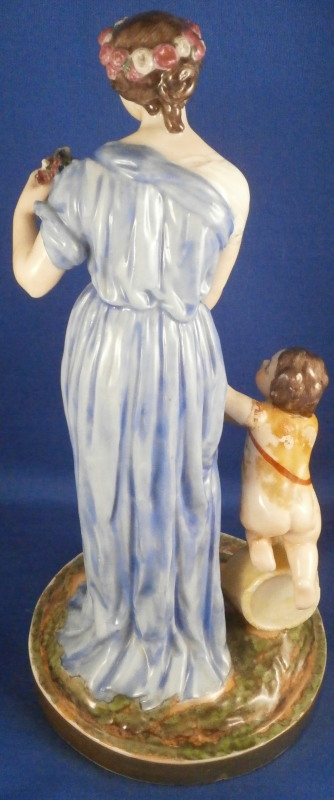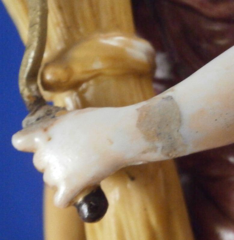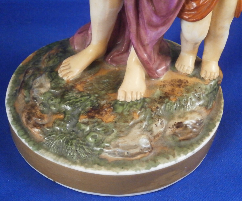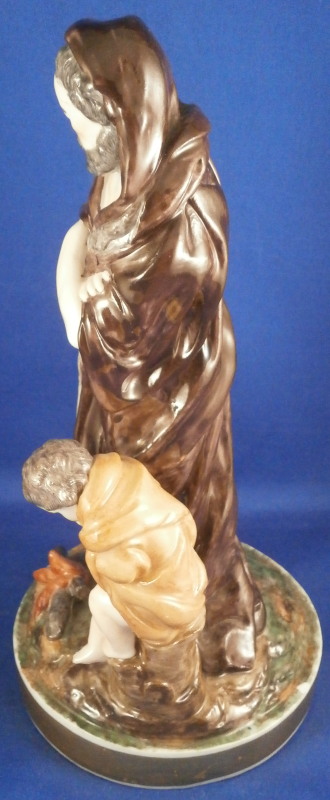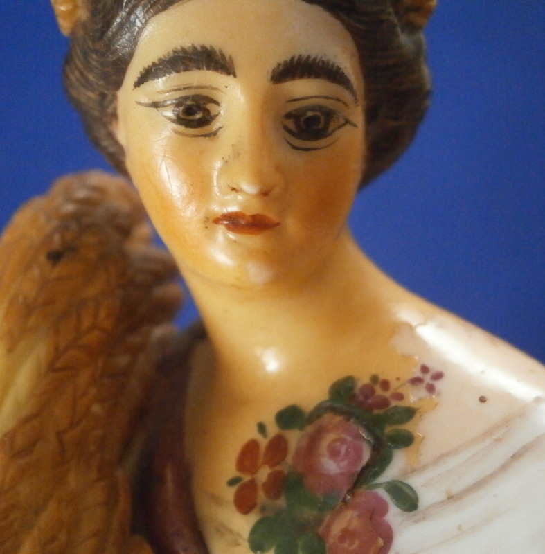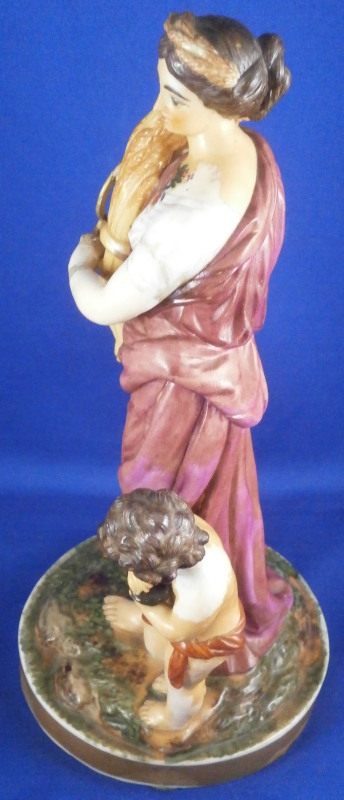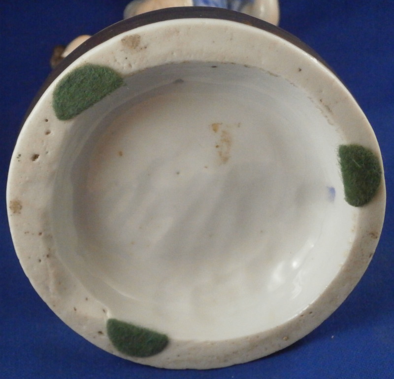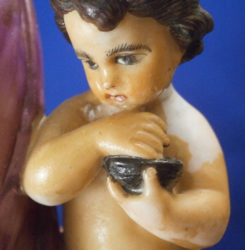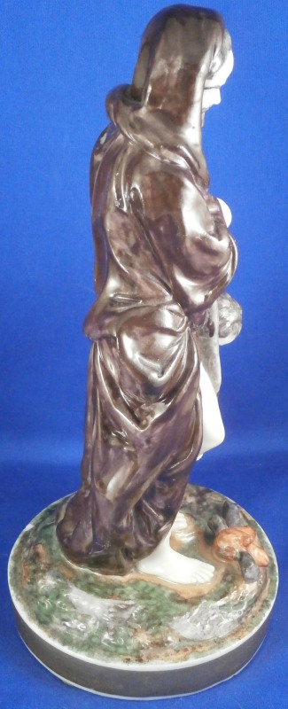 This is a rare set of four figurines depicting the four seasons made by Niderviller around 1800. Each figure depicts a scene typical of that season and is superbly modeled and painted typical of Niderviller. Winter is covering himself with a coat/blanket with a putto next to him doing the same and a fire in front of them. This figure is in superb condition with a small thin sliver of the back top edge of the base and whatever the putti is holding in his right hand is broken off at the bottom. A tiny paint flake on the edge of the coat right above his hair. The fall figurine is of bacchus holding a large chalice while wearing a goat skin with a putto next to him passing a bunch of grapes to him. The one horn of the goat's head is missing, the chalice's front edge is a little uneven though I think this is from when the piece was made and the right arm of the putto was broken off and reattached. The spring figurine is of a lady holding a floral wreath with a putto next to her kneeling on a flower basket that has fallen over and flowers are spilling out of it. The piece has a small chip to the floral wreath and the putto broke off the top of the basket with a break in his left should. There is discolored over painting to his back and roughness so I think he used to be a cherub with wings. The overpainting could easily be removed which would make it look much better. Displays fine as is since most of the issues are on the backside. And lastly the summer figurine which is in thw worst shape though most of it seems to be because the restorer went over board and overpainted all the extremities to blend in with the restored spots. This pieces needs to immersed in a solvent to take it all off. The damage I can truly figure out is the neck of the putto has a break in it, the lady''s left shoulder and wrist have breaks in them with the sickle in her hand replaced with a metal one. The only other damage that might be there is a break in her neck but I do not see any evidence of that though all that paint could hide it. None of the pieces are marked except for this piece which has an incised No. 13 or something along those lines to the underside. The damage that there is is easily made up by the fact that all four figures are present which is really neat. The figures are about 8.75 inches tall with the base having a diameter of about 4 inches. Please email me for more information or other pictures.