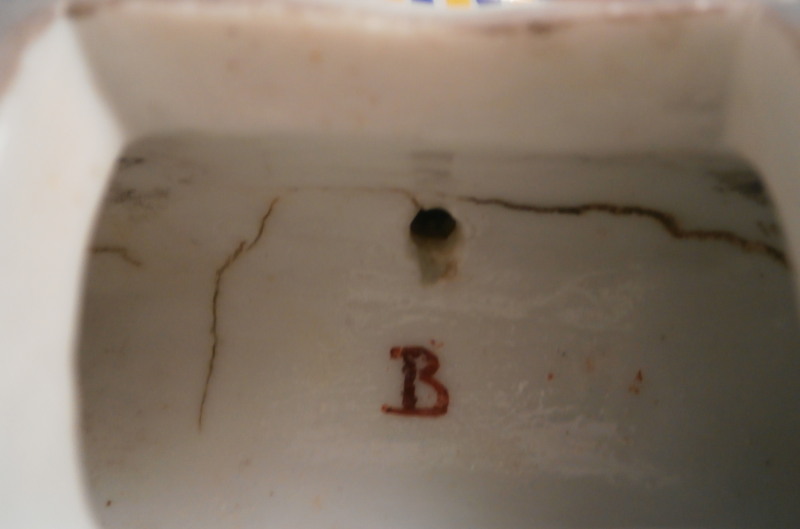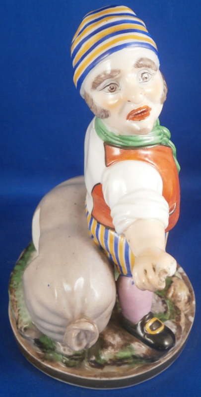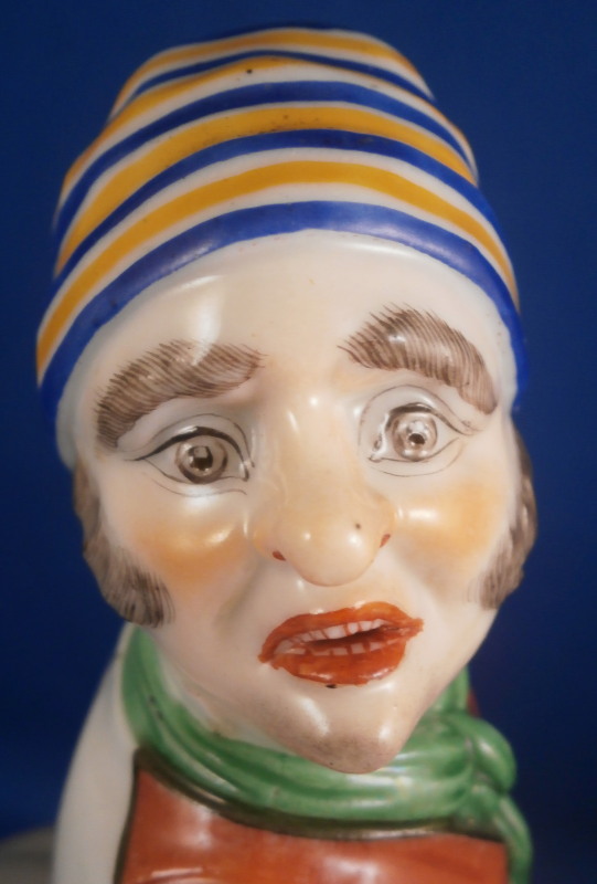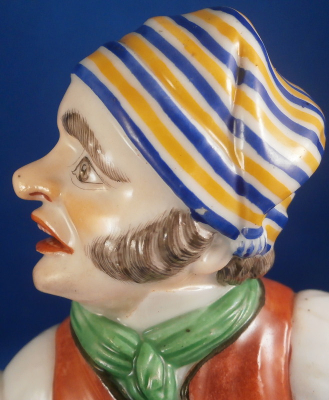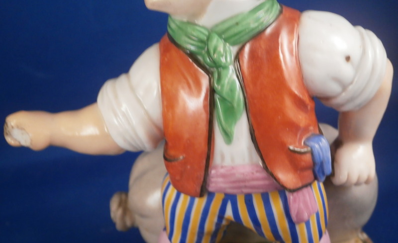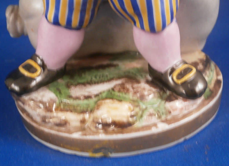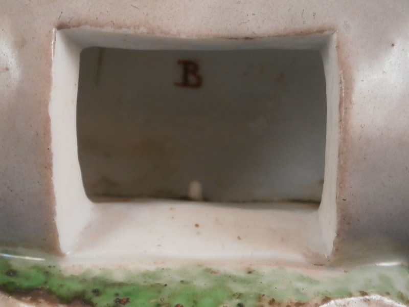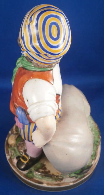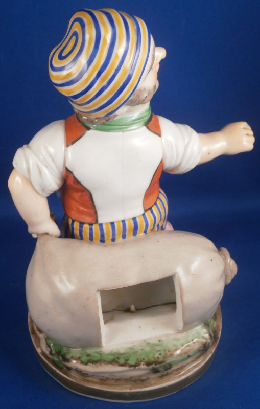 This is a fun piece - a figural pastille or incense burner made by Niderviller around 1800. The figure is of a gentleman - reminds me a bit of a sailor - with his bag behind him. The figure is dressed nicely and standing on the typical rock work base with the gold trim around the edge. Quite typical for this maker. The incense part can be seen from the back where there is an opening in his bag with a little pin on the bottom to stick the pastille. There is a hole inside to the right that goes up into the figurine and out of his mouth. These types of burners were used around this time since house and places often smelled quite badly and the incense was used to cover it up a bit. It is rare to find a figural one and I have never seen one by this maker. Really quite nice and I have his matching lady as well. The piece is in great condition with the right hand having some damage and a couple of chips around the base as shown and some firing cracks inside the bag or they might be result of use but they do not go through the outside. It displays well and is just a fun piece to have around. As is the case with most of their figurines the piece is unmarked except for a red letter B inside the bag as shown. The figure is 5.75 inches tall and the base has a diameter of 3.5 inches. Please email me for more information or other pictures.