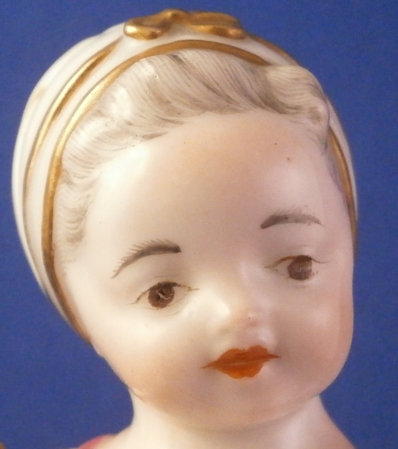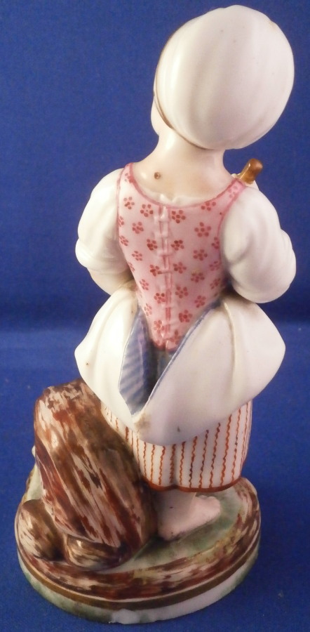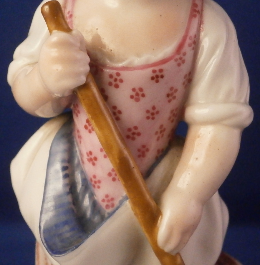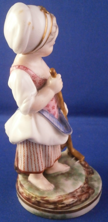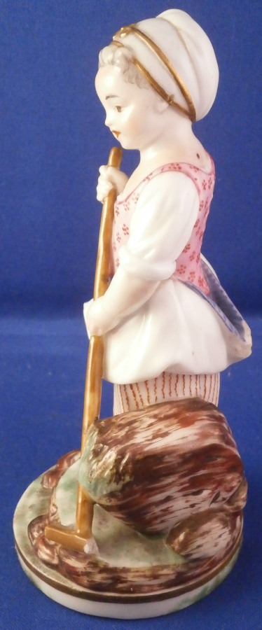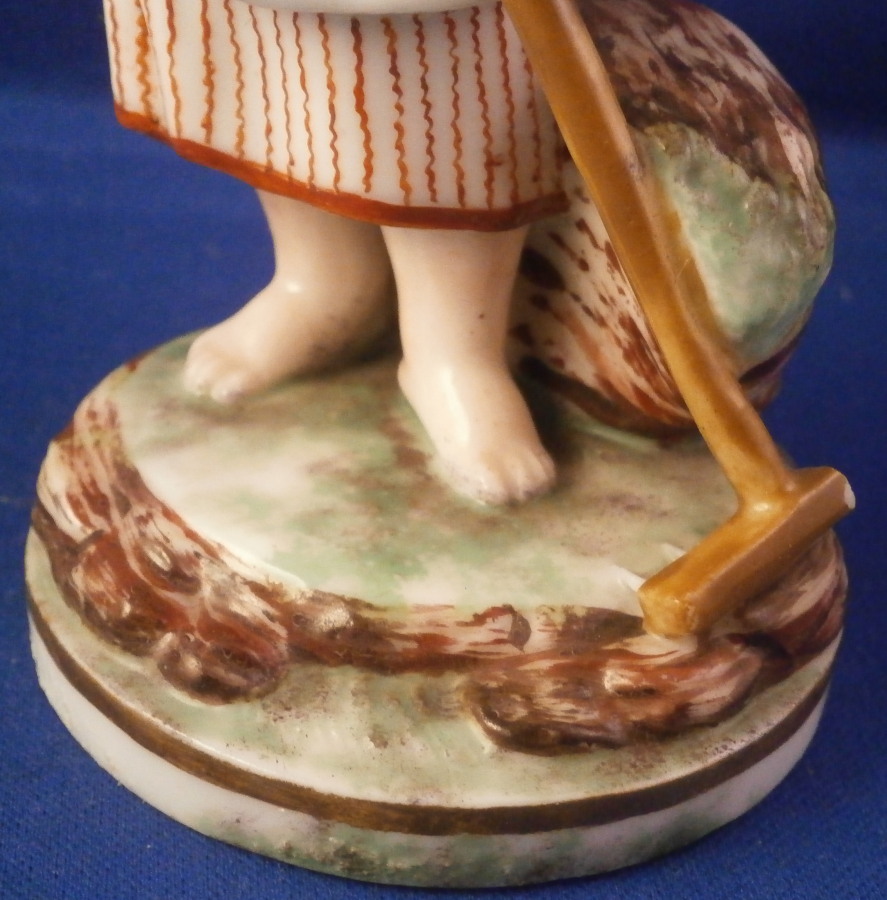This is a figurine of a girl doing some yard work made by Niderviller around 1800. She is dressed in a colorfull outfit, wearing a typical cap of the period on her head and holding a rake in her hands. Quite a cheery loooking piece and it reminds me of Hoechst pieces of this period. There is the typical rock work as well as the gold trim on the base. The figure is nicely modeled and hand painted. The figure is in great condition with the one side of the rake bottom missing, two chips along the bottom back base edge and a chip to the apron in the back as shown. She displays superbly as none of this is distracting. As is the case with most of their figurines she is unmarked. The piece is 5.5 inches tall and the base has a diameter of 2.5 inches. Please email me for more information or other pictures.