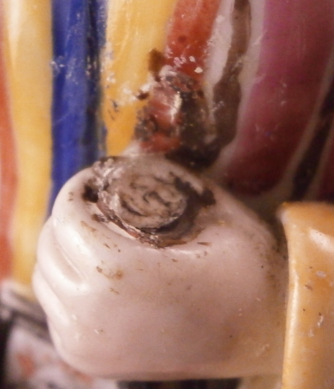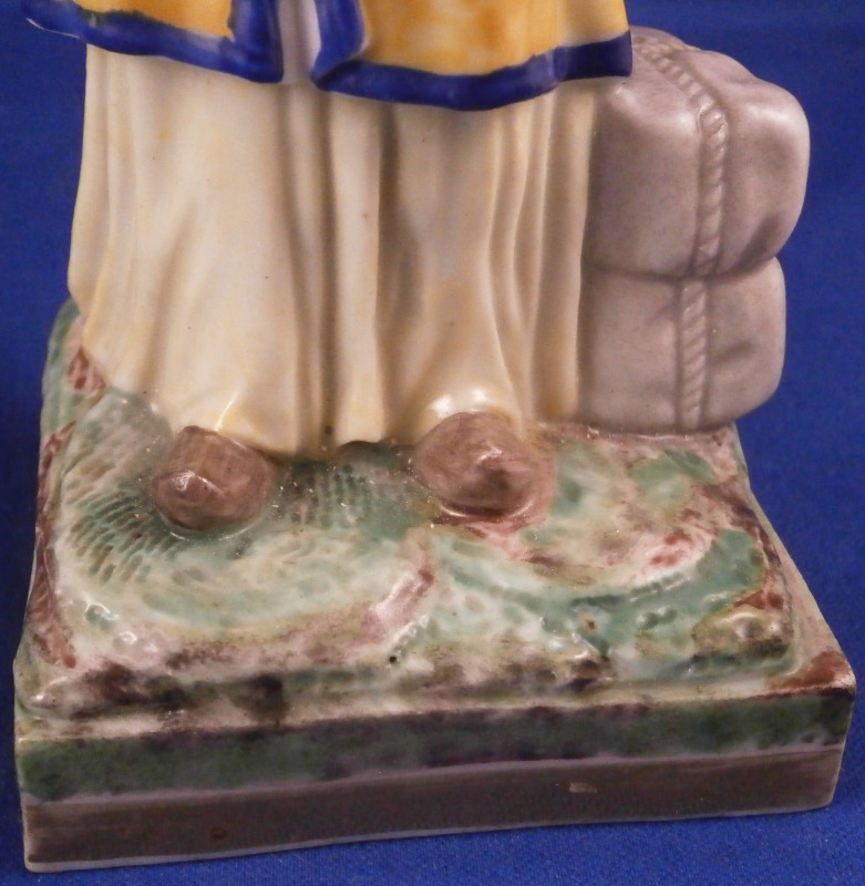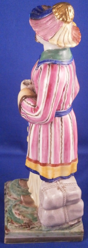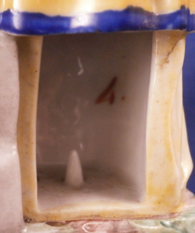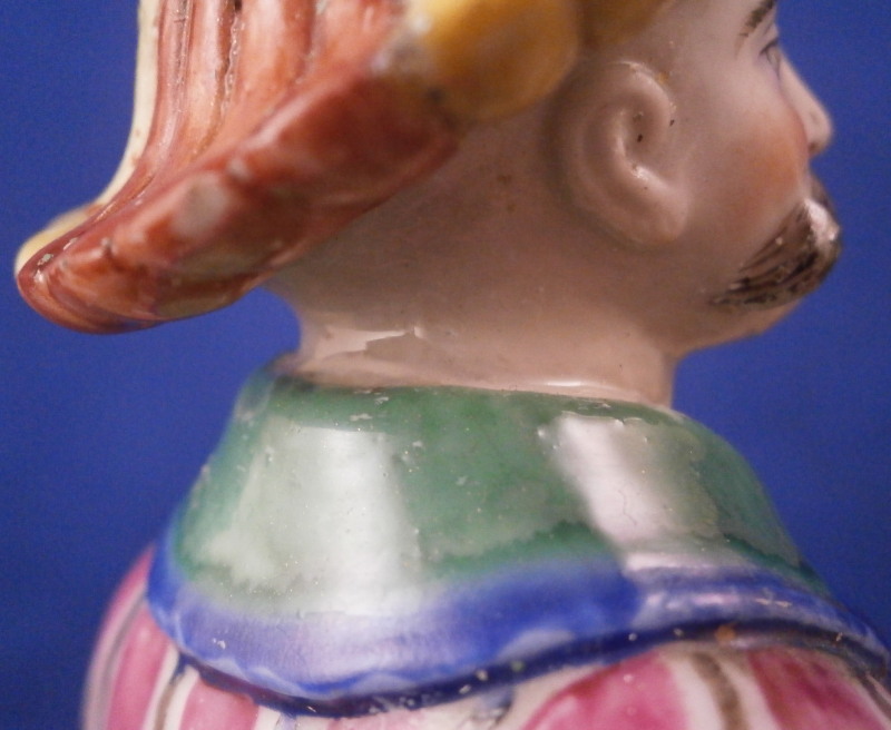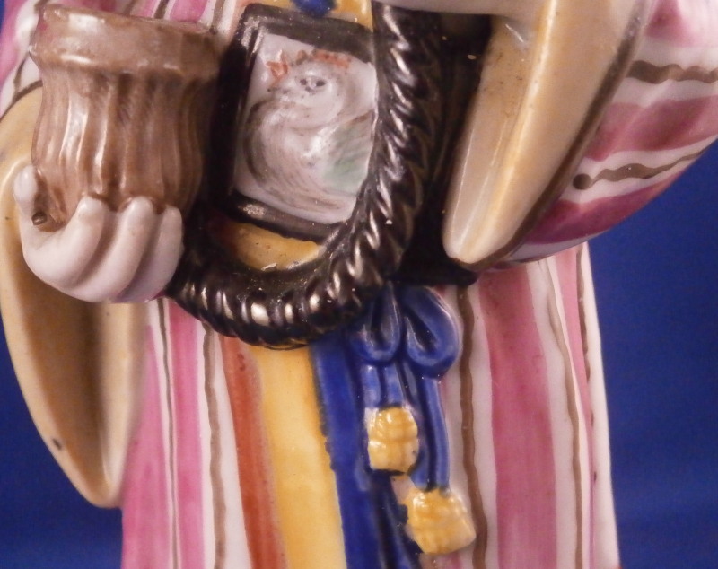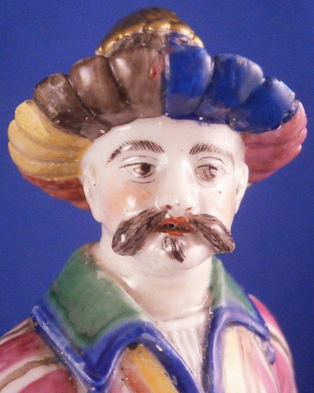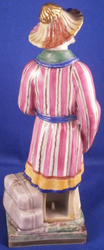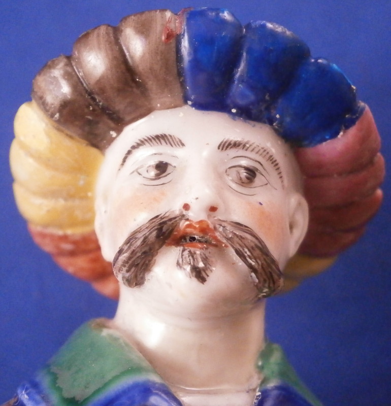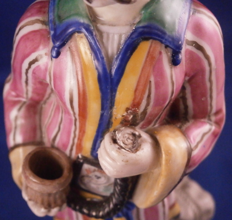 This is a fun piece - a figural pastille or incense burner made by Niderviller around 1800. The one here is of a gentleman figurine - presumably the husband of the matching lady figure I also have on the site. He is dressed in a Turkish / Ottoman Empire sort of dress with a hat covering his head while holding a pipe i both hands and a bundle of some sort by his feet on on a rock work base with the gold trim around the edge which is typical for this maker. From what I can see on the inside the smoke from the incense would come out of both the ipe bowl as well as a tiny hole in his mouth. The incense part can be seen from the back where there is an opening under his dress with a little pin on the bottom to stick the pastille on. These types of burners were used around this time since houses and places often smelled quite badly and the incense was used to cover it up a bit. It is rare to find a figural one and I had never seen one by this maker though now I own five of them after collecting them for a while. Really quite nice! The piece is in good condition with the mouth piece of the pipe in his left hand missing, some minor repairs ot his hat and I think his neck was broken at some point and repaired perfectly but it is impossible to tell. A superb job! He displays very well! As is the case with most of their figurines the piece is unmarked except for a red 4. inside the pastille burner opening. The figurine is 7.5 inches tall, 2.625 inches wide and 2.625 inches deep. Please email me for more information or other pictures.