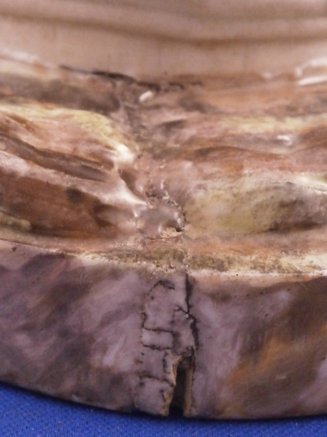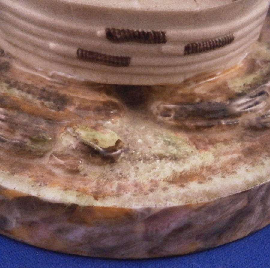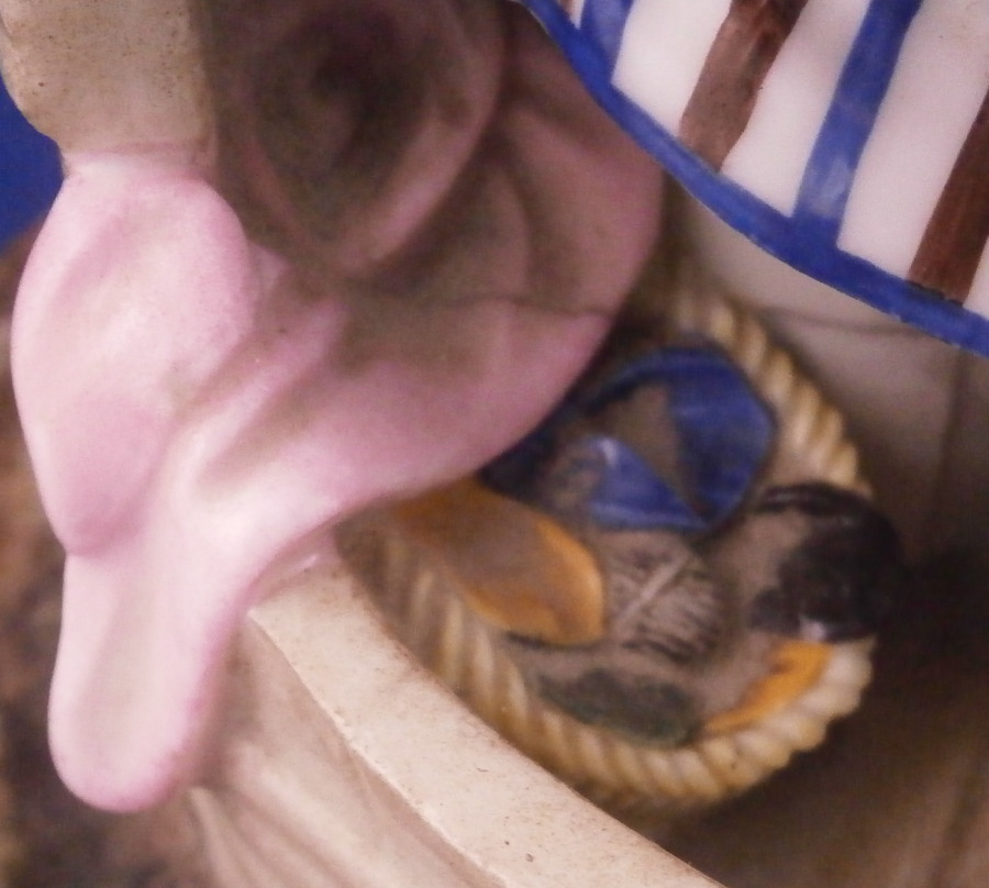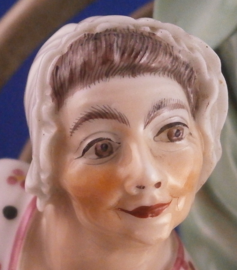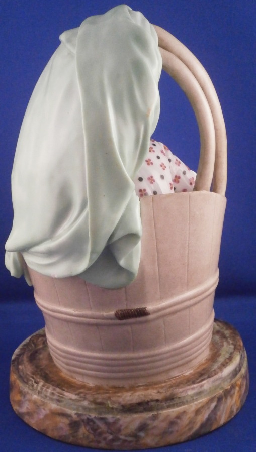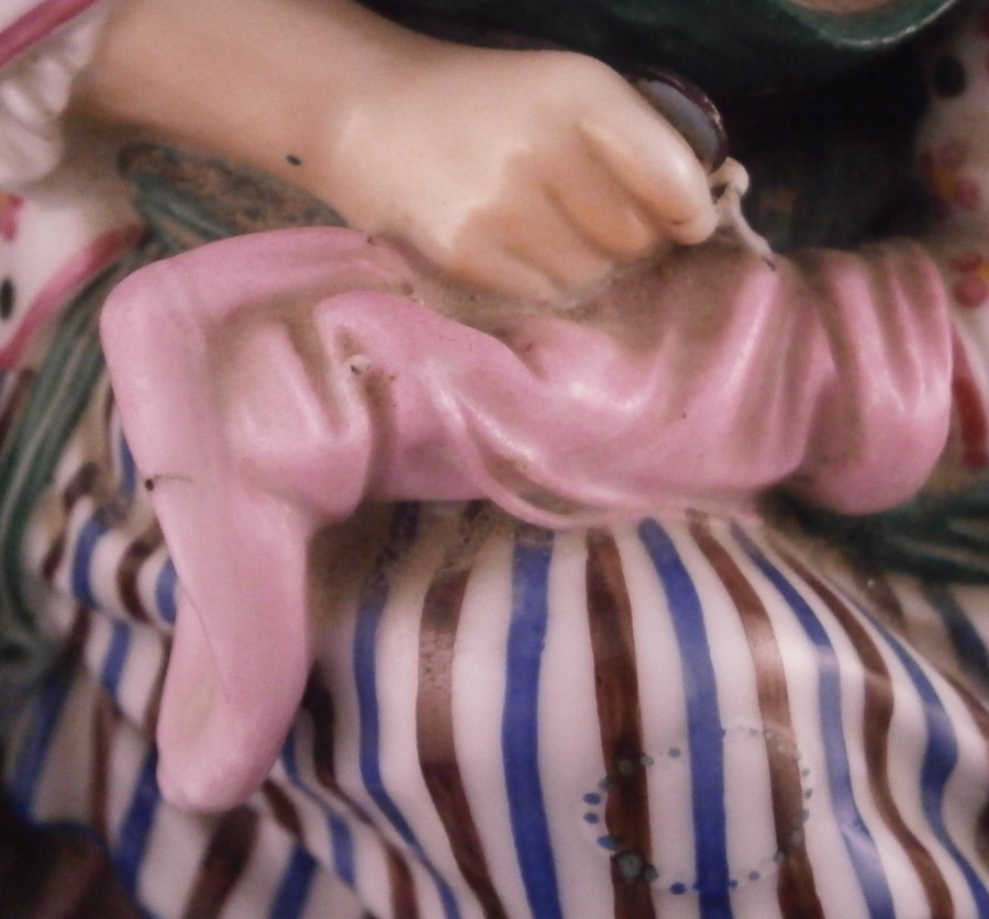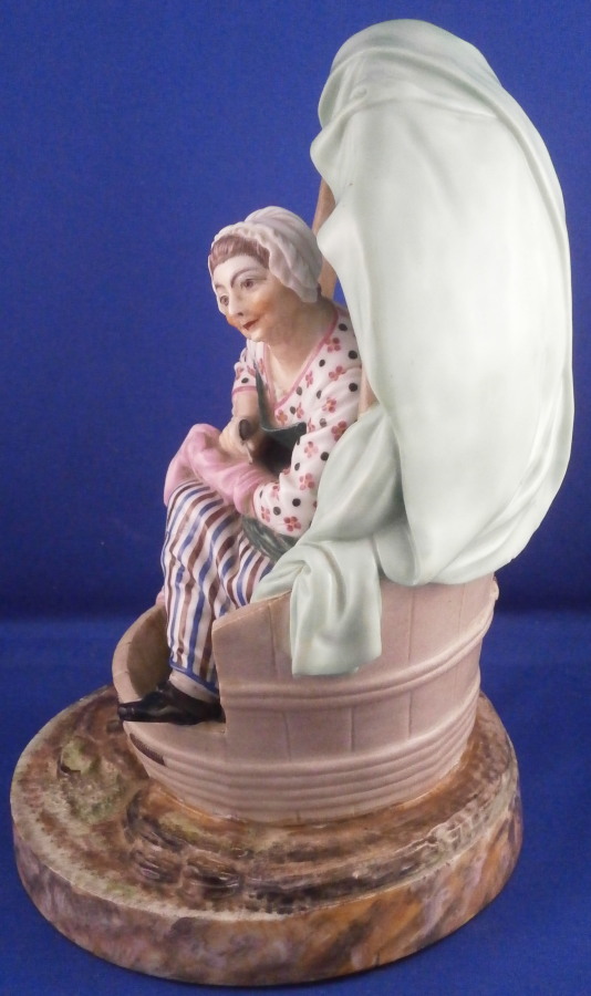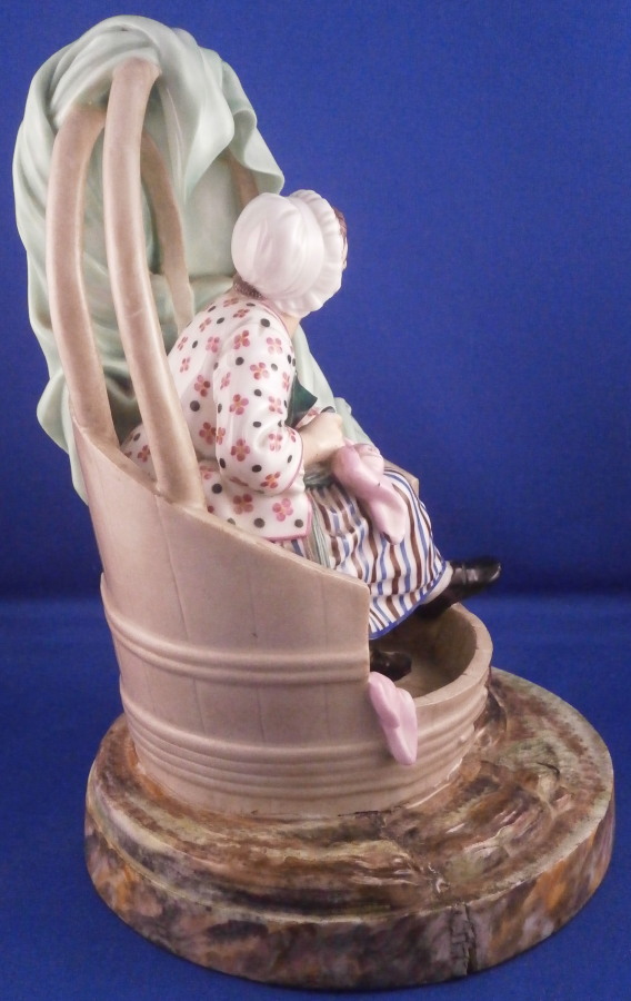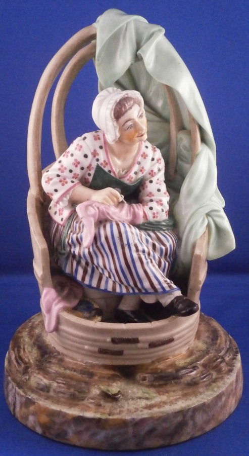 This is a superb figurine of a lady knitting made by Niderviller around 1800. The lady is dressed nicely and she is working on fixing a sock or stockings with a needle in her other hand. A basket by her feet filled with stuff and she is sitting in a cut out barrel or tub with a cloth wrapped around the top. Typical rock base! This model was copied for years by other French makers but this is the original one and quite hard to find. It is a large figure for this maker and with it come issues with the base which is normal. There is a large firing crack underneath that was filled and cracks around where the tub attaches. It was painted even on the underside and the base edge to blend it in better instead of simple having the gold edge and white underside more common to this maker. The figure is really well hand painted and the rock base and face are what gives it away as Niderviller. A very heavy piece as are all their figures! The piece displays perfectly and there areno other issues at all which is amazing since quite often the thin poles on the top are damaged or gone. As is the case with most of their figurines it is unmarked underneath. The piece is 9.25 inches tall and about 6.25 inches in diameter. Please email me for more information or other pictures.