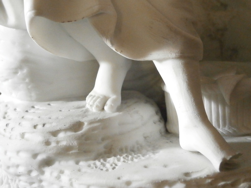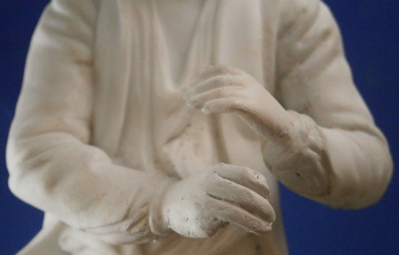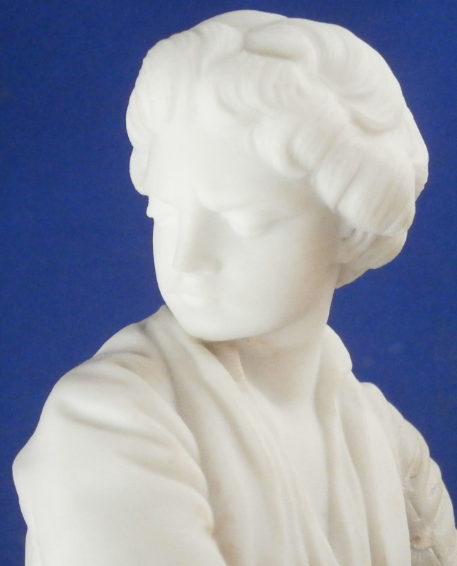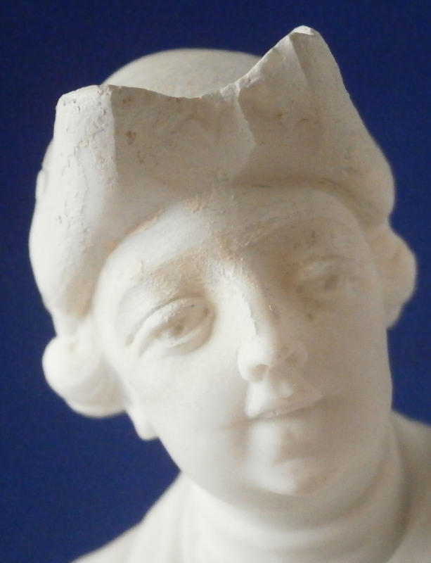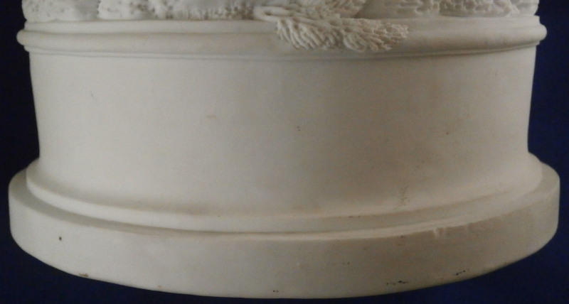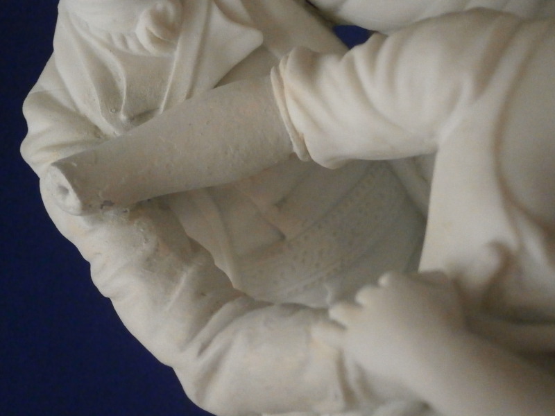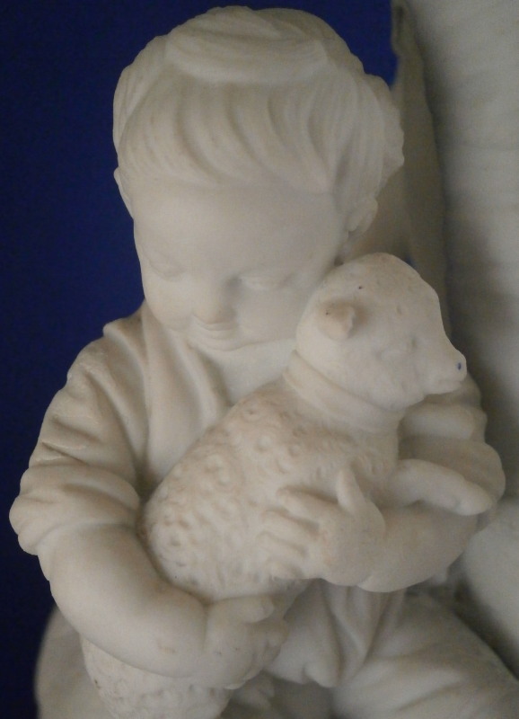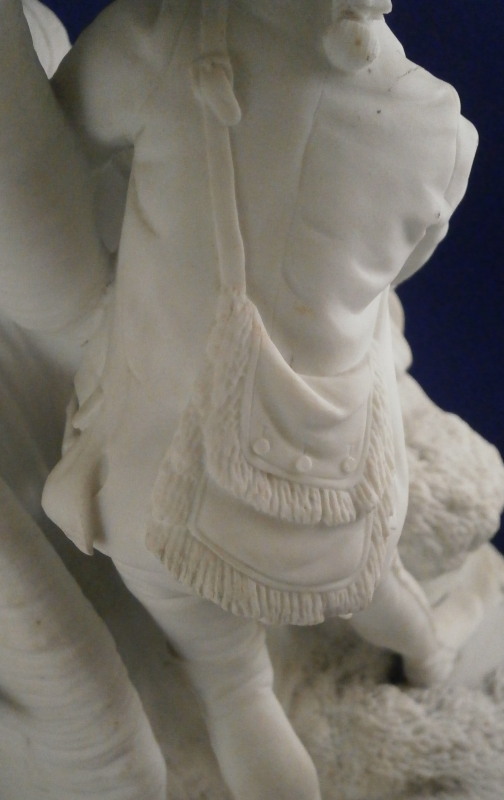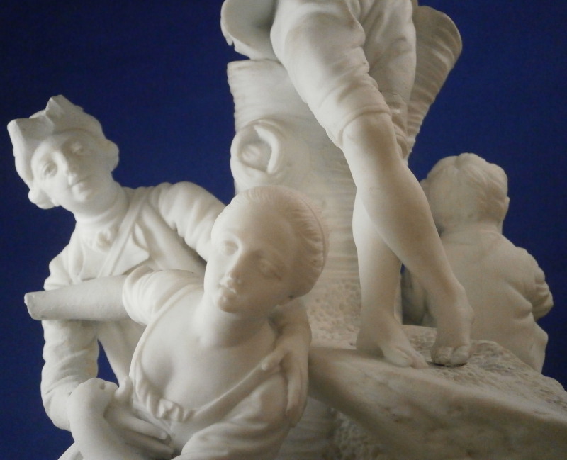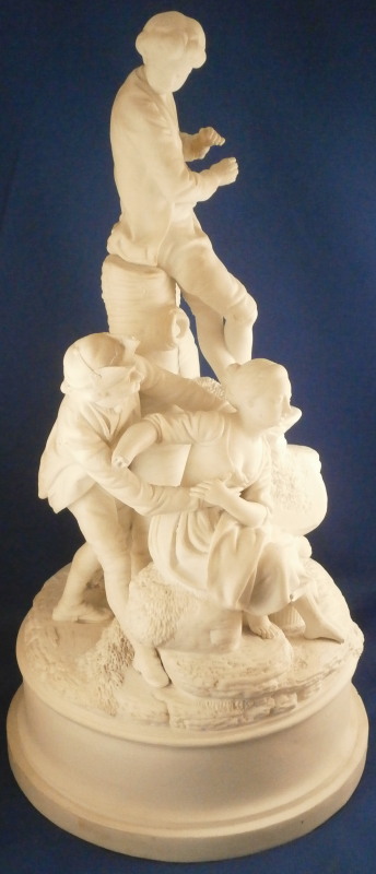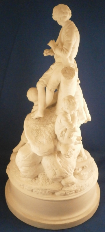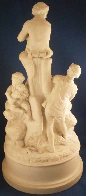 This is a superb large figurine made by Niderviller in the late 18th century. This is the type of figure they are famous for - the white biscuit, very detailed, fun pieces. The piece is of four figurines on a rocky base with a tree stump in the center. The top gentleman is leaning against the tree trunk and was probably holding a flute at some point, there is another gentleman standing behind a lady that is sitting on a rock ledge and a boy is sitting on the back side holding a sheep in his hands. There is a basket sitting next to the lady on the ground and there used to be what looks like a dog sitting on the backside but all that is left are the paws. The entire peice is standing on a large smooth base which gives it extra height and a nice finished look. Lots of amazing detail to this figurine! The figure displays nicely but has issues - the missing dog I already mentioned and the flute but also there has been work done to the man's hands and the tree trunk that ends right next to him is rough though that might be the way it was made. The gentlman that is behind the lady has had work done to his hat and the lady is missing her right hand and the tip of her foot. But it really still looks stunning on display. The piece is marked with the word Niderviller on a little plaque which is attached to the back top behind the gentleman on the ground but it is partially gone. One can still make out enough to figure out the maker though. The figure is a bit over 14 inches tall and the base has a diameter of just over 7 inches. It is quite a heavy piece! Please email me for more information or other pictures.