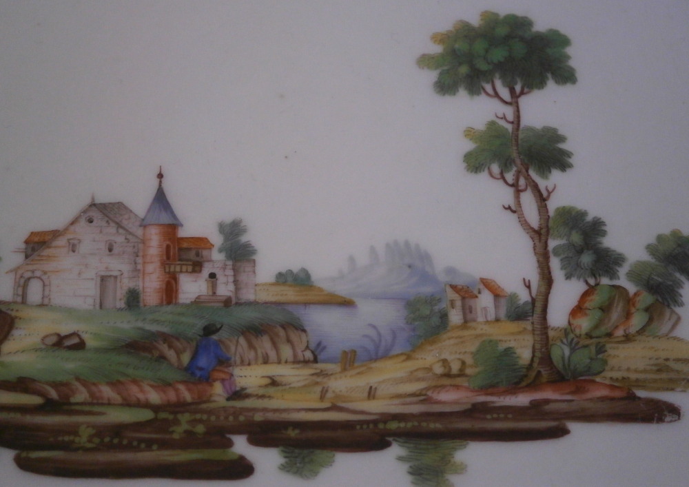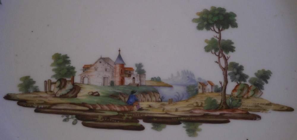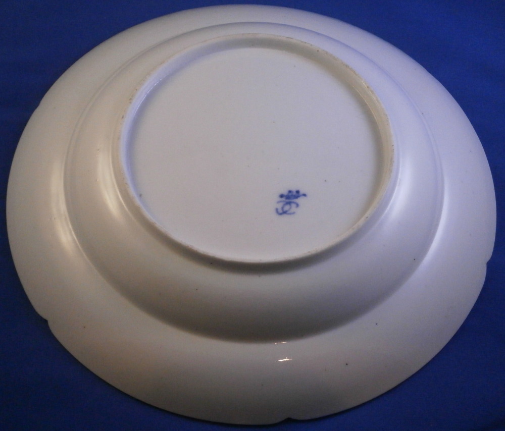 This is a superb and fairly early scenic plate made by Niderviller around 1775. It is hand painted with a superb scene in the center of a guy sitting on a rock ledge in a landscape backdrop. There is a house near him with another in the background as well as some water, smaller buildings and a large tree. I think the colors of their scenes are among the nicest in the porcelain world and the quality is superb! The rim has three single flowers to it and the edge has since indentations to it to give it that extra flair. The plate is marked with their under glaze blue CC mark under a crown for the Count Custine period I believe was from 1770 until 1784. There is also an incised mark as shown. The piece is 1.625 inches tall and 9.75 inches in diameter. The plate is in great condition with some manufacturing spots as well as a firing line along the edge as shown. It was covered by some design on the frot side and filled from the back side at the factory. These things are not considered damage but manufacturing flaws. It displays perfectly! Please email me for more information or other pictures.